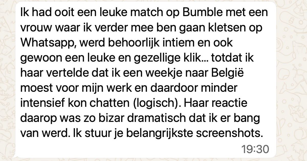 Man heeft 2 weken gezellig contact met een match van Bumble maar als hij vertelt dat hij 5 dagen voor zijn werk naar Brussel moet en daardoor minder goed bereikbaar is breekt plotseling de pleuris uit (4 screens)