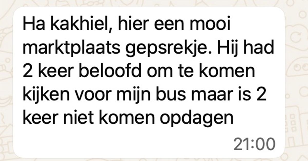 Meneer durft niet af te spreken met iemand van Marktplaats omdat ie bang is dat ie met een geslepen crimineel of oplichter te maken heeft. 'Je hoort de gekste dingen tegenwoordig' (10 screens)