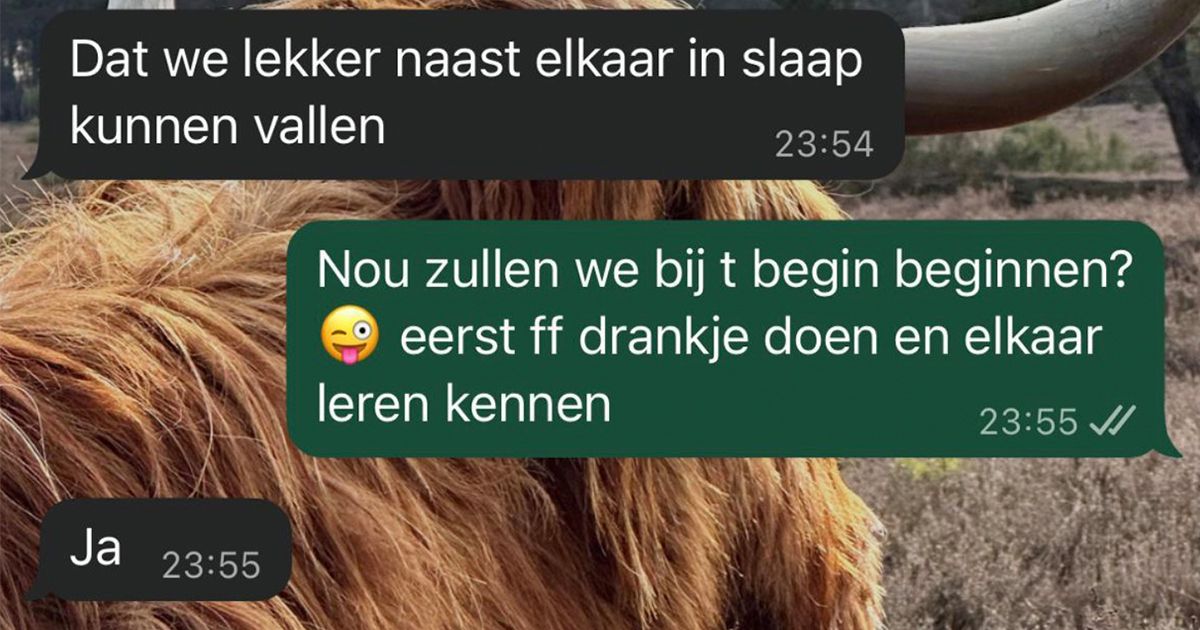 Man wil heel graag z.s.m. 'lekker samen wakker worden' met een online date die hij nog nooit in het echt ontmoet heeft, zijn aanpak is alleen niet echt tactisch (6 screens)