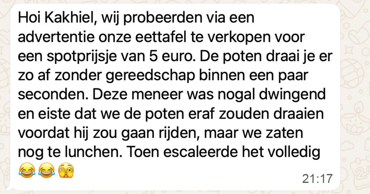 Man met kort lontje heeft interesse in een tweedehands eettafel van 5 euro maar is tijdens het maken van een afspraak nogal dwingend in zijn communicatie (4 screens)