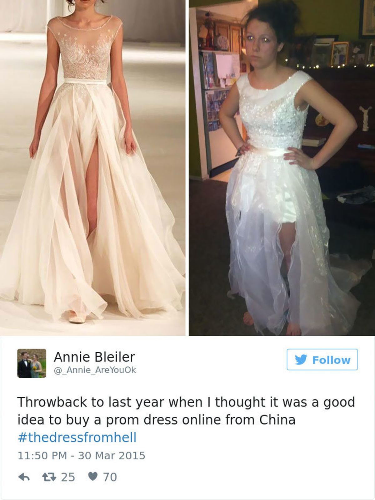 Hoi, hier 15 foto's van meisjes die hun prom jurk online besteld hebben en dat 'ie toen ineens vet lelijk was in het echt haha: