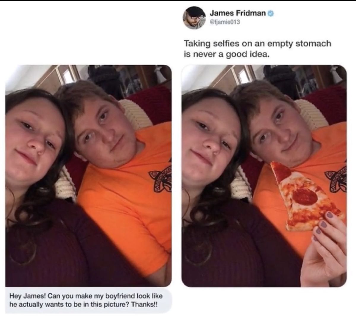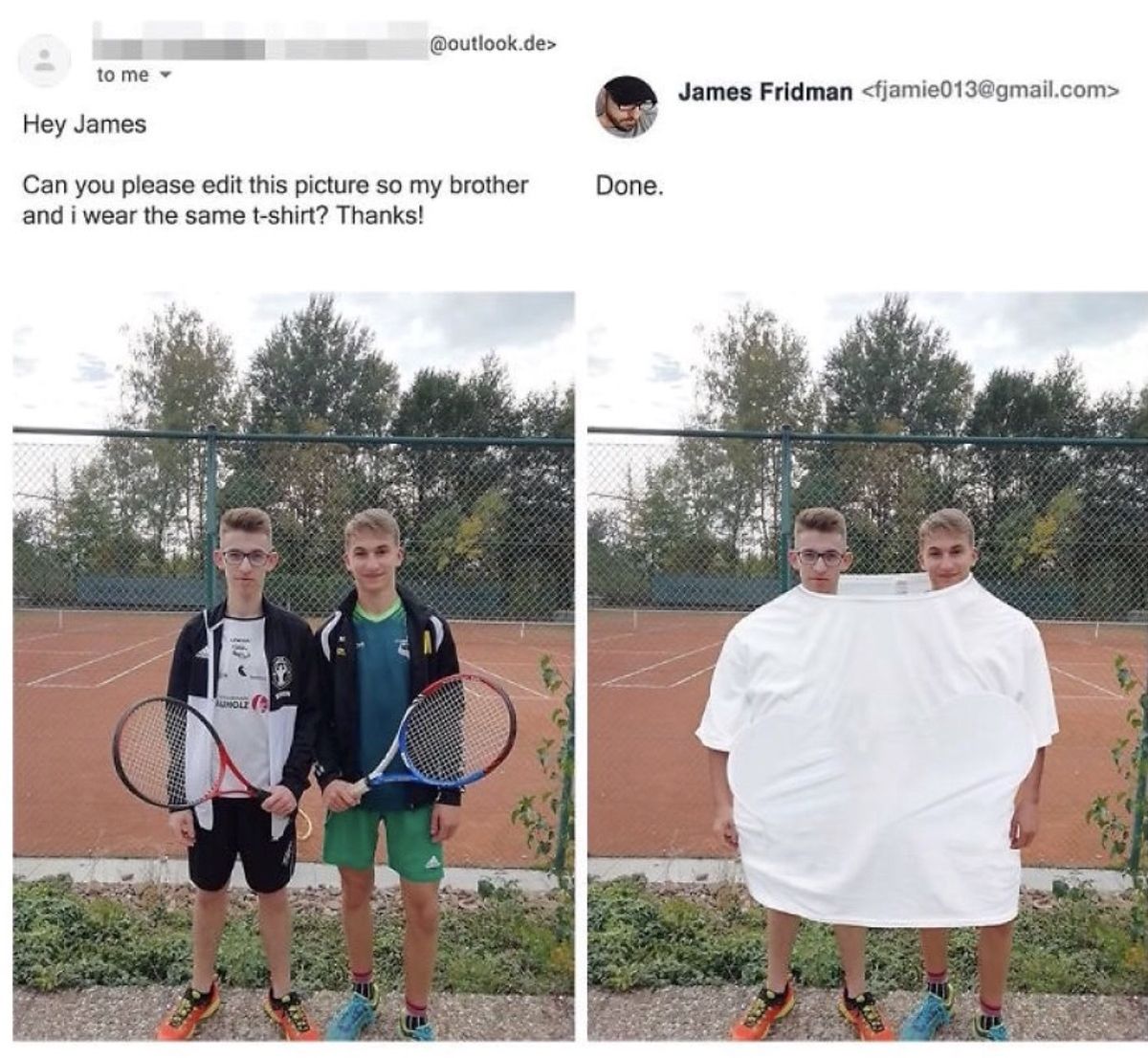 Hoi, hier 15 vet grappige Photoshop verzoekjes uitgewerkt door James Fridman: