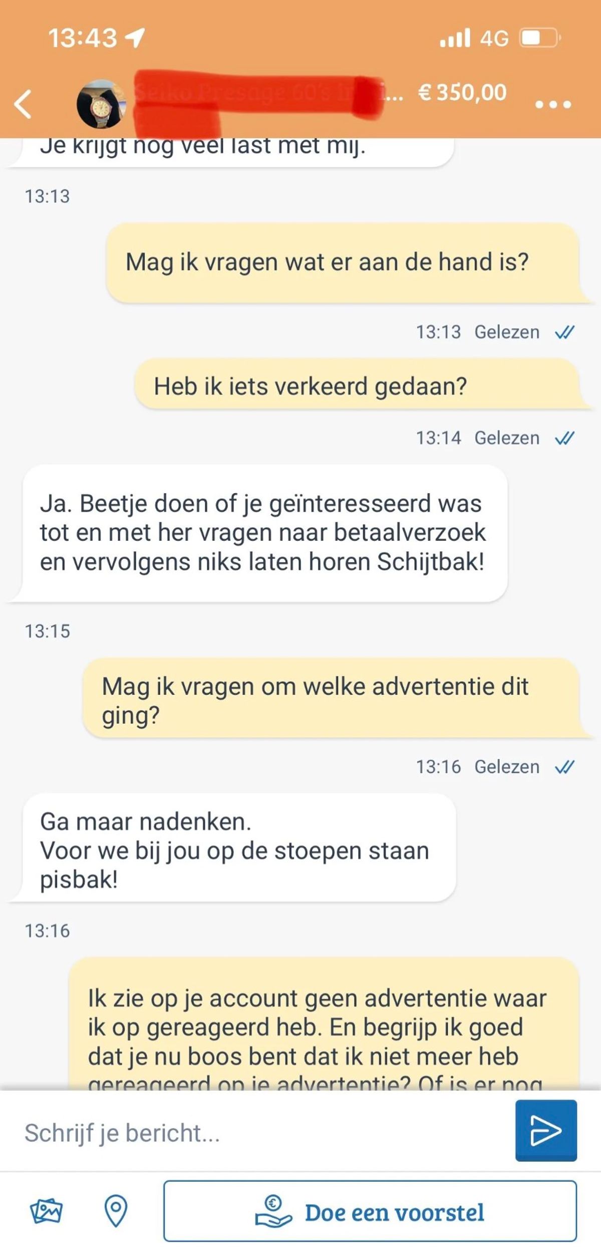 Deze man op Marktplaats is al 1,5 maand woedend op iemand die interesse had in een horloge maar na het betaalverzoek niks meer had laten horen (5 screens)