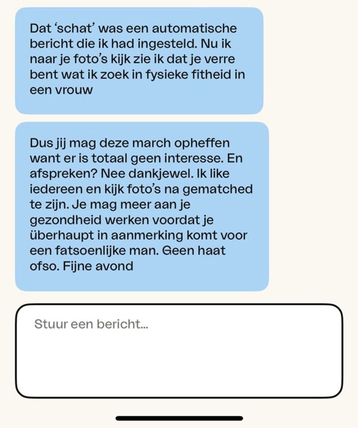 Dit is de enige juiste tegenreactie op gasten die in dating-apps meteen ongevraagd foto's van hun lichaam beginnen te sturen (2 screens)