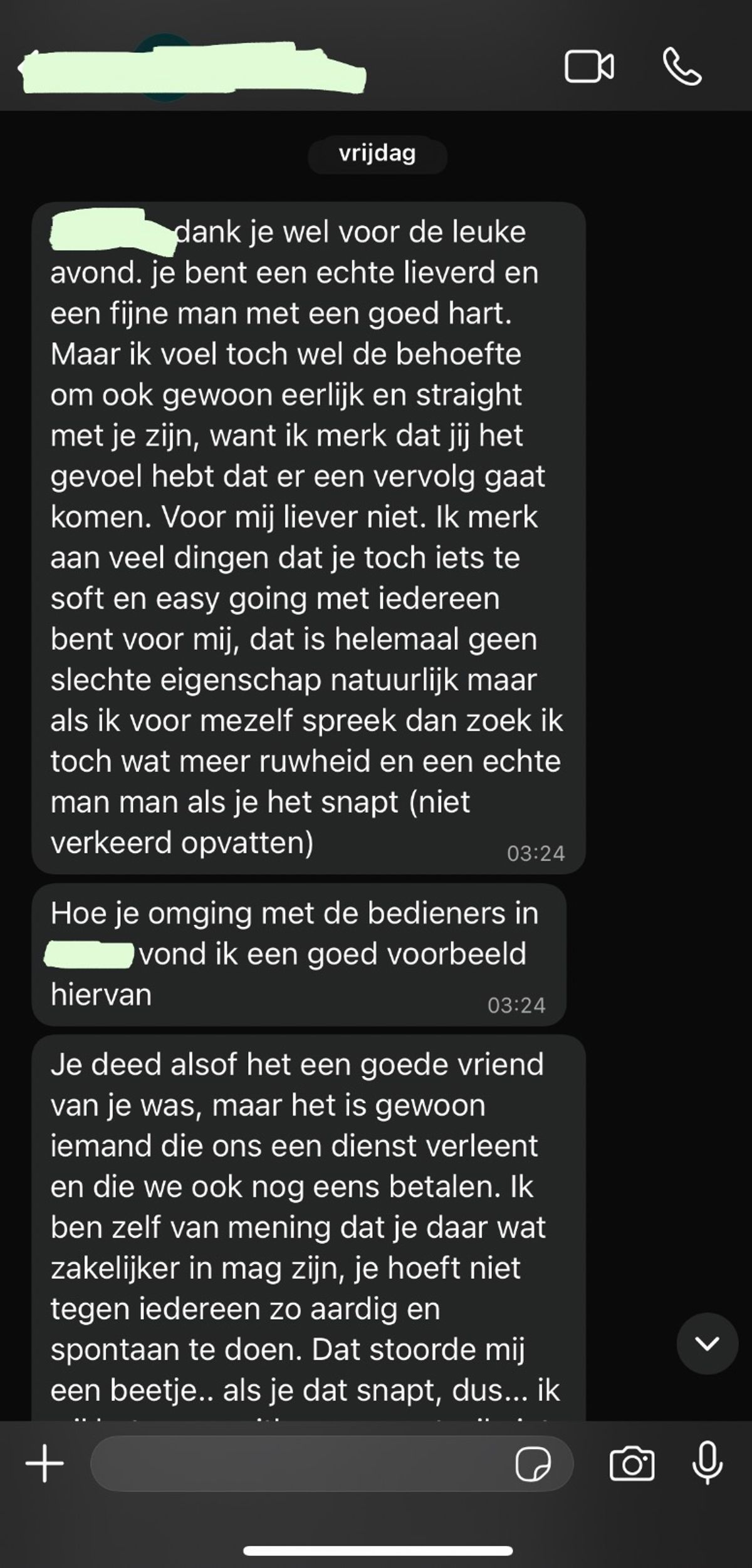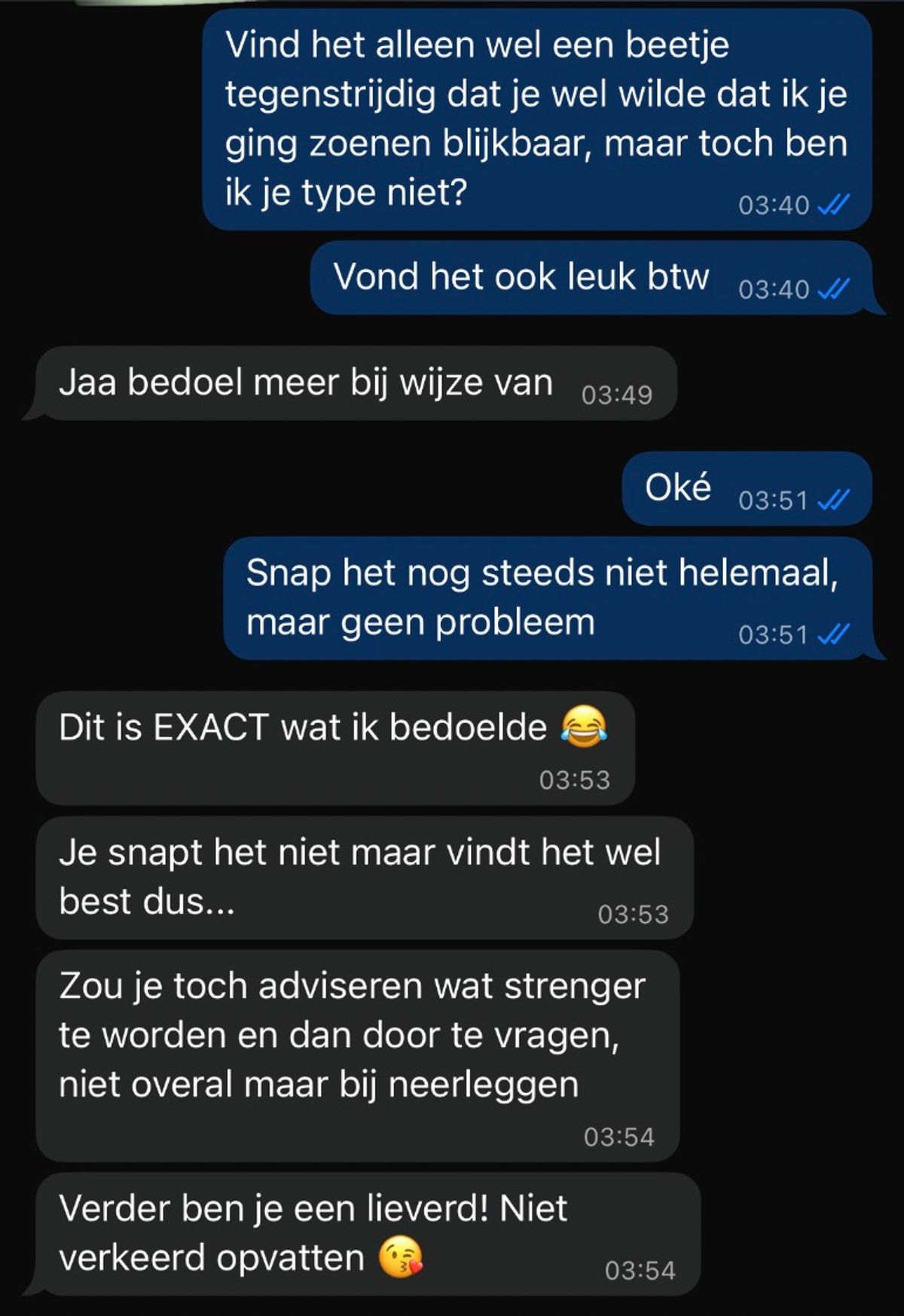 Vrouw heeft een leuke date met deze jongen gehad maar wil toch liever geen tweede keer afspreken omdat hij te aardig deed tegen de ober (4 screens)