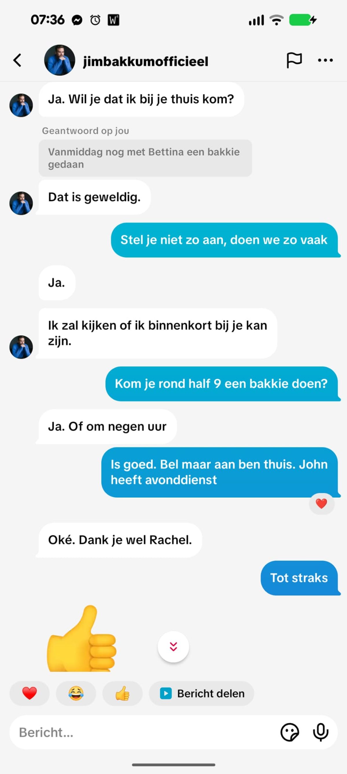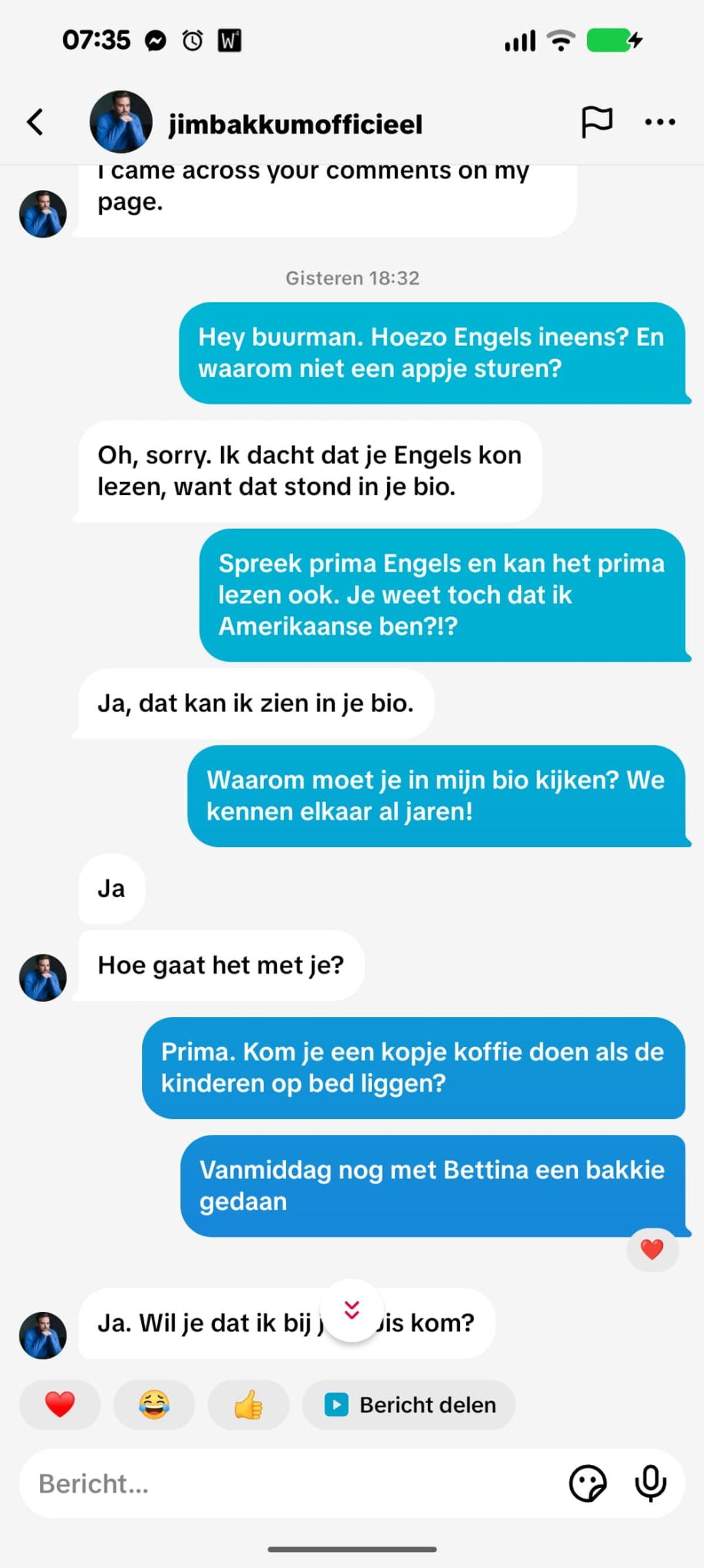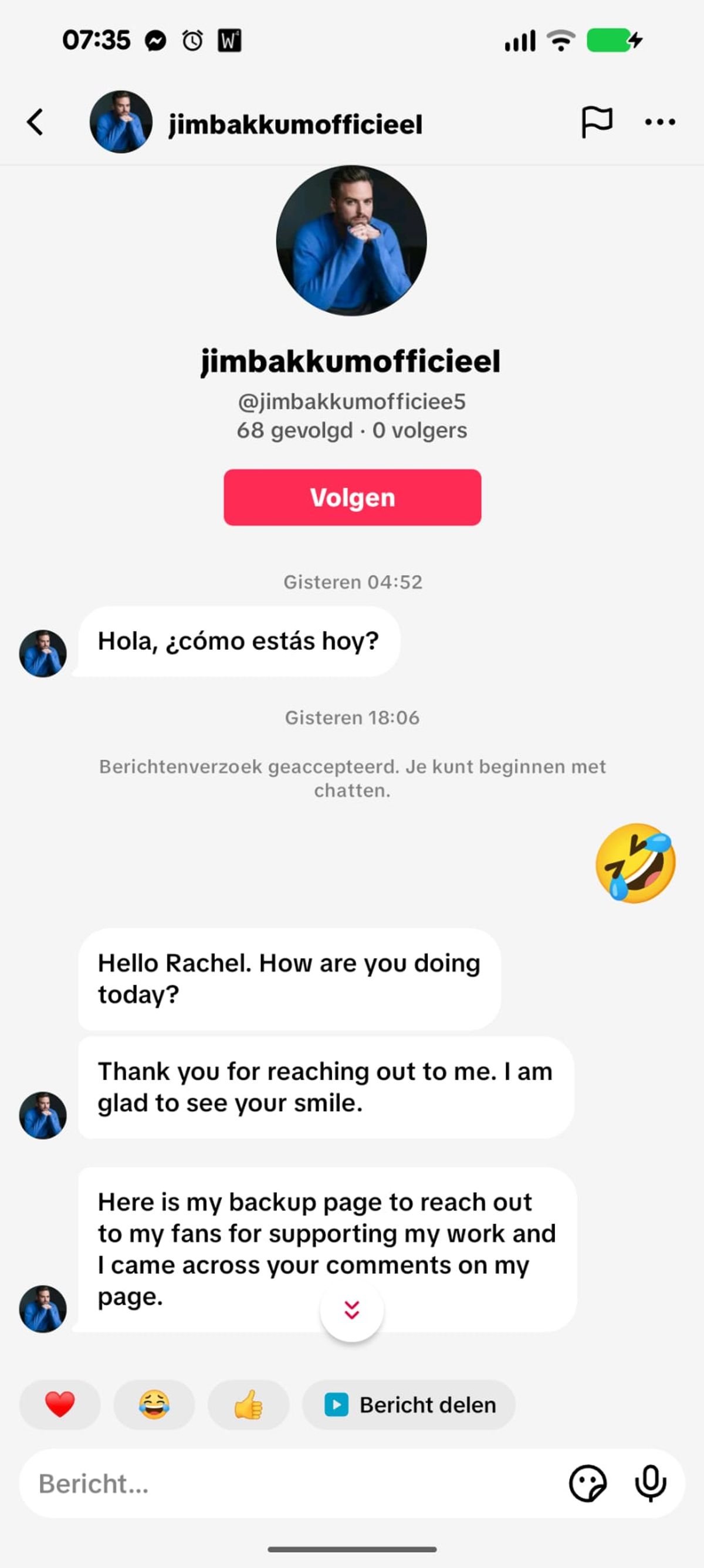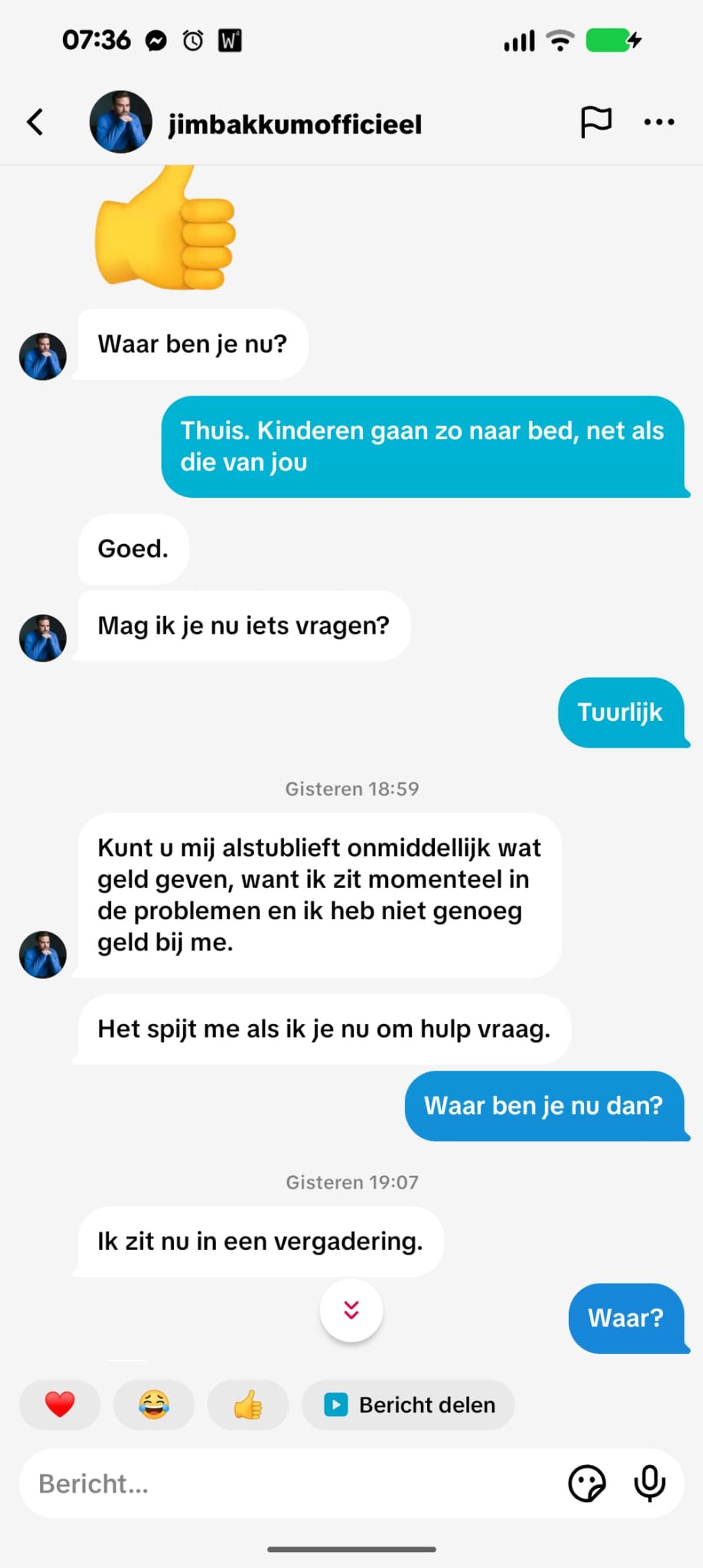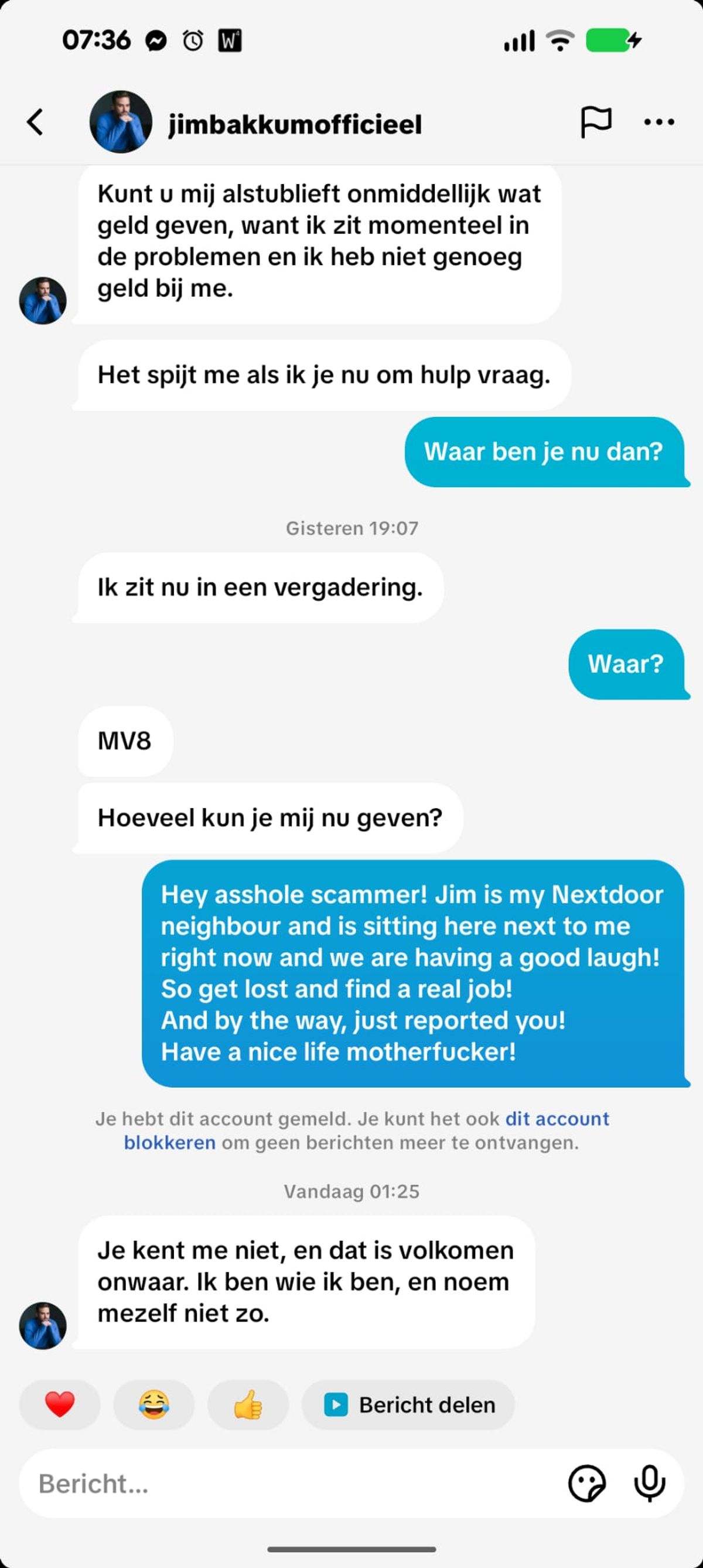 Oplichter die zich voordoet als Jim Bakkum heeft dringend geld nodig maar valt helaas door de mand en probeert het een paar uur later gewoon nog een keer (5 screens)