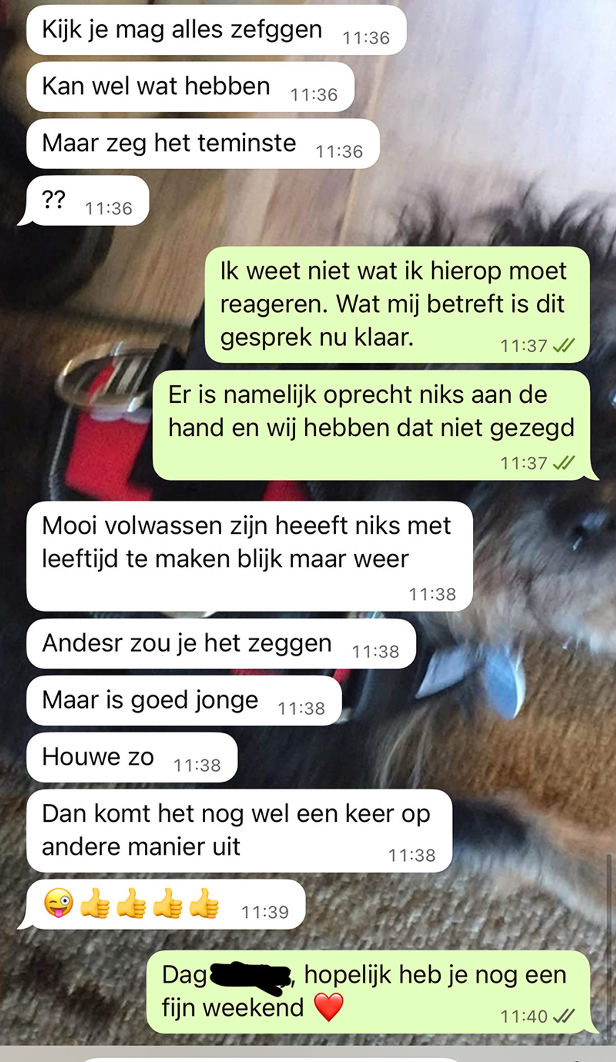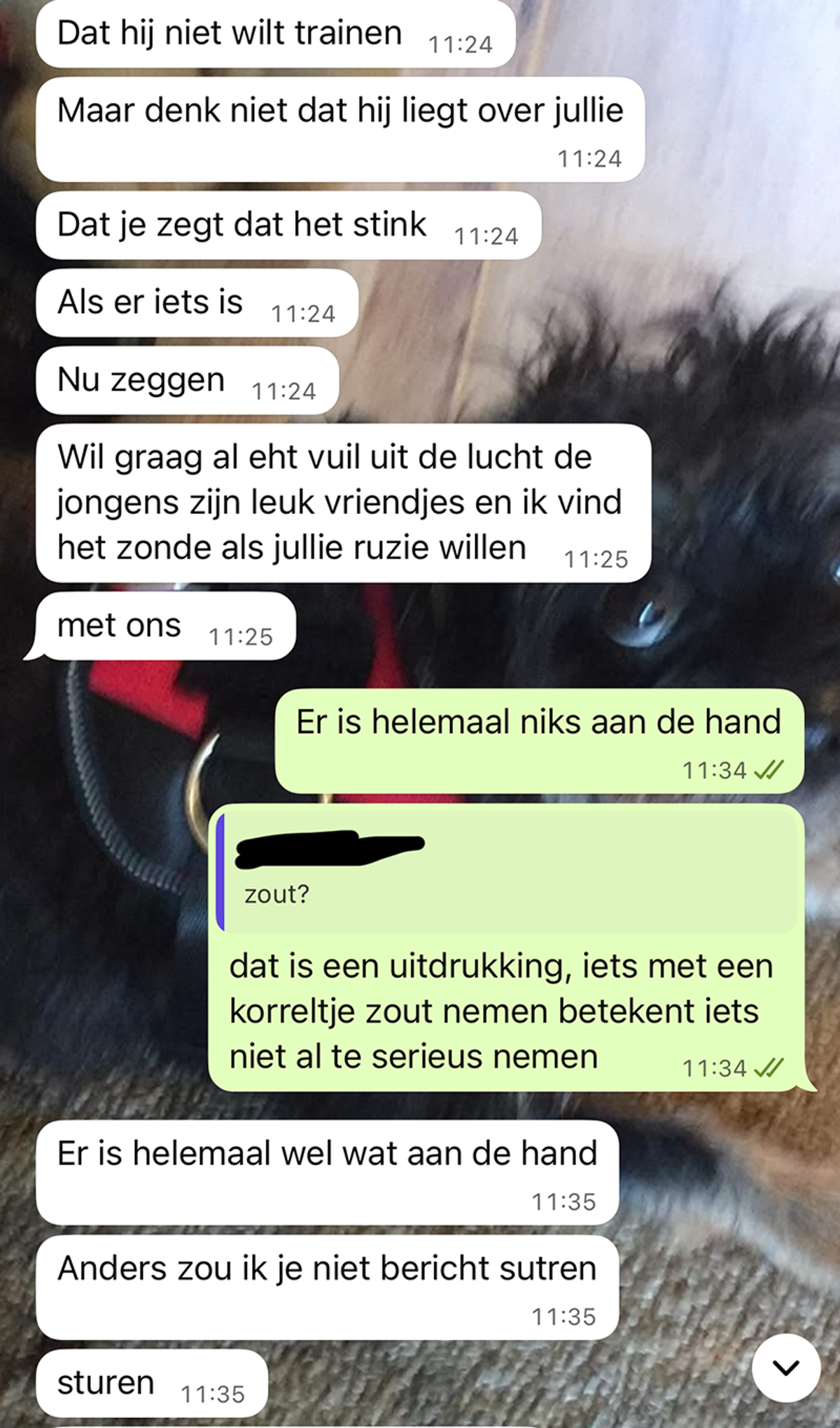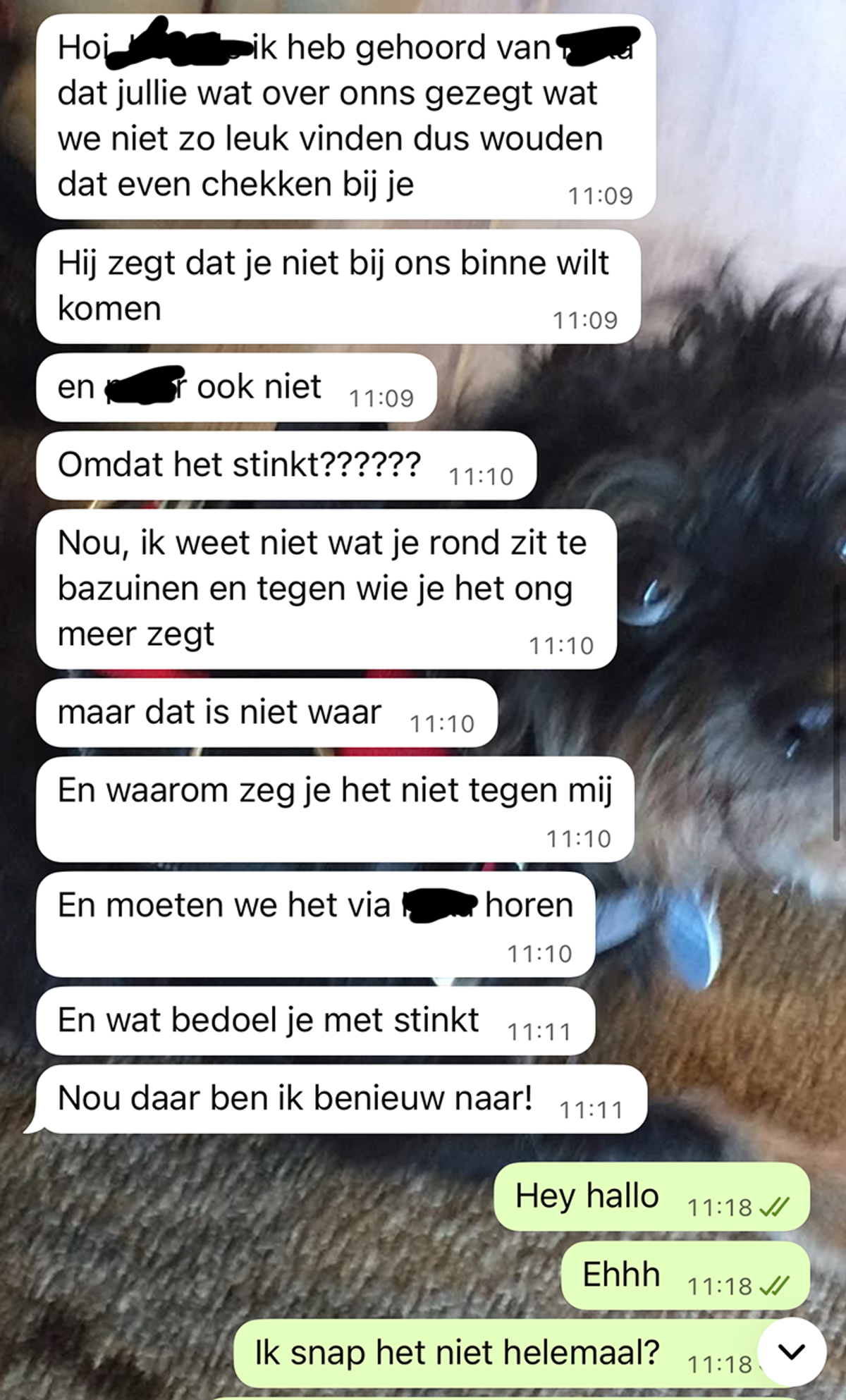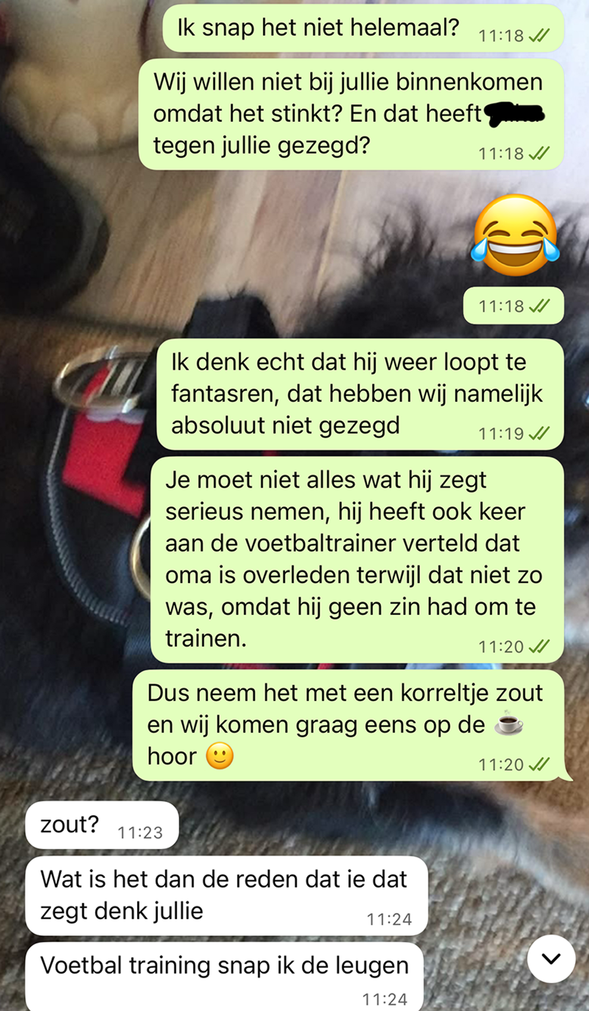 Jongetje van 6 heeft tegen de moeder van een vriendje lopen vertellen dat zijn ouders daar niet binnen willen komen omdat hun huis stinkt en nu komt die moeder even verhaal halen op WhatsApp (4 screens)