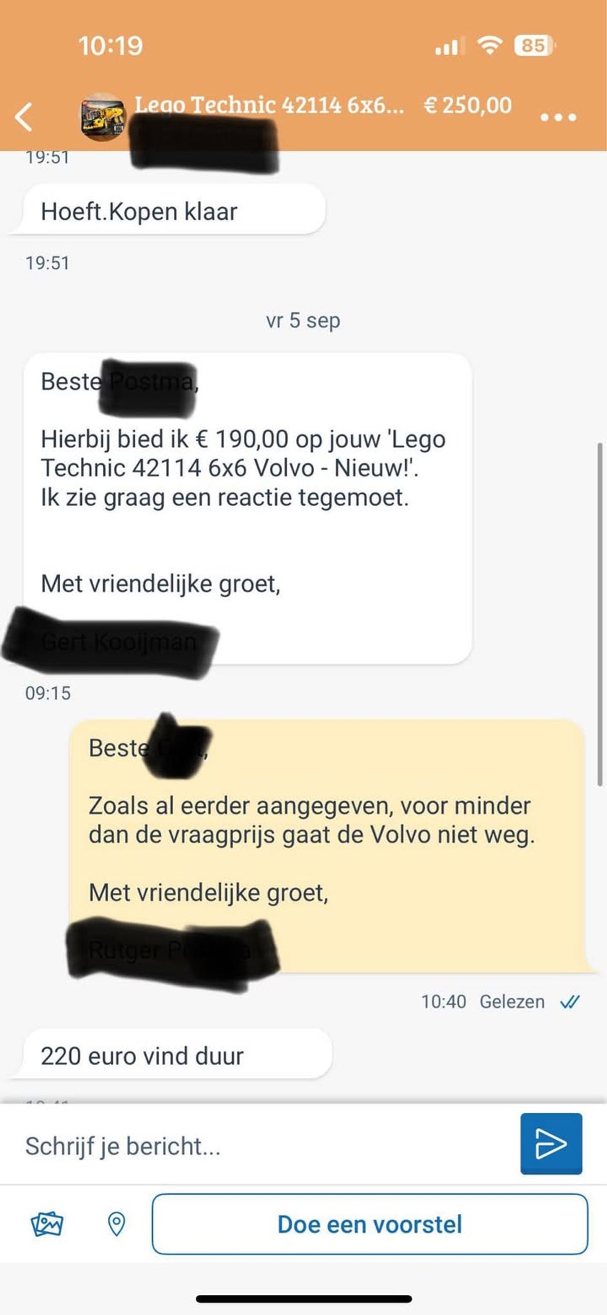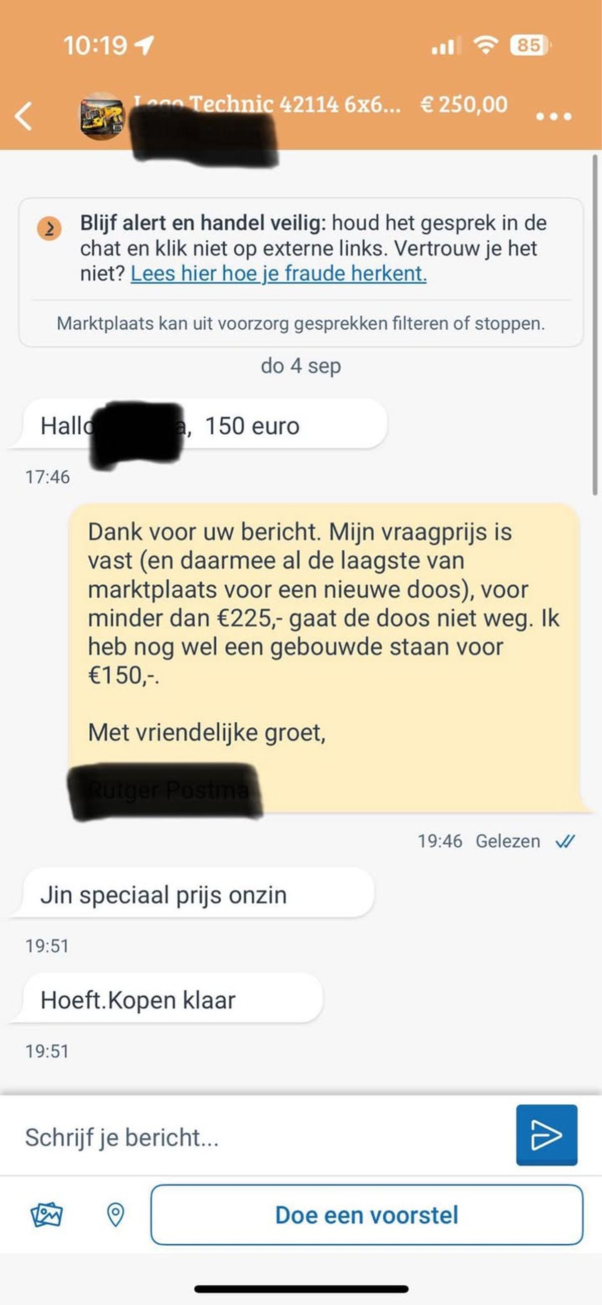 Man met minder communicatieve vaardigheden dan een vaatwastablet heeft interesse in een stuk LEGO op Marktplaats maar vindt de prijs de hoog (3 screens)