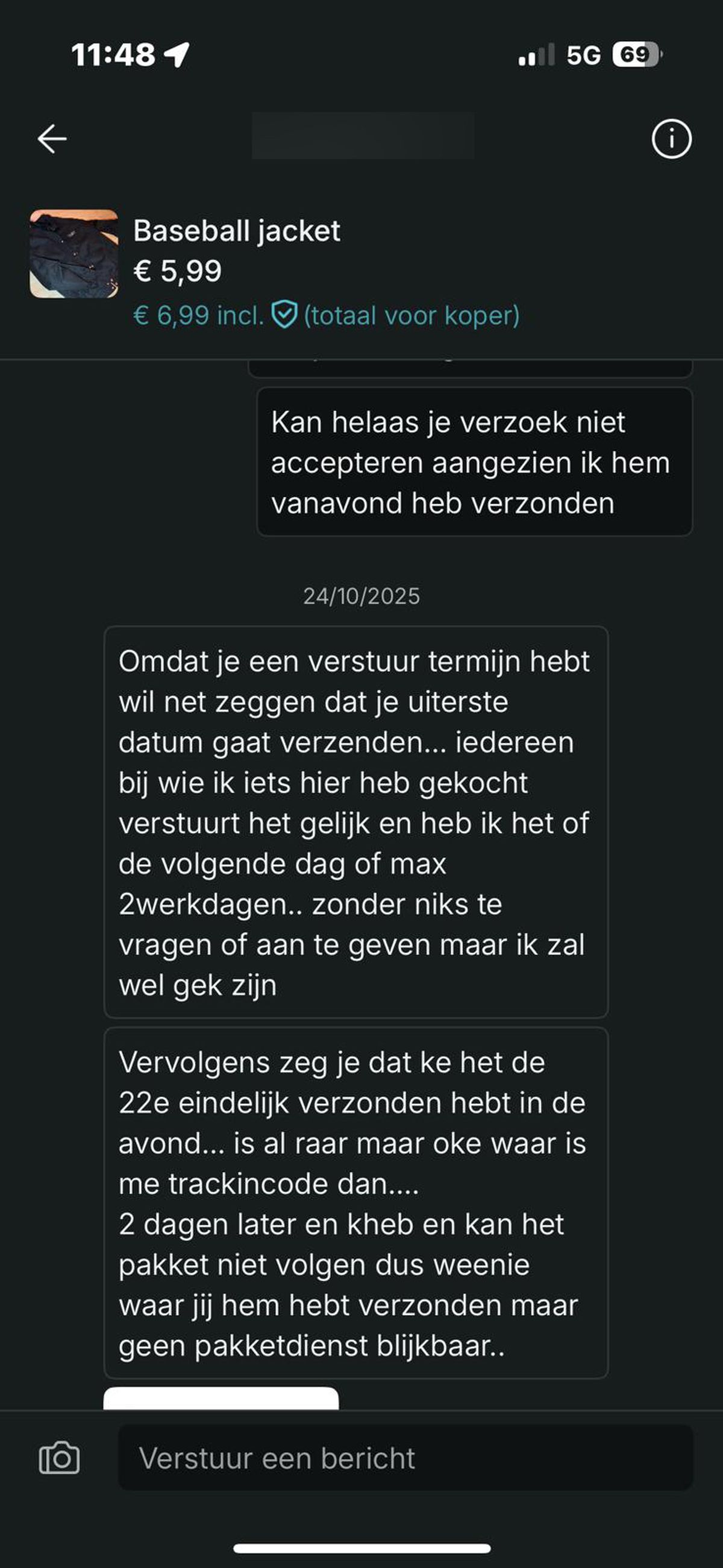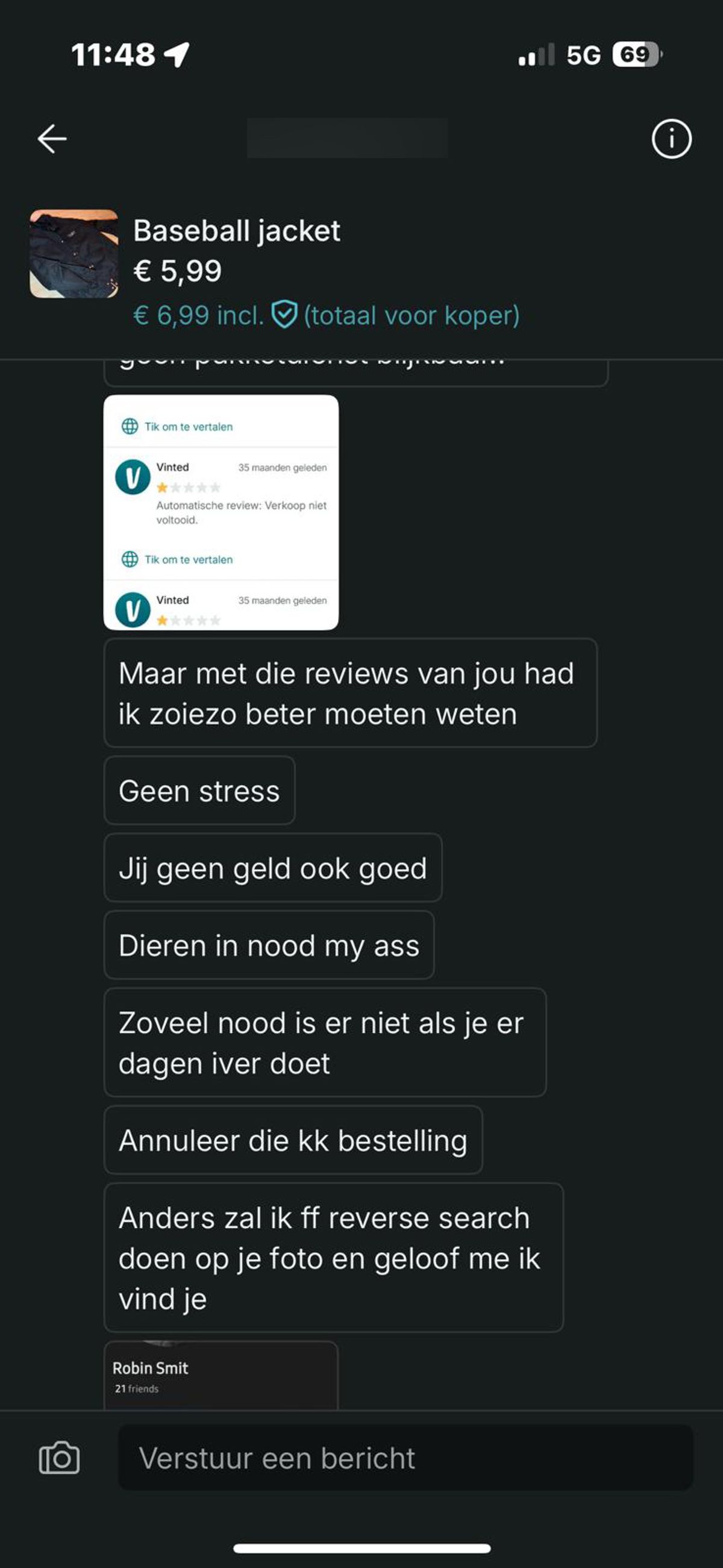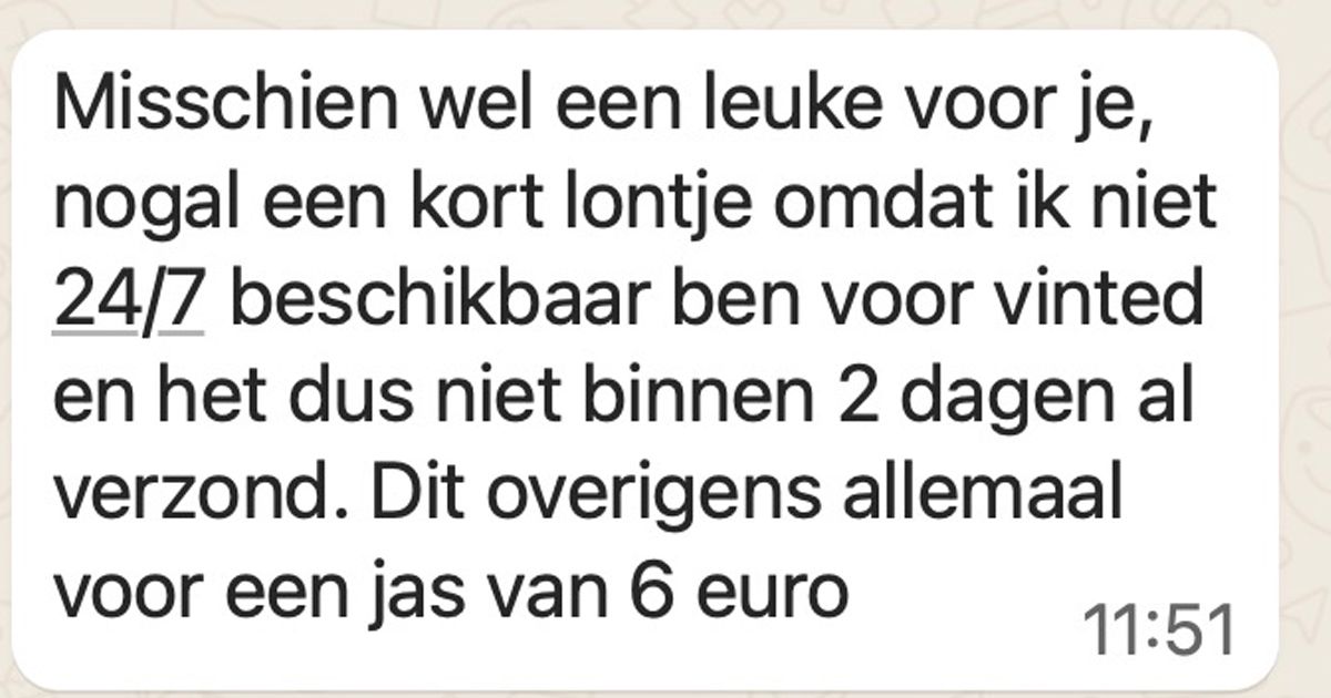 Verkoper op Vinted wordt bedreigd omdat hij een jas van 6 euro niet binnen twee werkdagen opstuurt (6 screens)