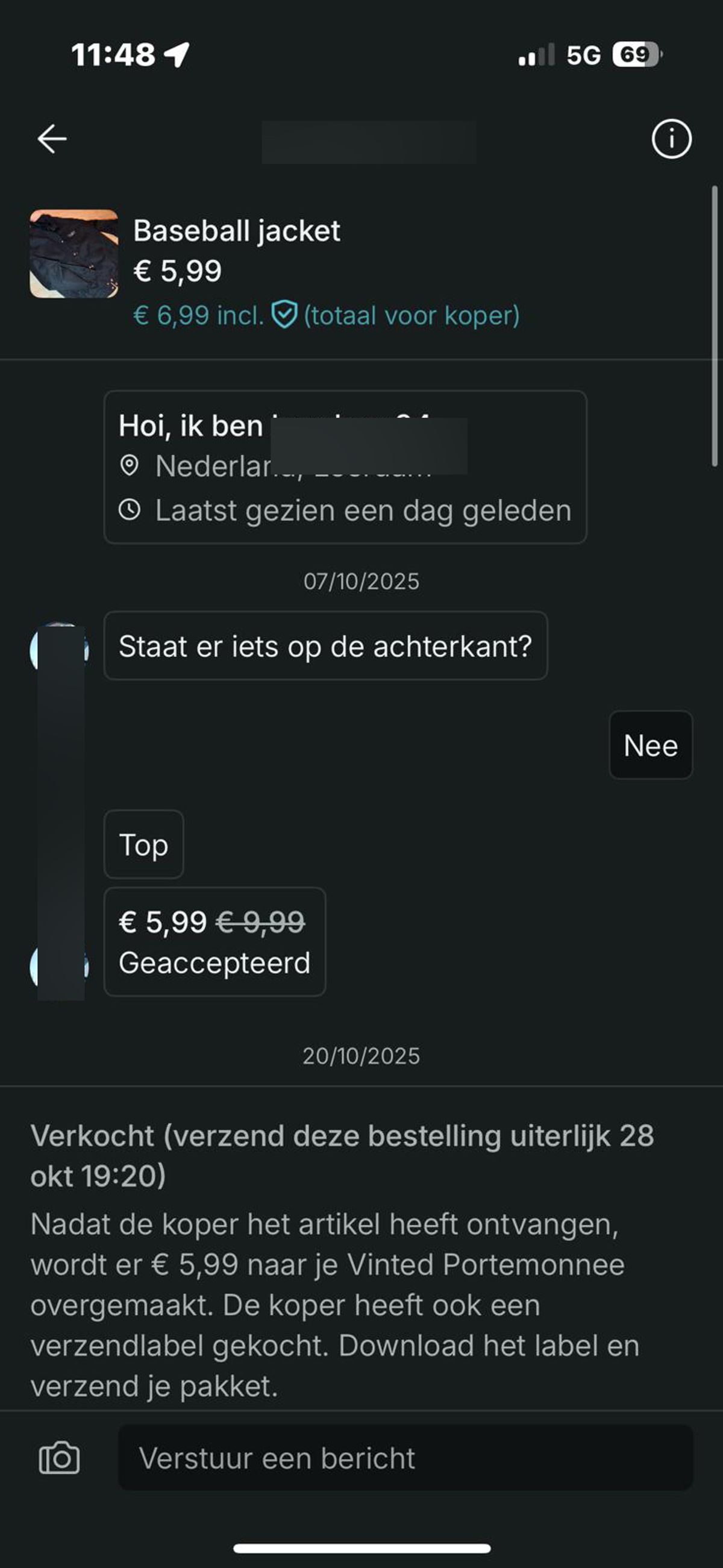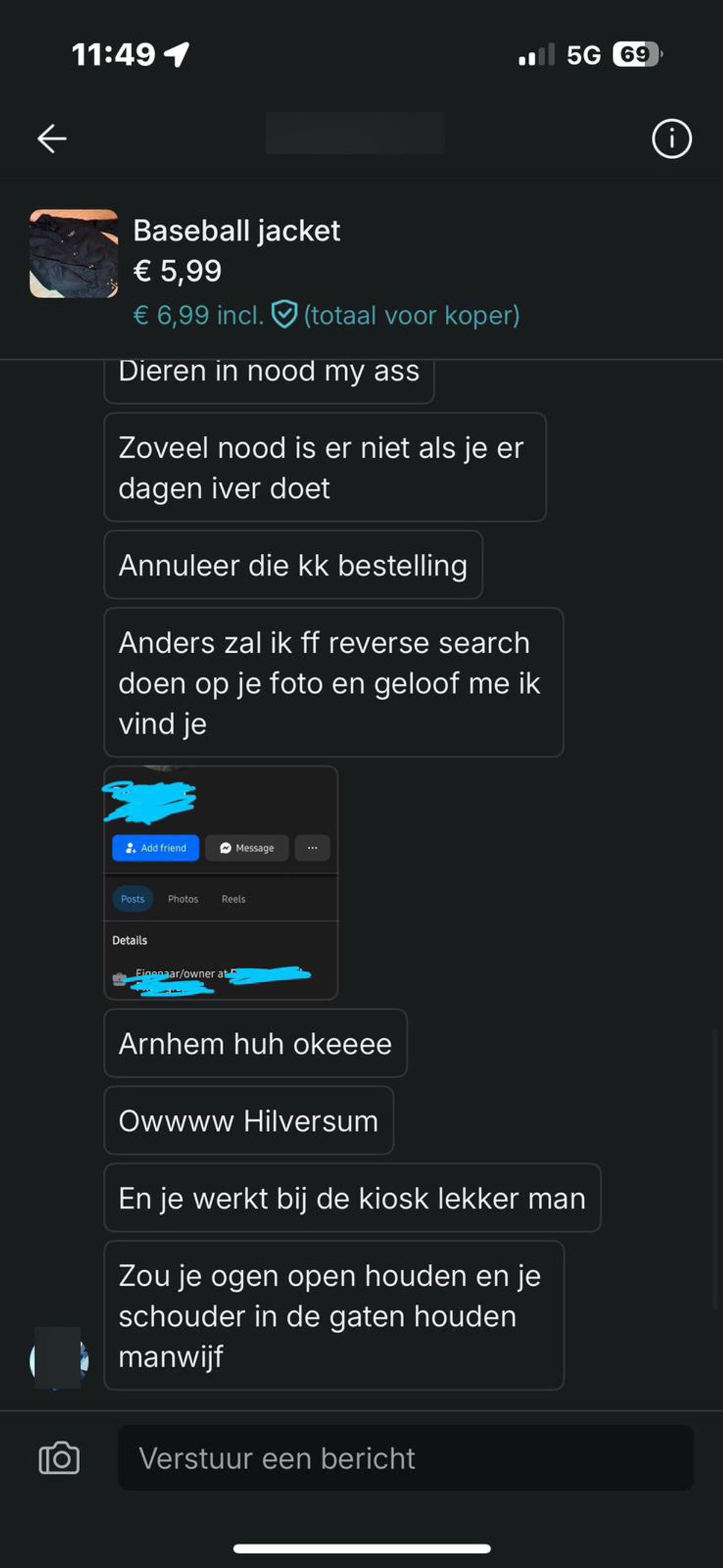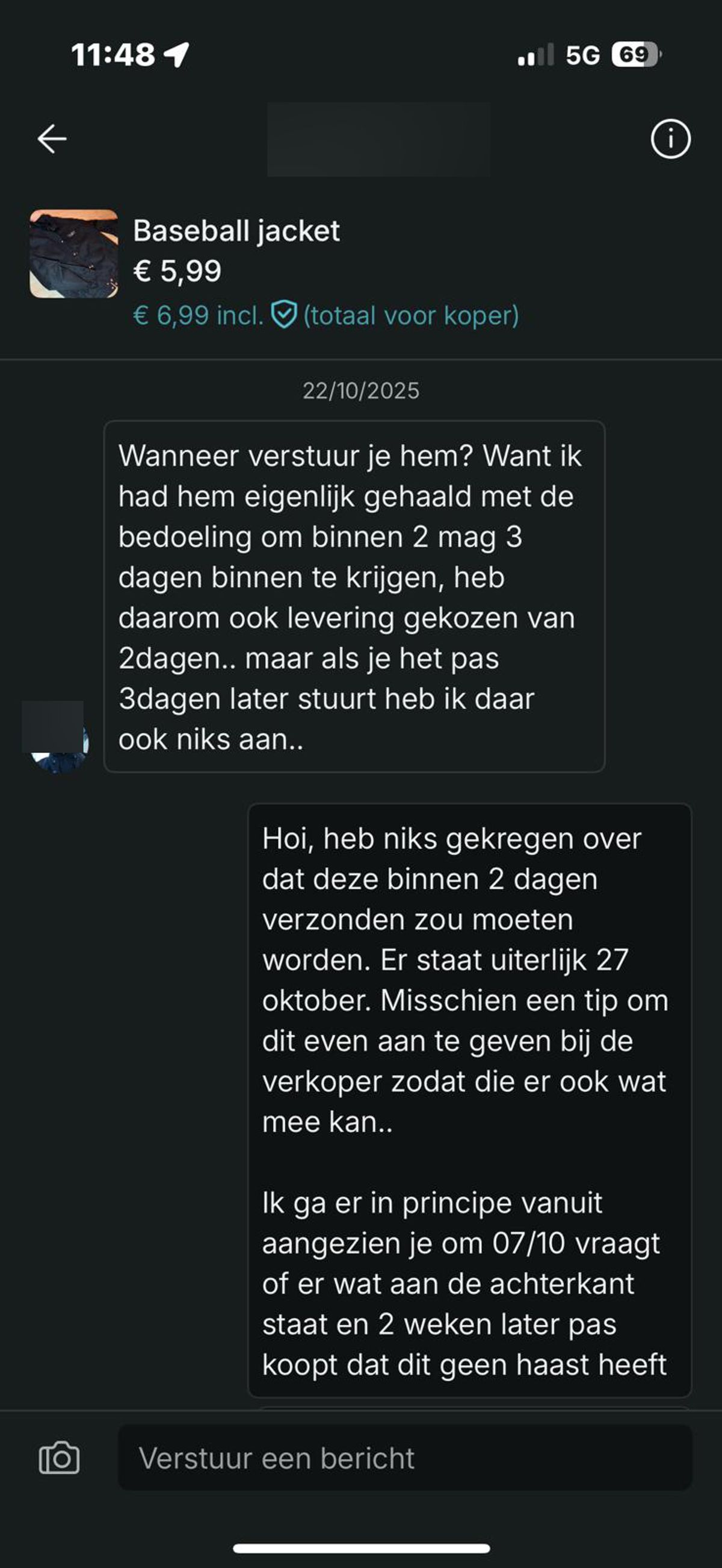 Verkoper op Vinted wordt bedreigd omdat hij een jas van 6 euro niet binnen twee werkdagen opstuurt (6 screens)
