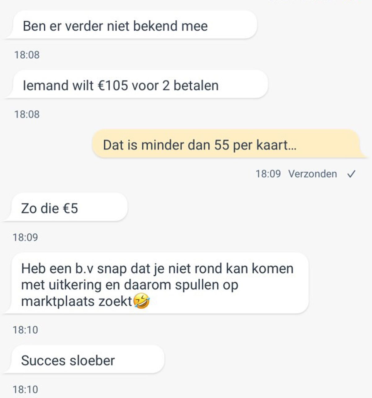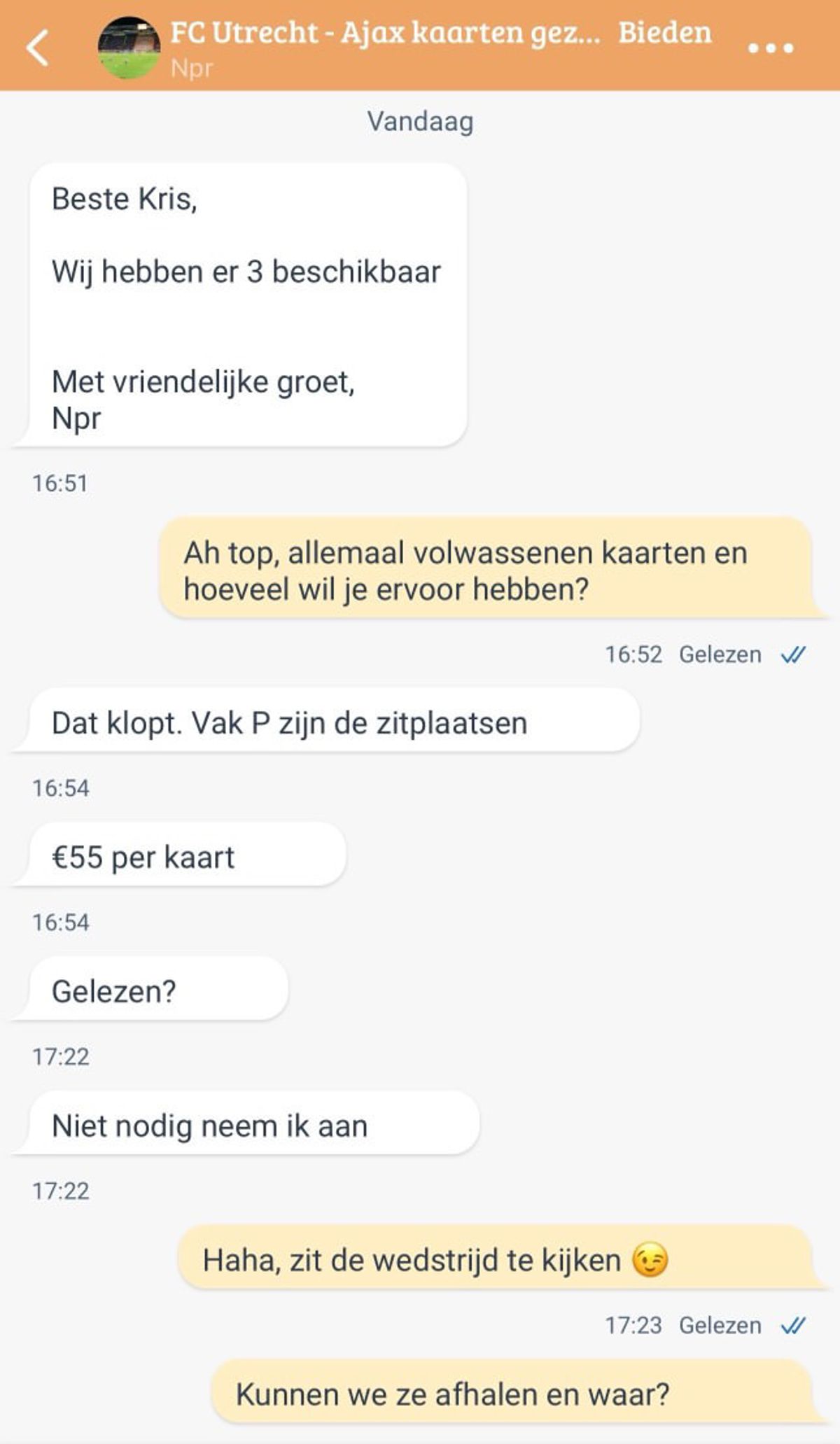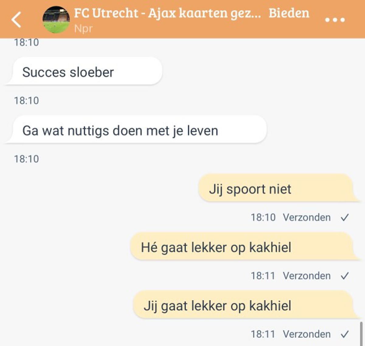 Man probeert kaartjes op Marktplaats te regelen voor FC Utrecht - Ajax maar de verkoper is nogal ongeduldig en schiet gelijk in Tokkie-modus als er niet snel genoeg gereageerd wordt (6 screens)