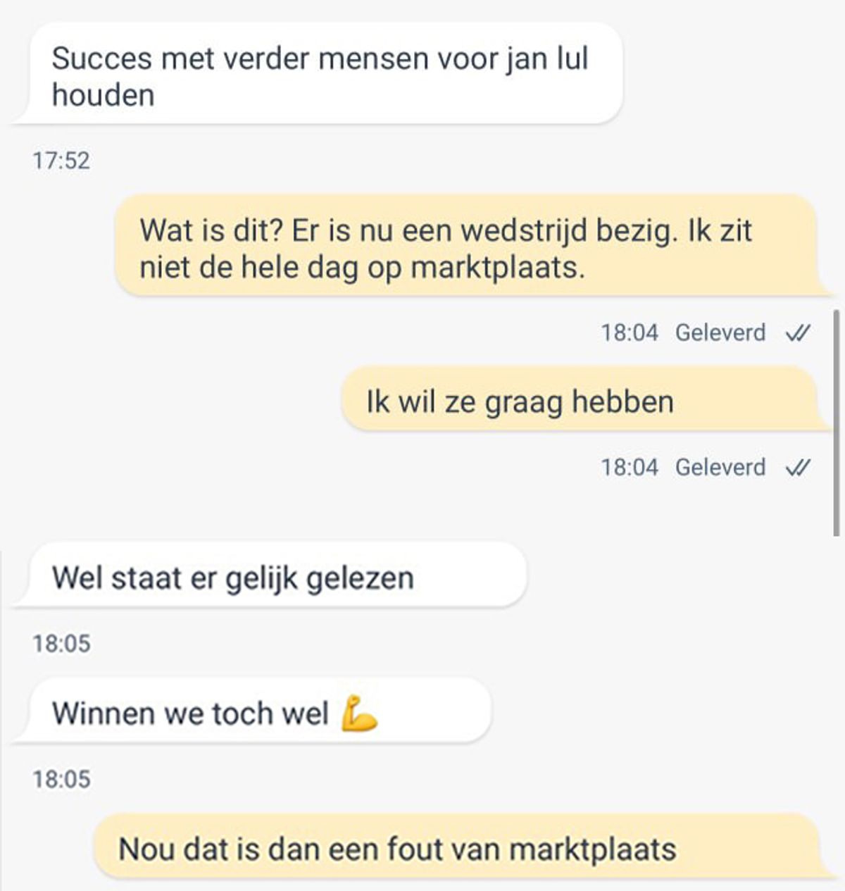 Man trekt betaalverzoek in op Marktplaats terwijl er al een akkoord was en dat gaat niet helemaal goed. 'Je krijgt je geld, maar wanneer het mij uitkomt' (6 screens)