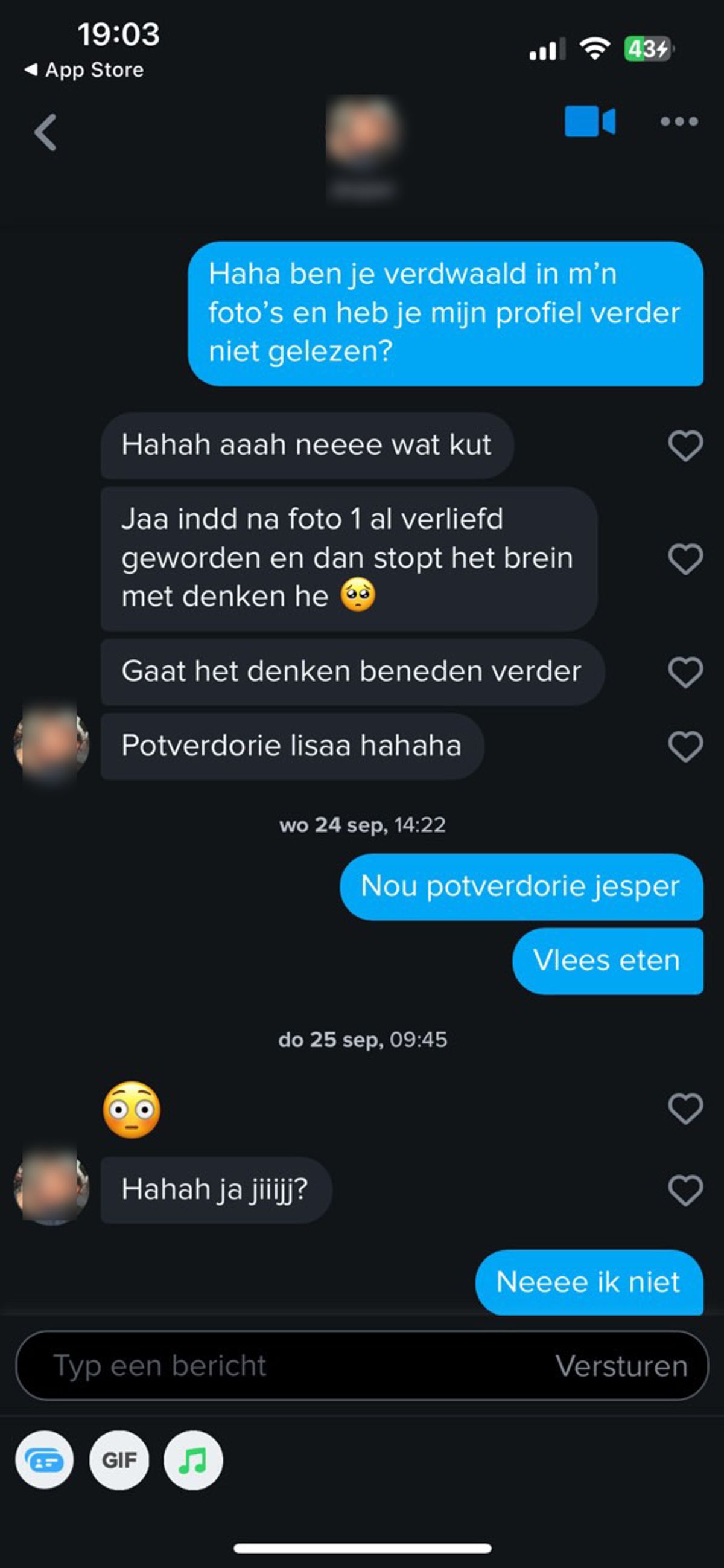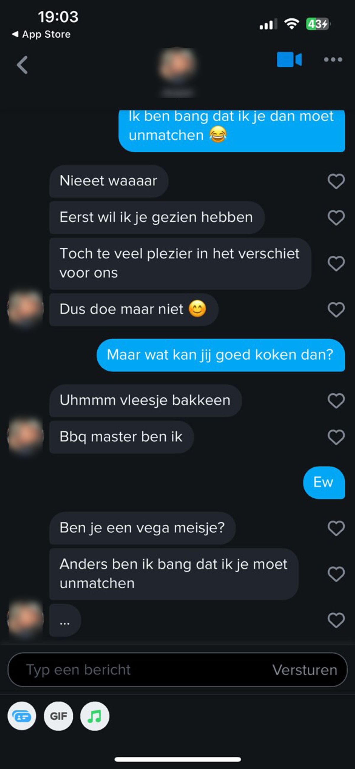 Dit is ook wel een bijzondere manier om een gesprek te beginnen in een dating-app (3 screens)