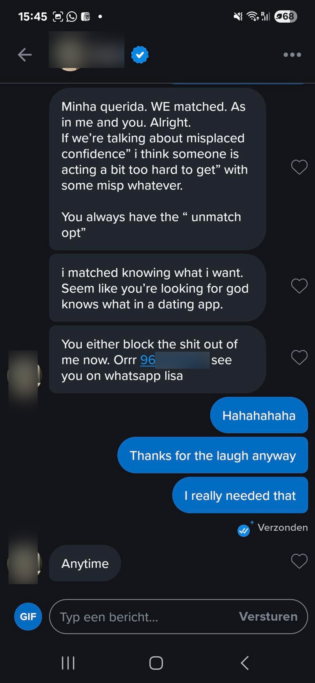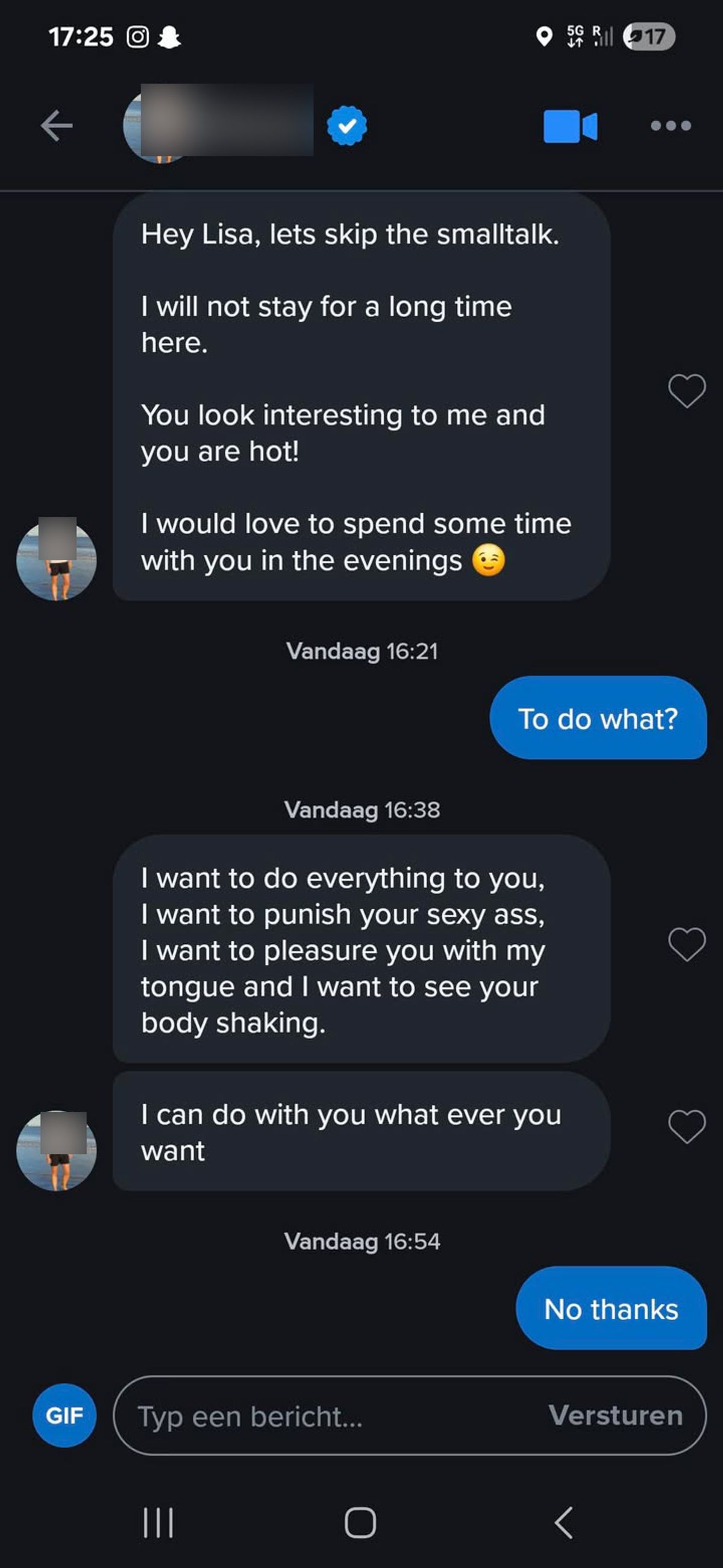 Gast die van Tinder verwijderd is door deze vrouw komt nog even via Instagram verhaal halen en als ze niet op zijn vragen wil antwoorden begint ie maar meteen volle bak te schelden (4 screens)
