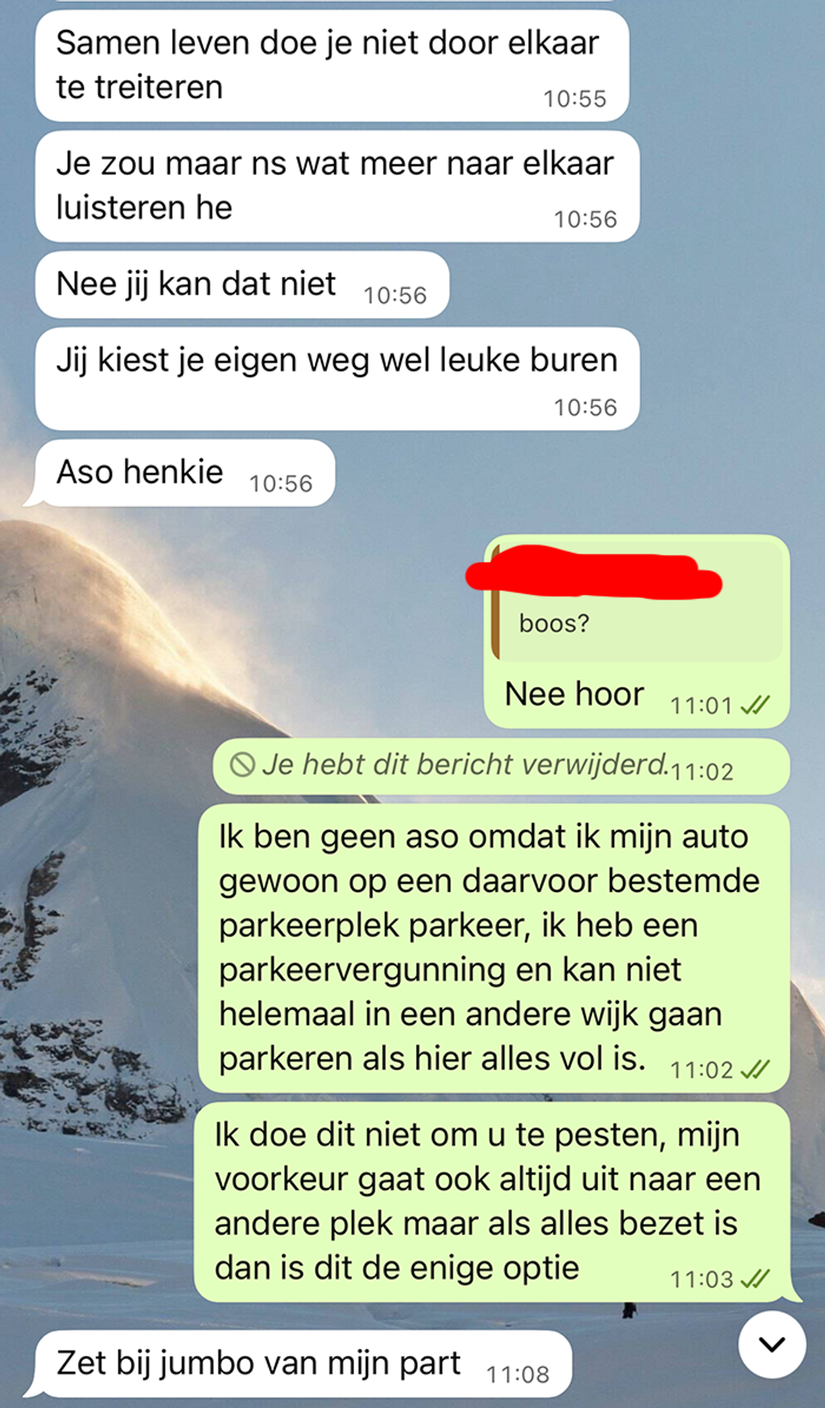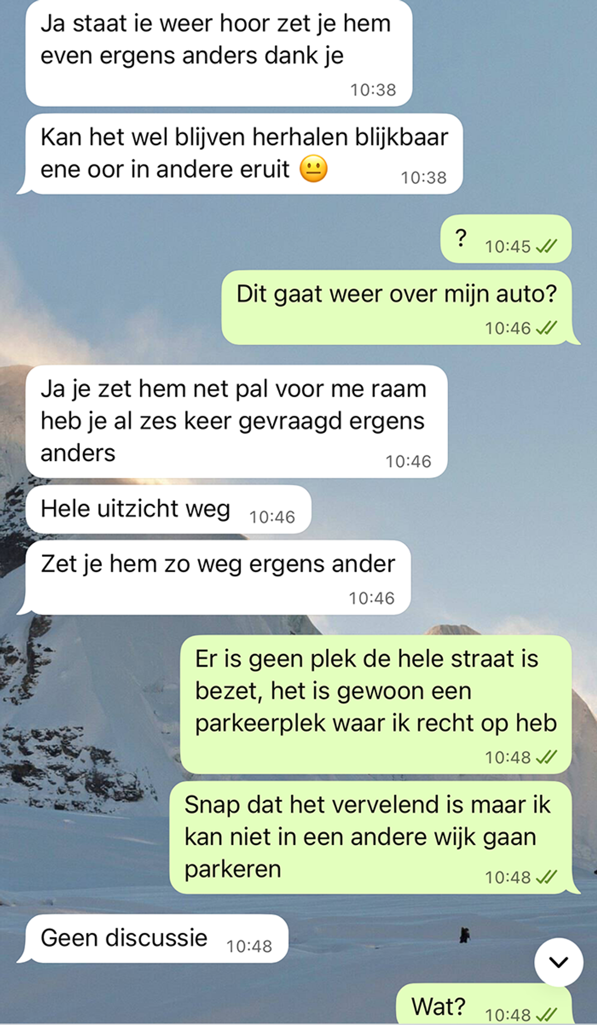 Buurman is boos omdat er een auto voor zijn raam staat die zijn uitzicht belemmerd dus besluit hij even contact op te nemen met de eigenaar (4 screens)