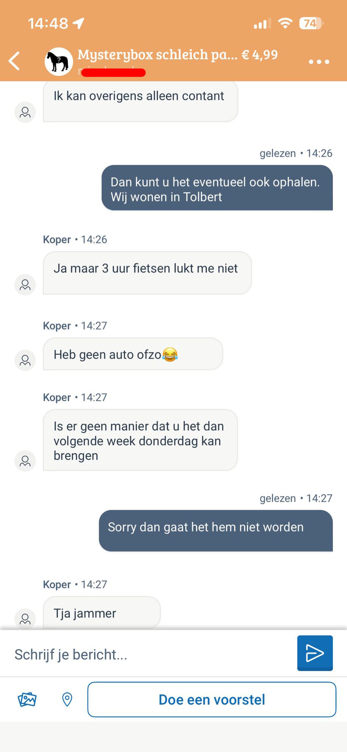 Gast wil Playstation 5 kopen op Marktplaats en vindt dat de verkoper hem maar gewoon moet komen brengen ook al is het in totaal 2 uur rijden want op vakantie zit hij zelf wel eens 50 uur in de auto en dat is pas lang (5 screens)