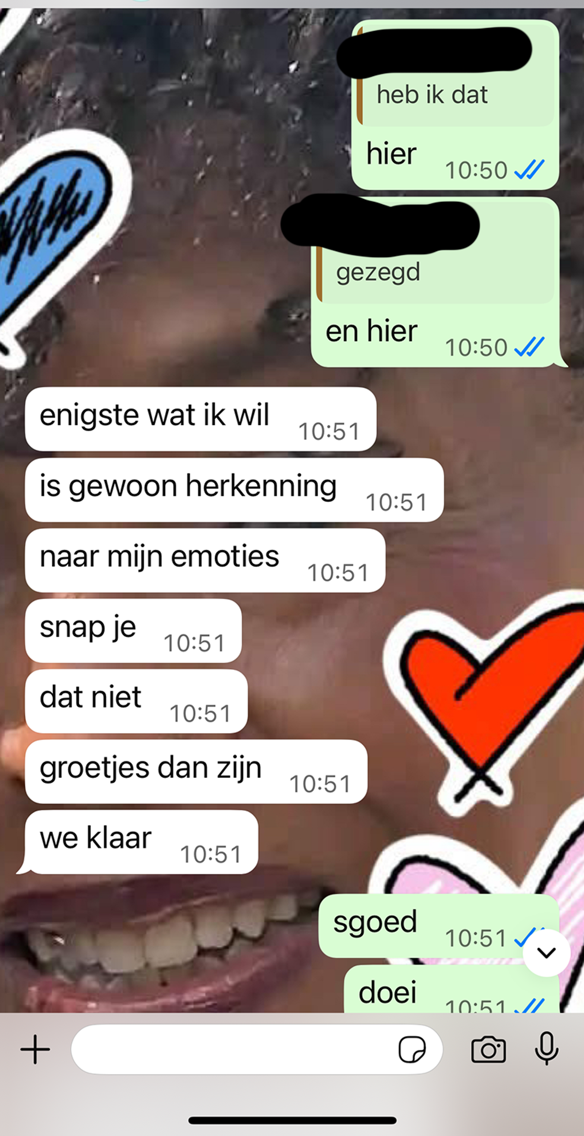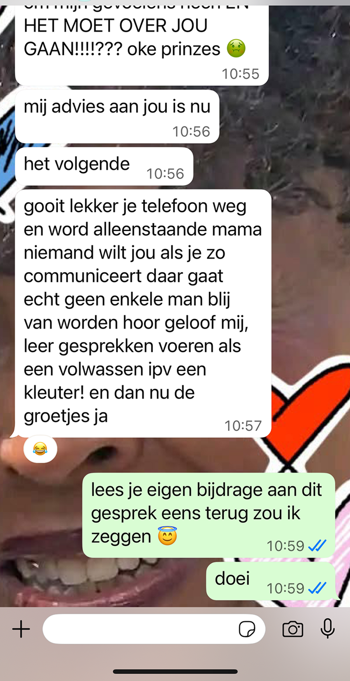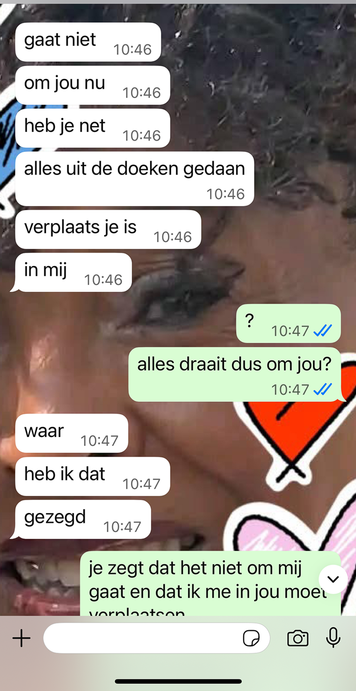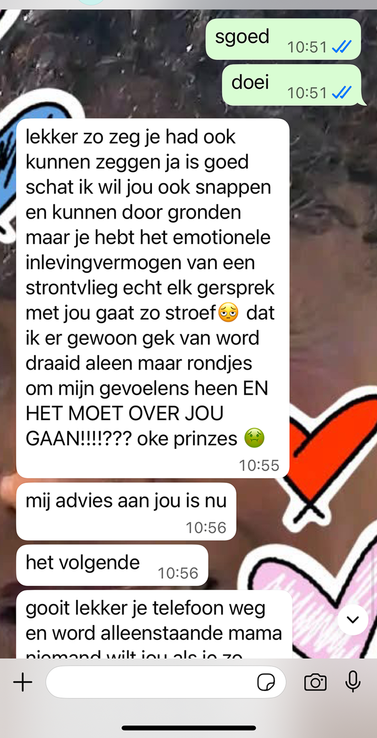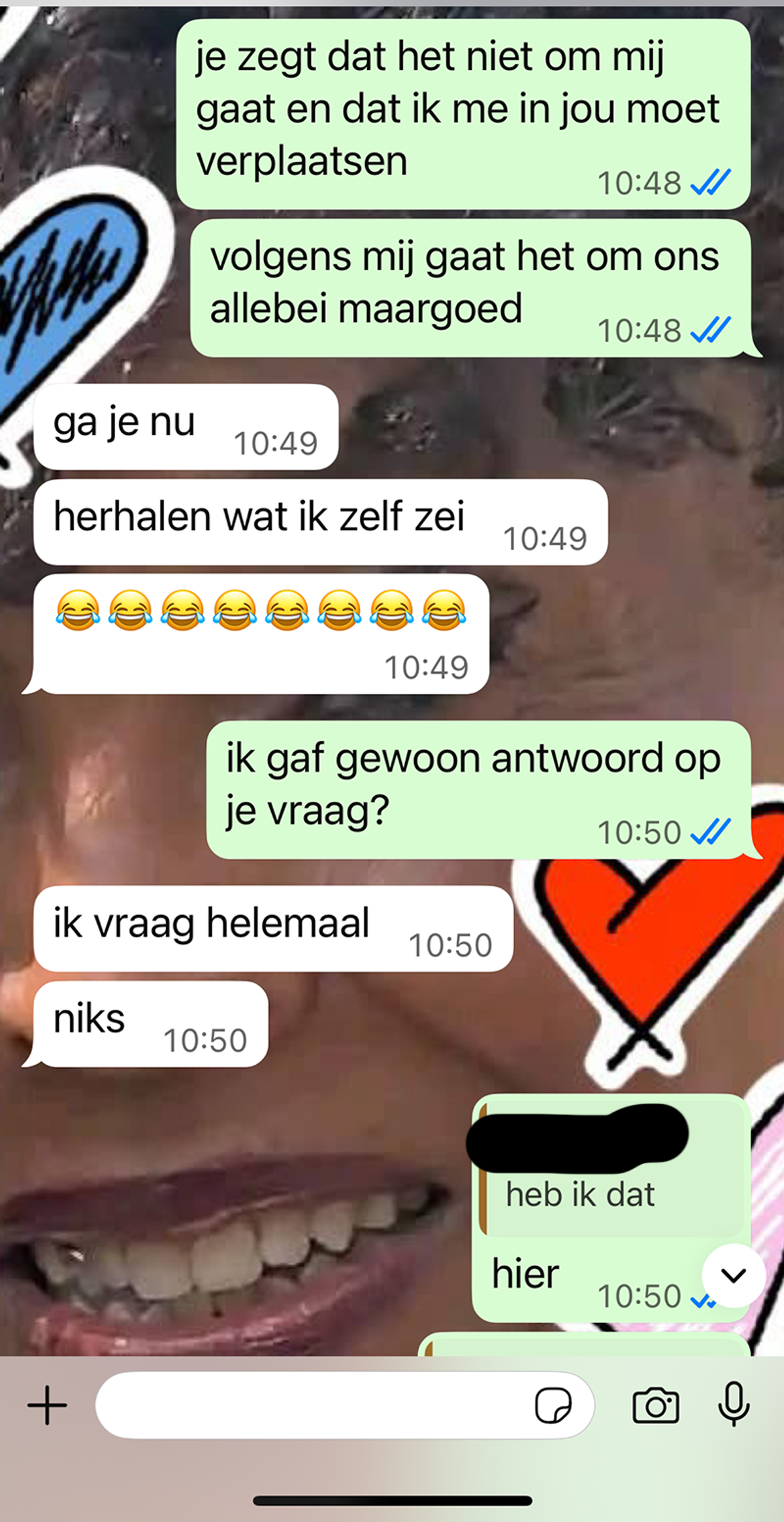 Man die zelf typt als een kleuter en halverwege een zin steeds op enter drukt beschuldigt zijn partner van stroef communiceren (5 screens)