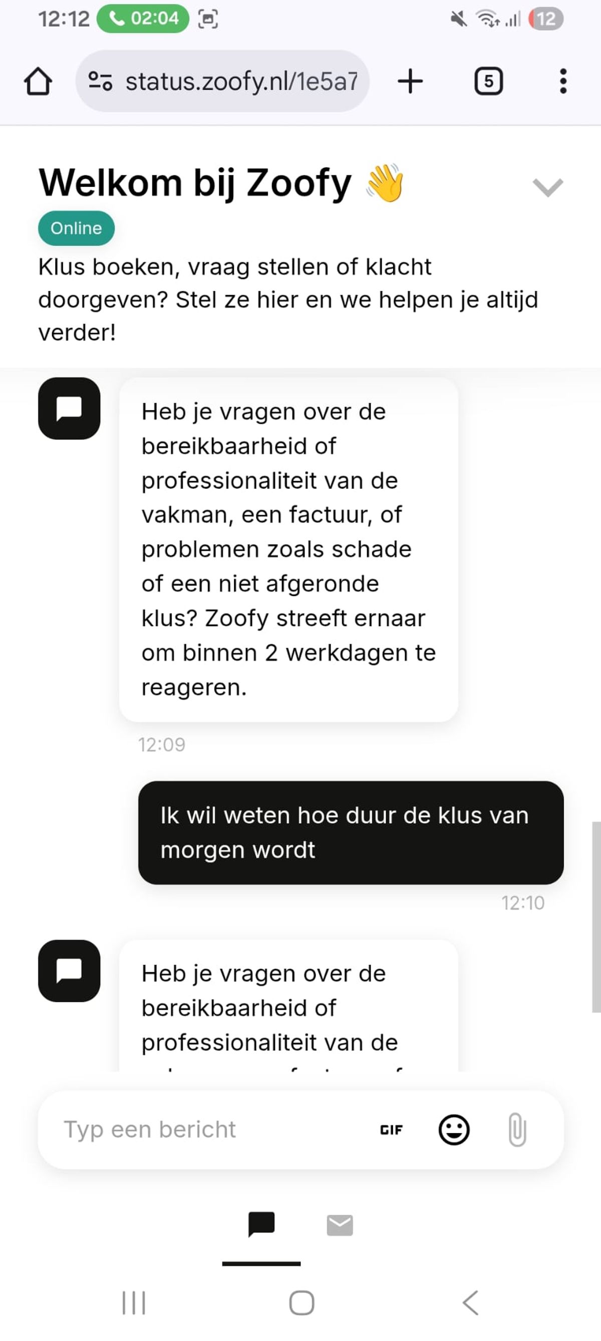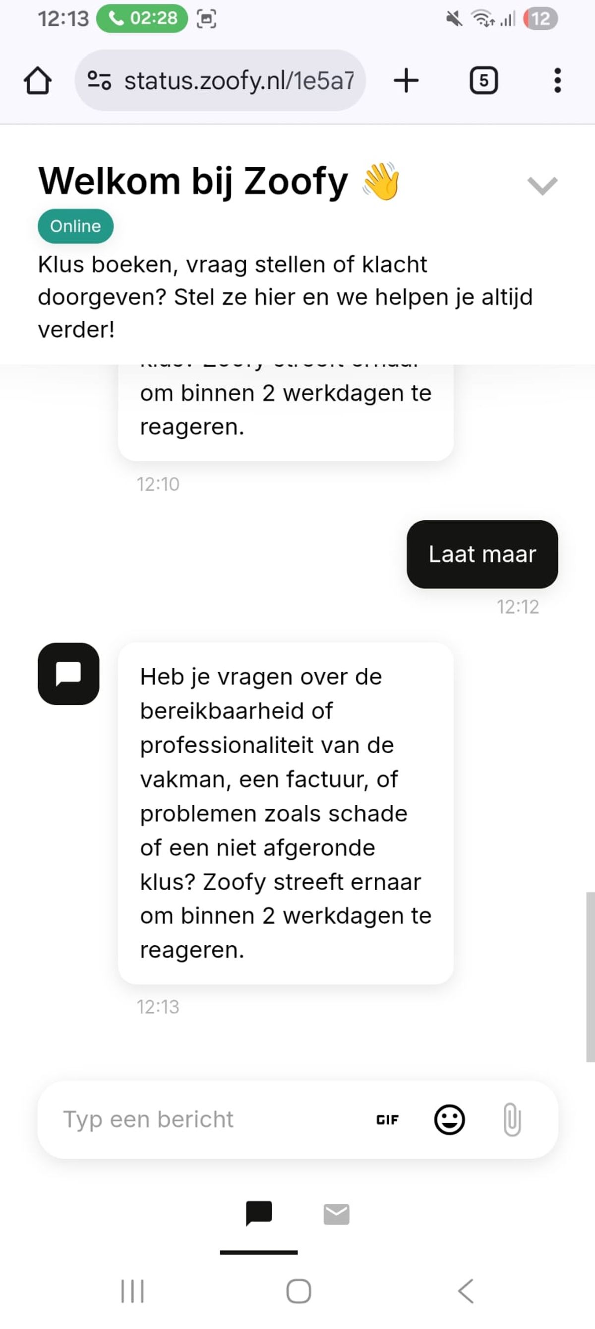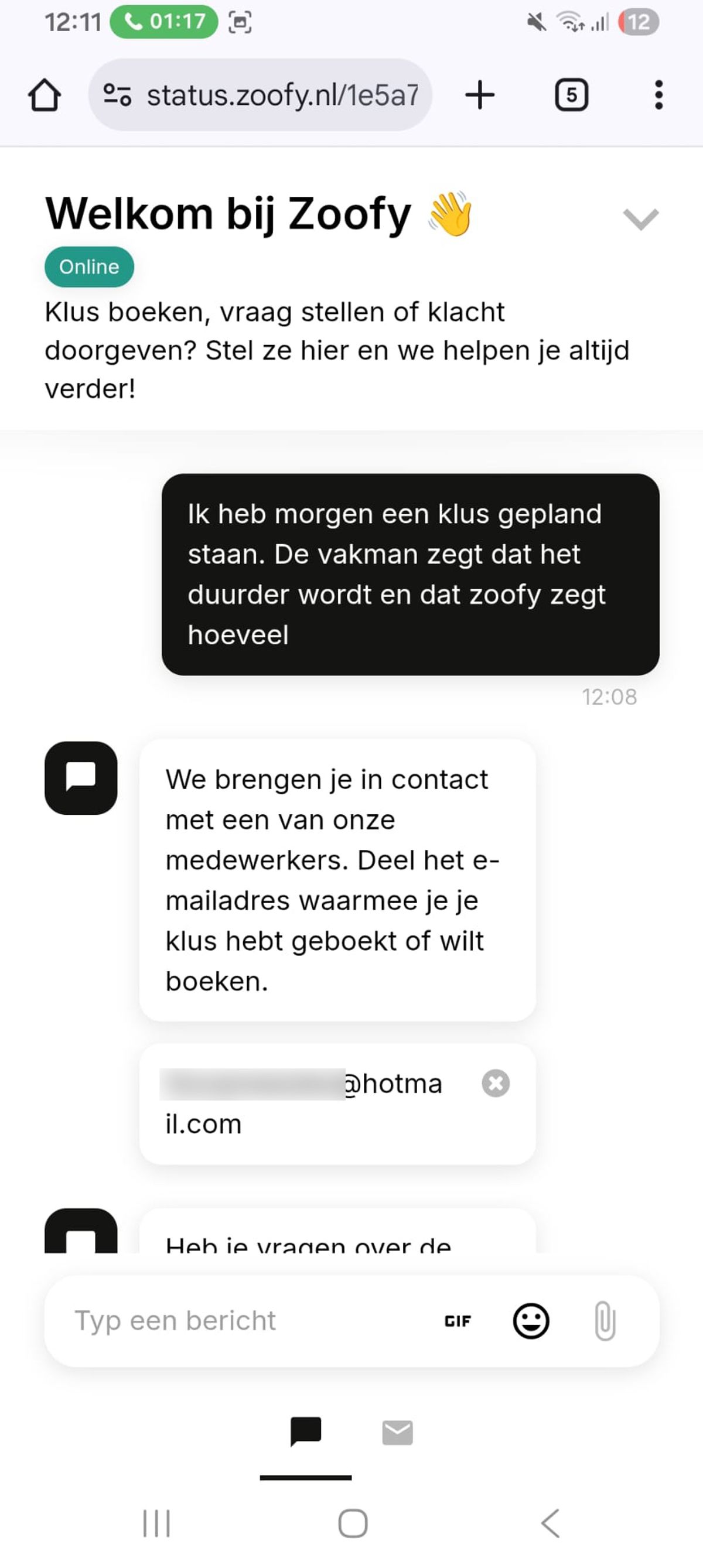 Hier weer een gezellig voorbeeld van de vet mislukte online klantenservice van klusplatform Zoofy (8 screens)