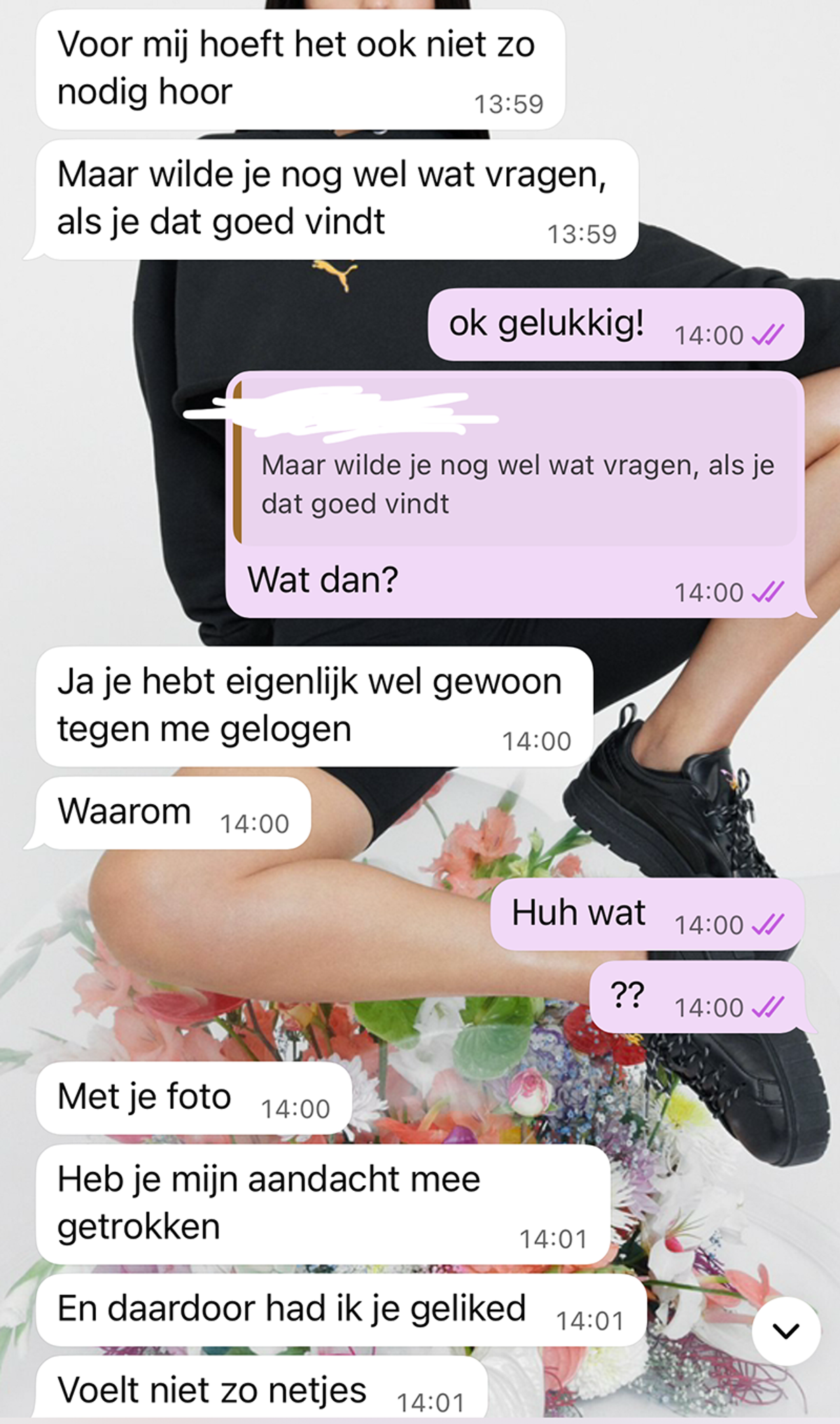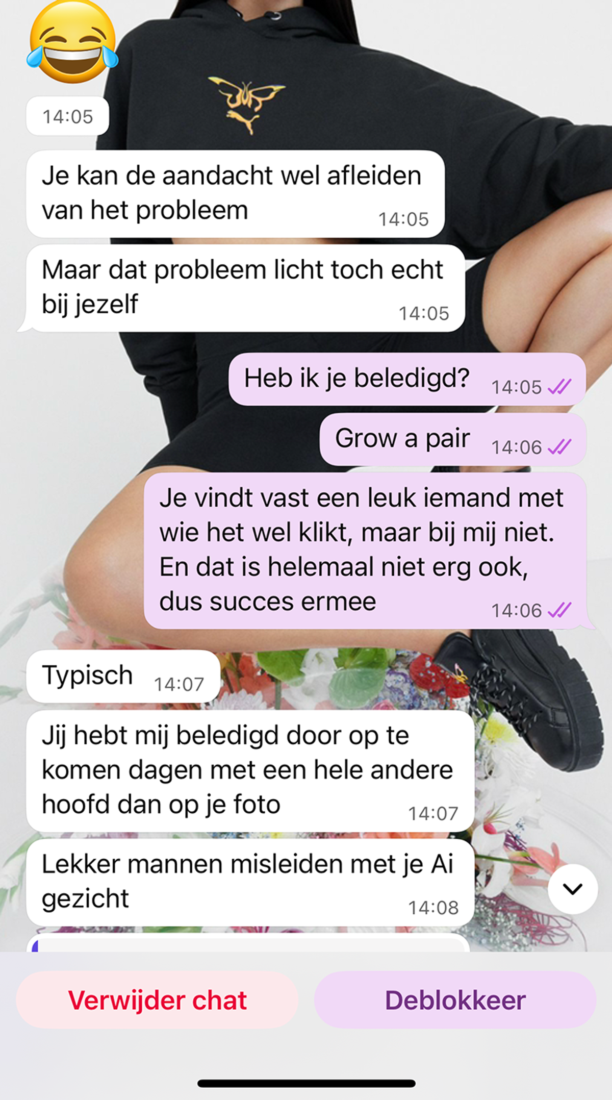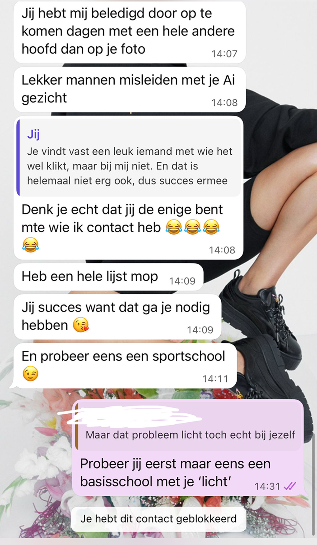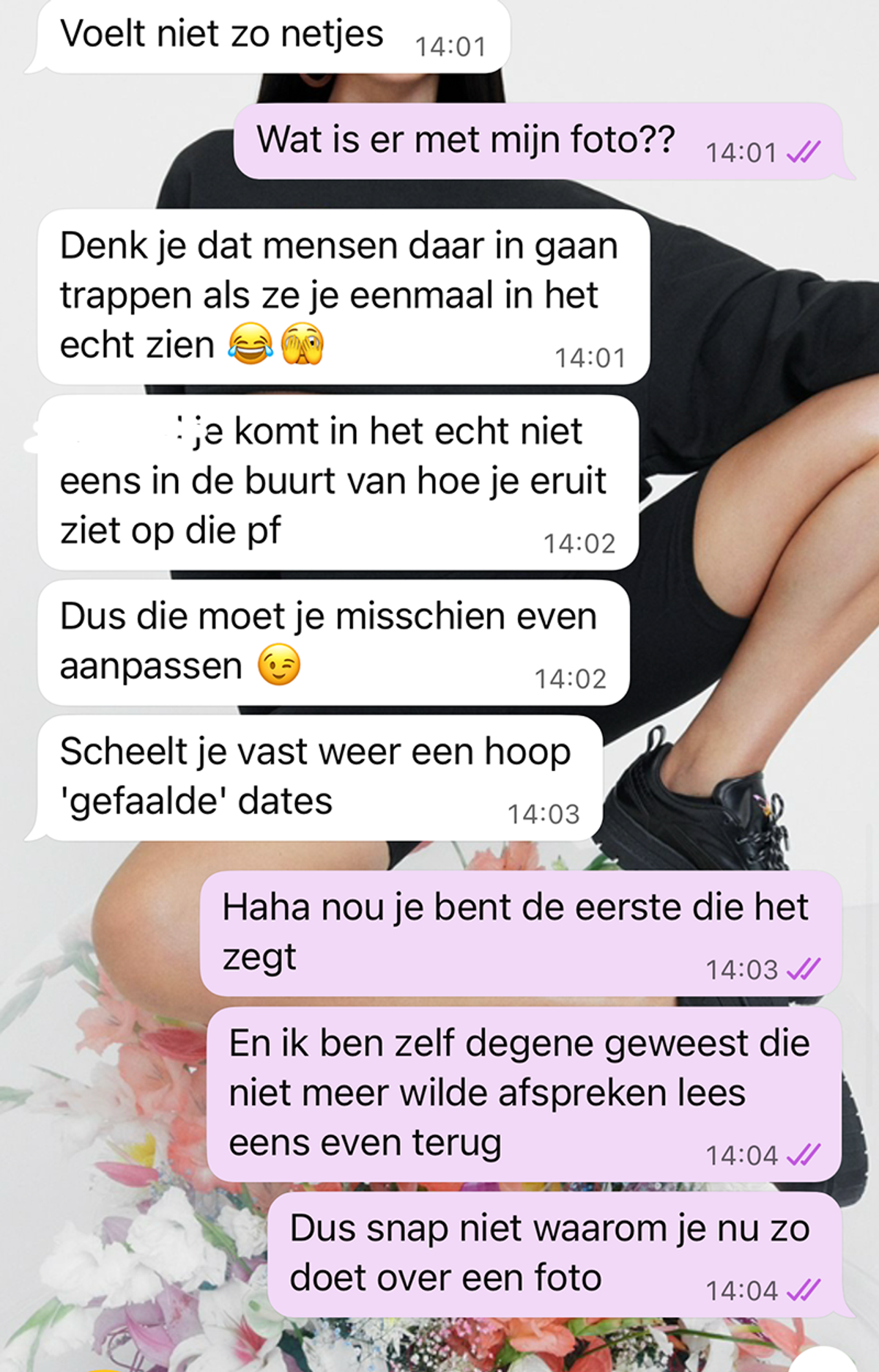 Gast kan het niet hebben dat hij wordt afgewezen voor een tweede date en komt ineens met allemaal rare beledigingen op de proppen (4 screens)