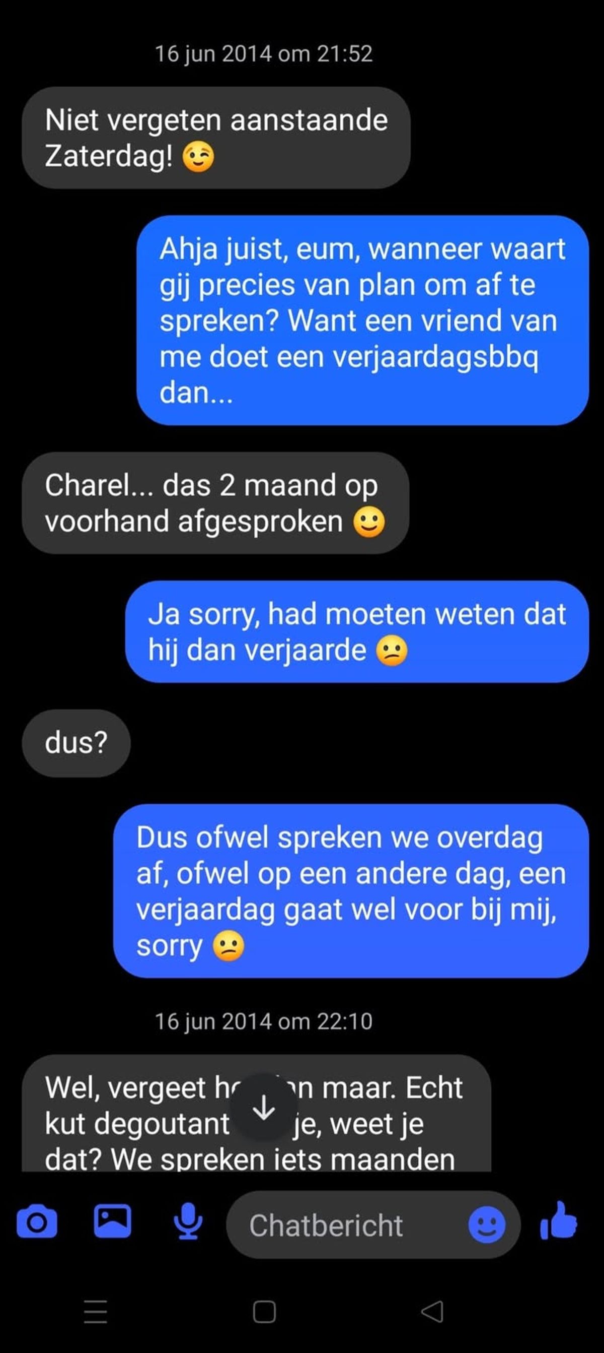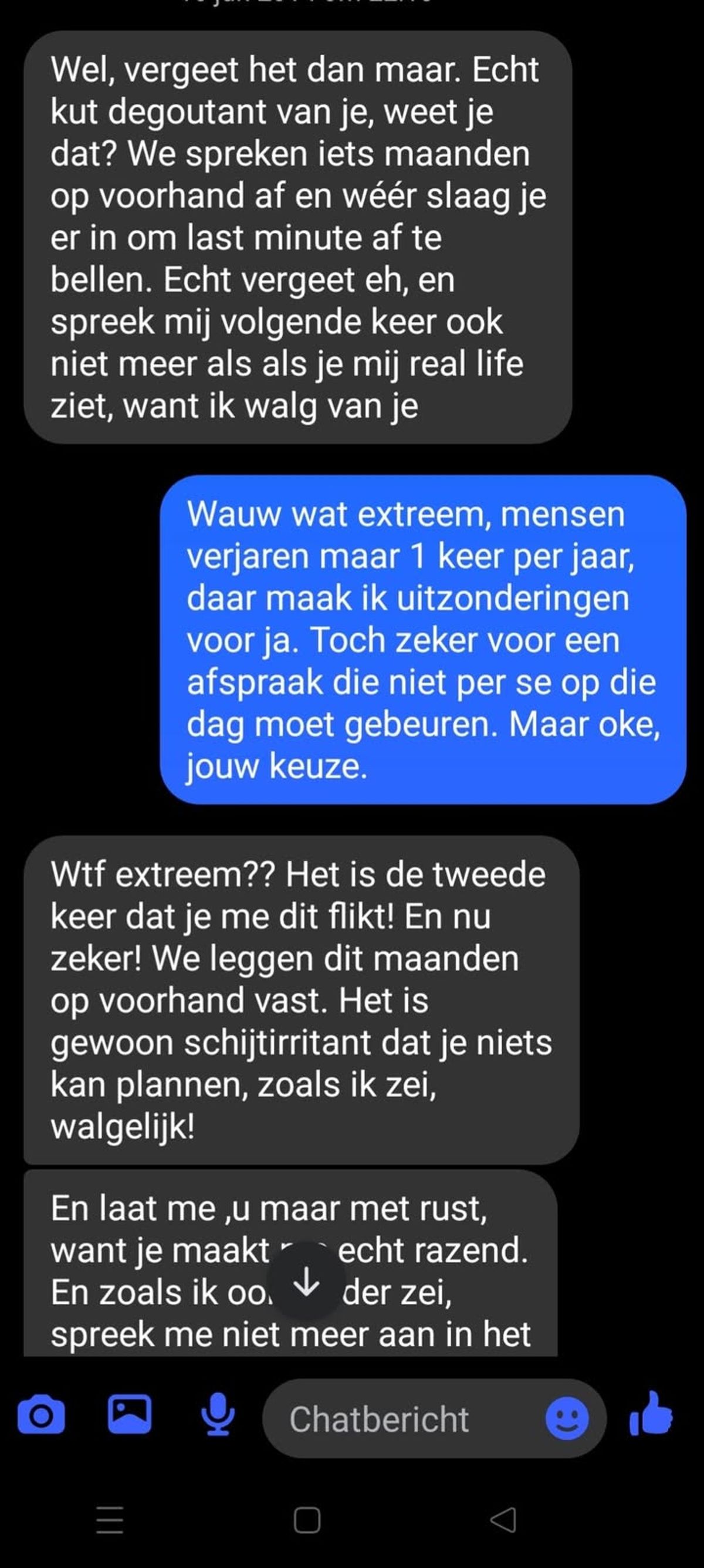 Man gaat compleet door het lint als een vrouw waar hij mee had afgesproken afzegt omdat ze naar een verjaardag van een vriend moet (3 screens)