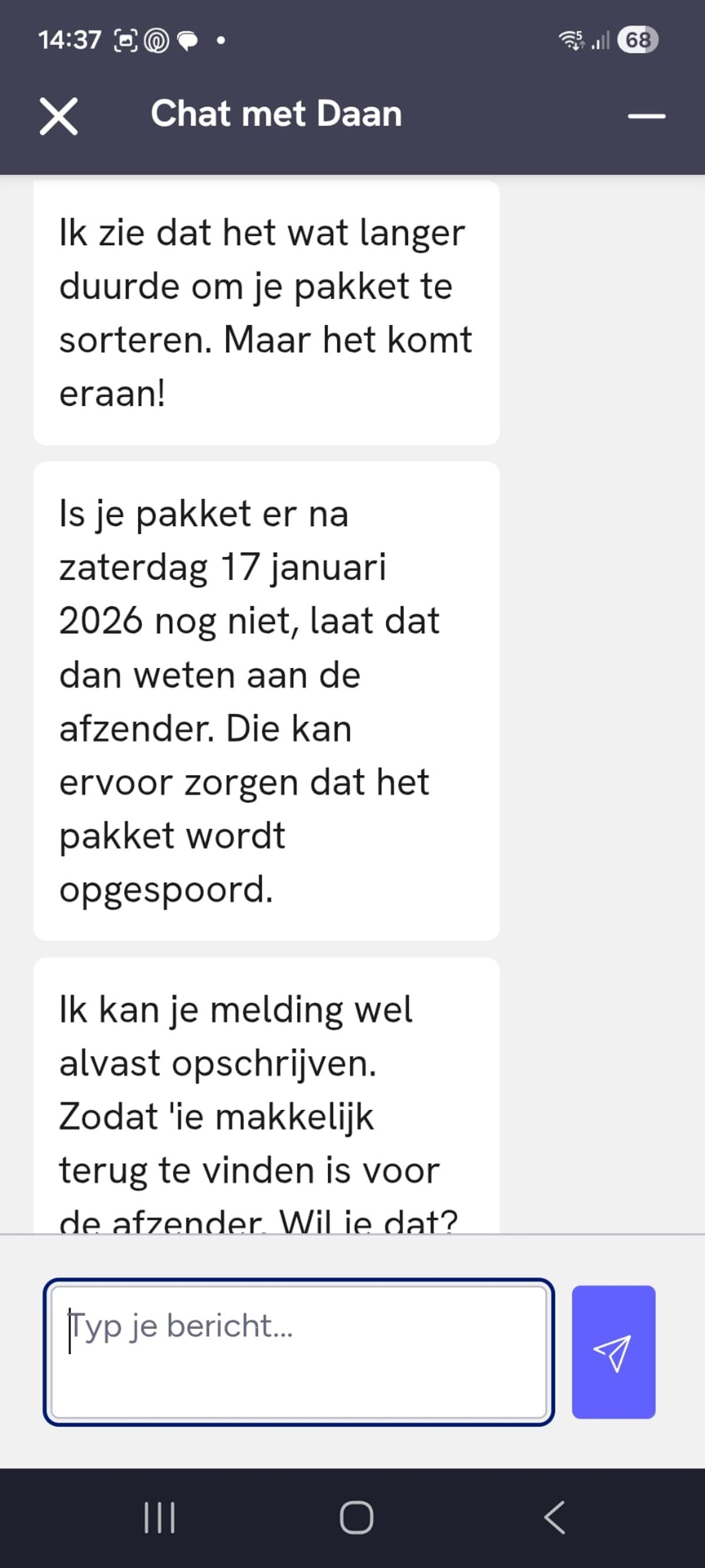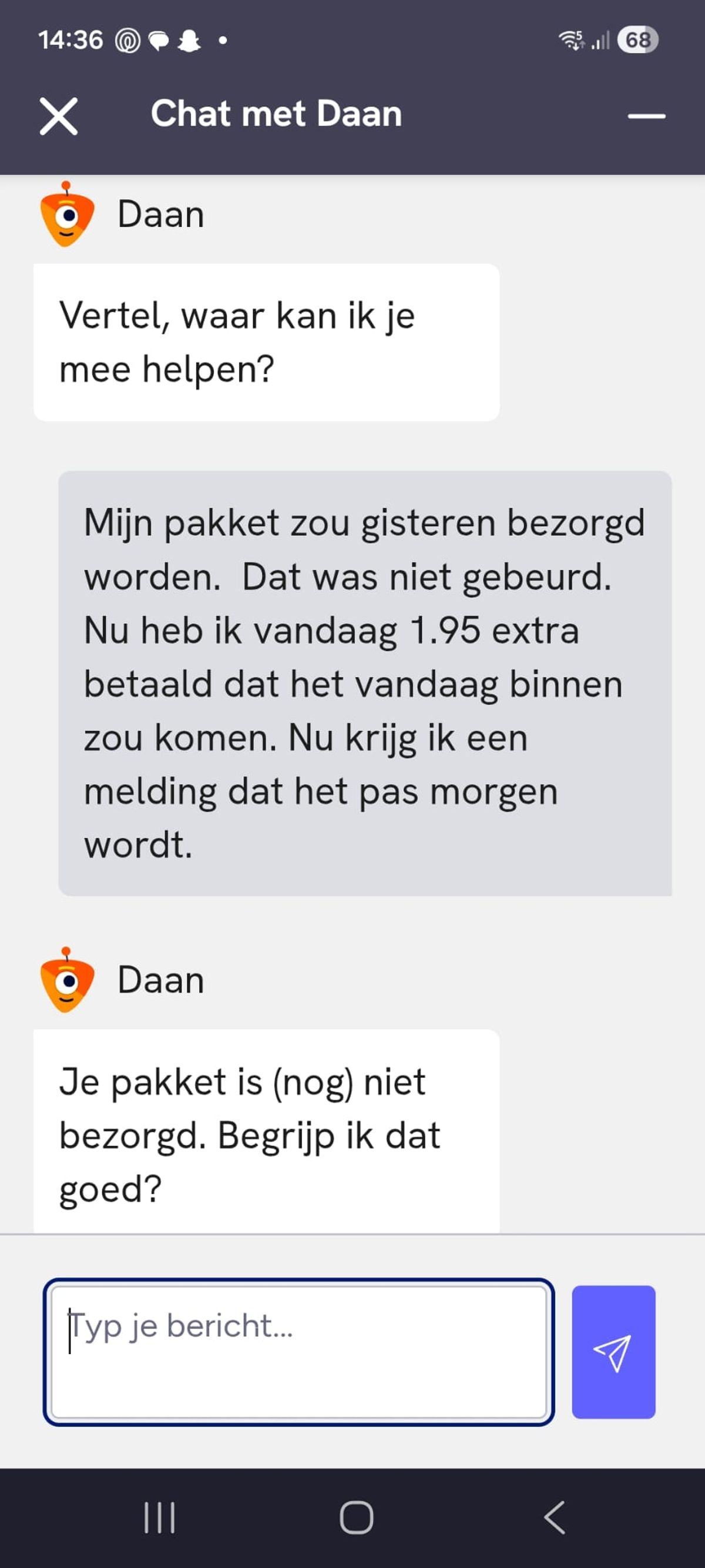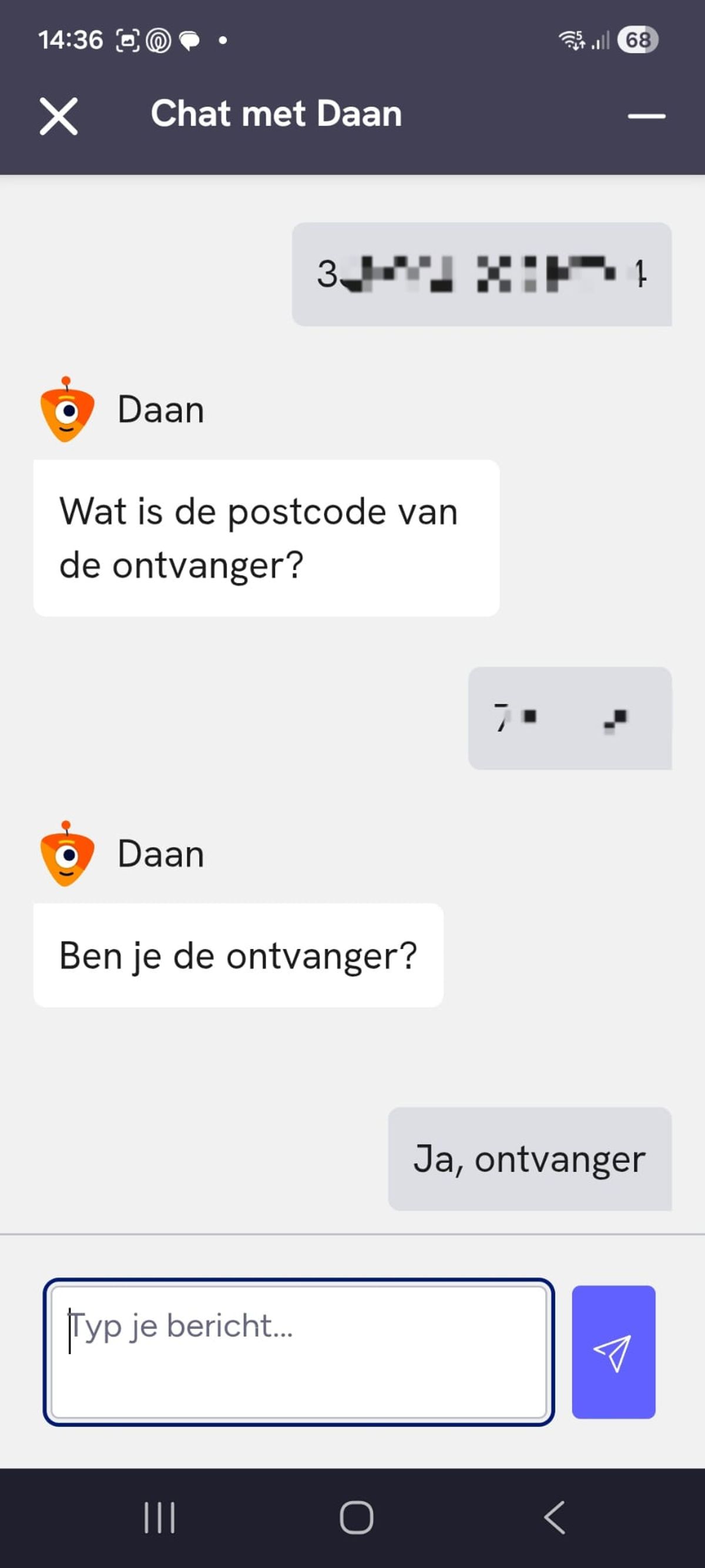 Hier weer een leuk gesprek met de klantenserice van PostNL waar je dus eigenlijk helemaal niks aan hebt (10 screens)