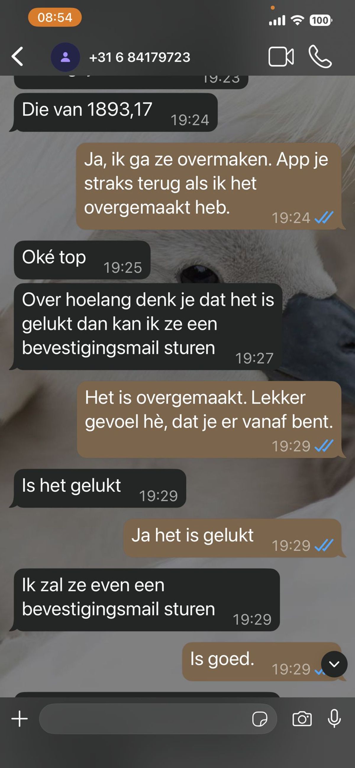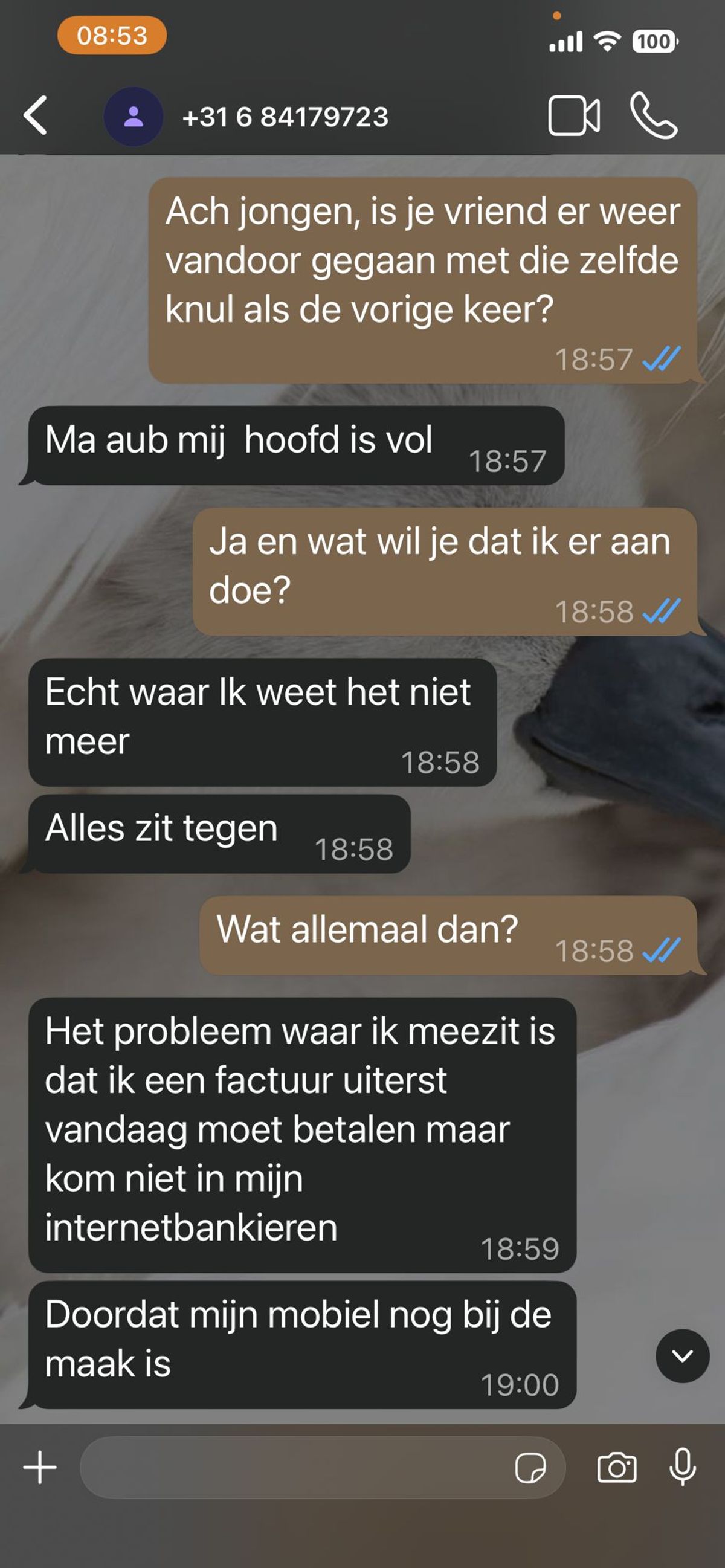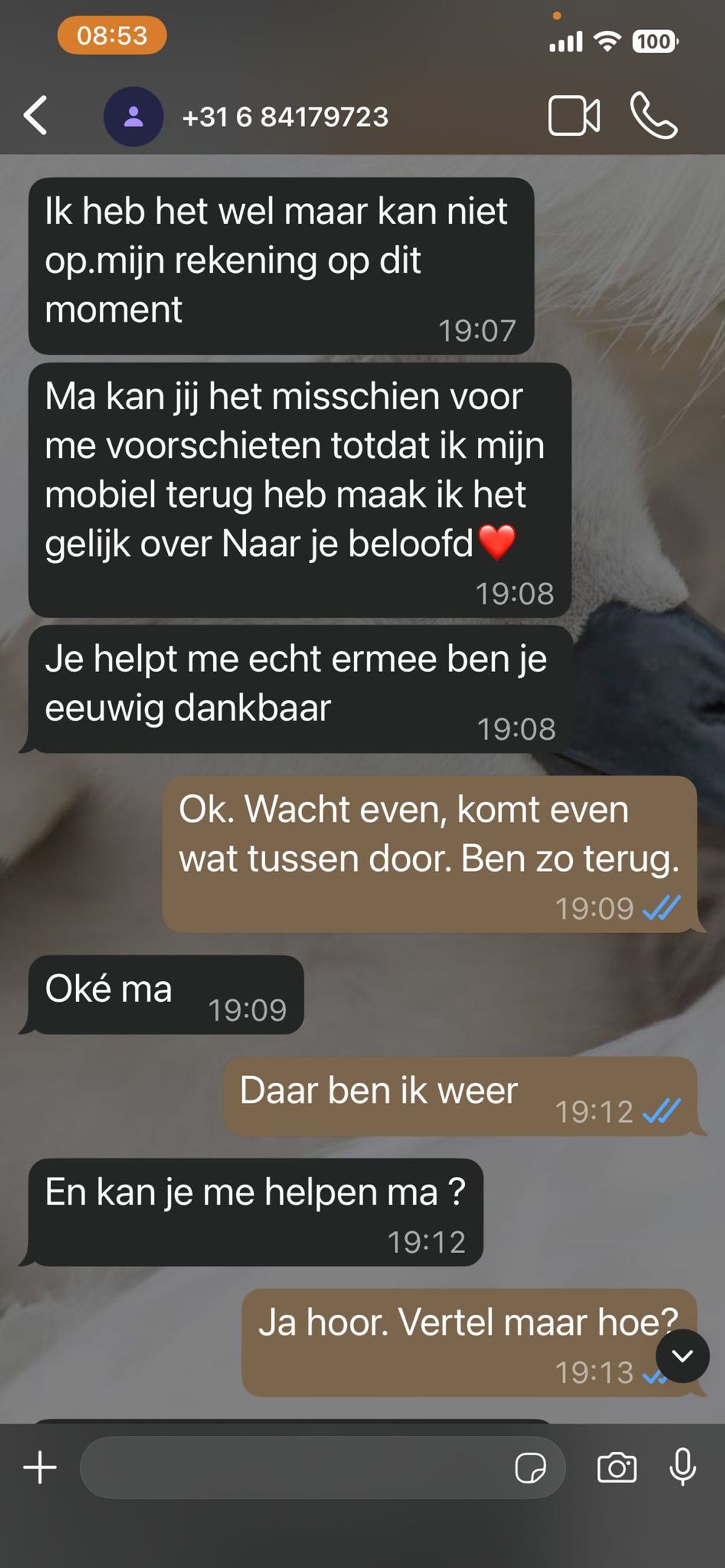 Hier weer een WhatsApp-oplichter die lekker lang aan het lijntje gehouden wordt (10 screens)