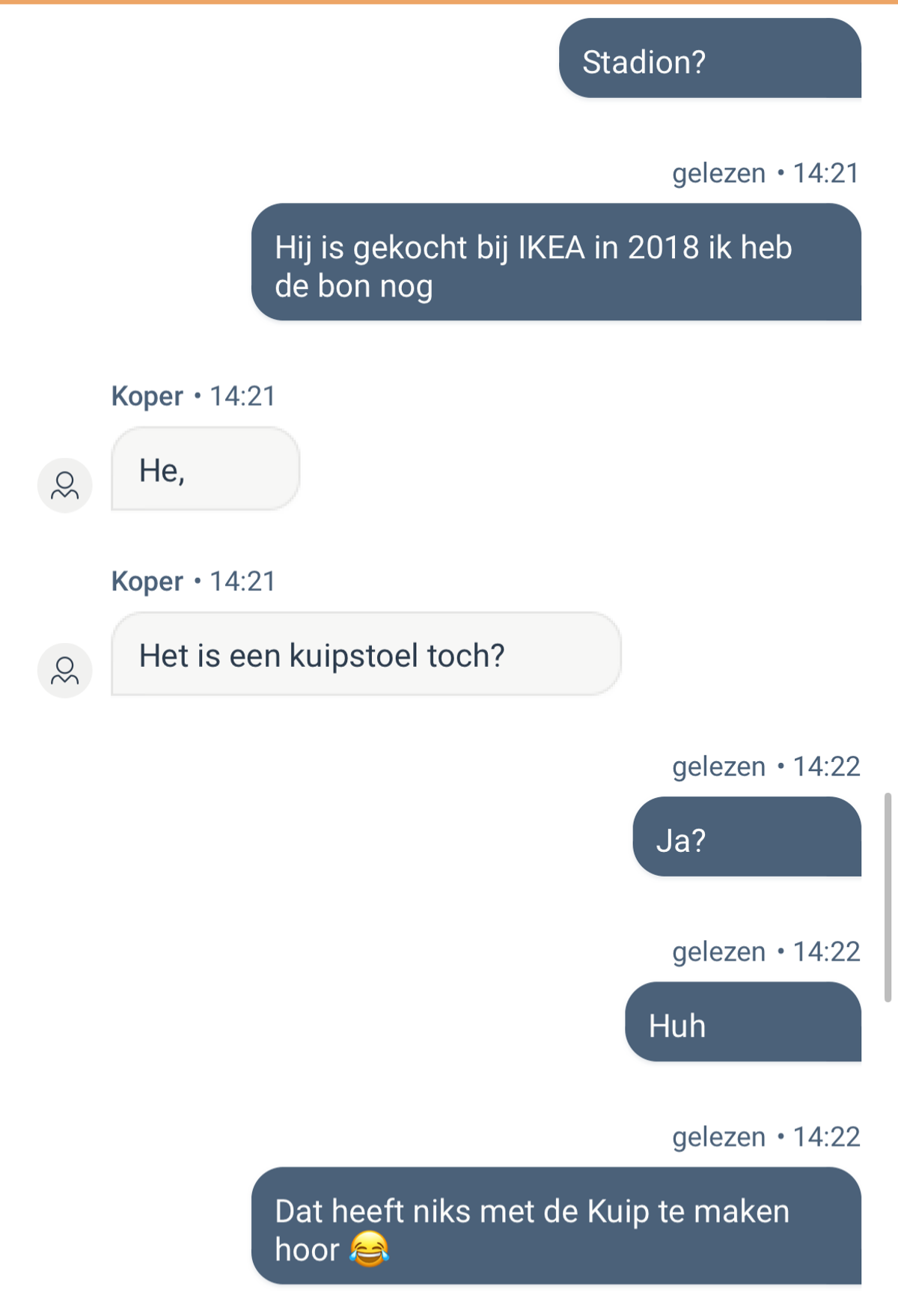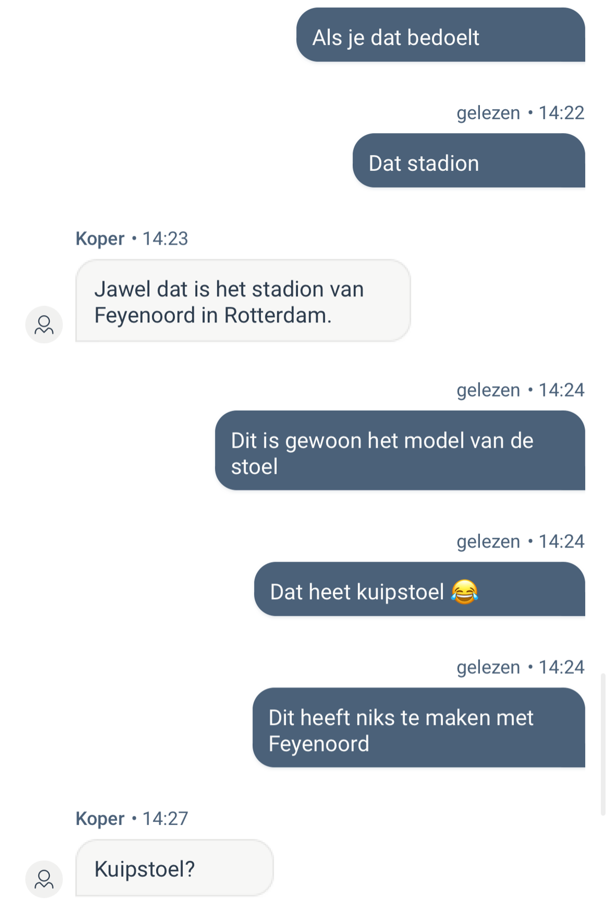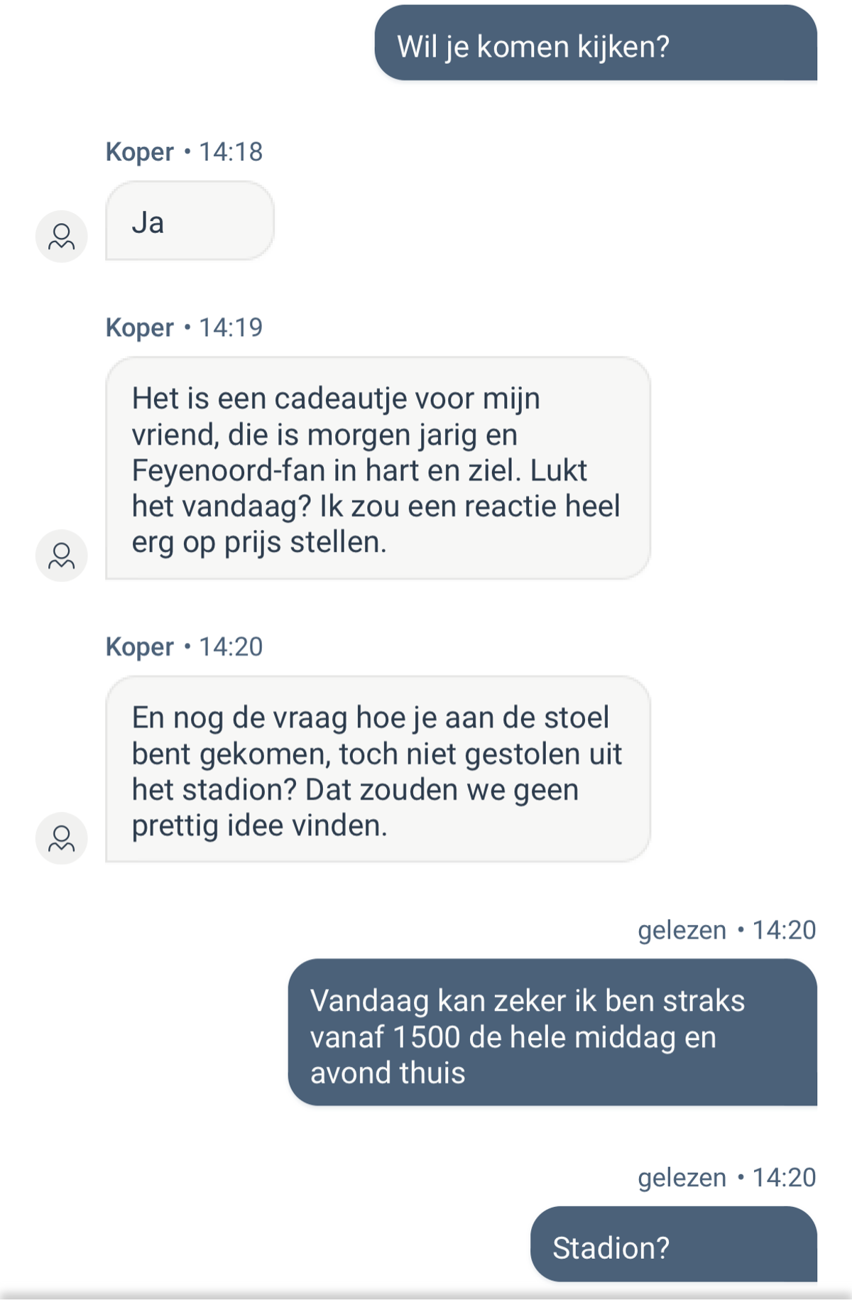 Man heeft interesse in een 'kuipstoel' van Marktplaats omdat hij denkt dat dat iets met Feyenoord te maken heeft (7 screens)