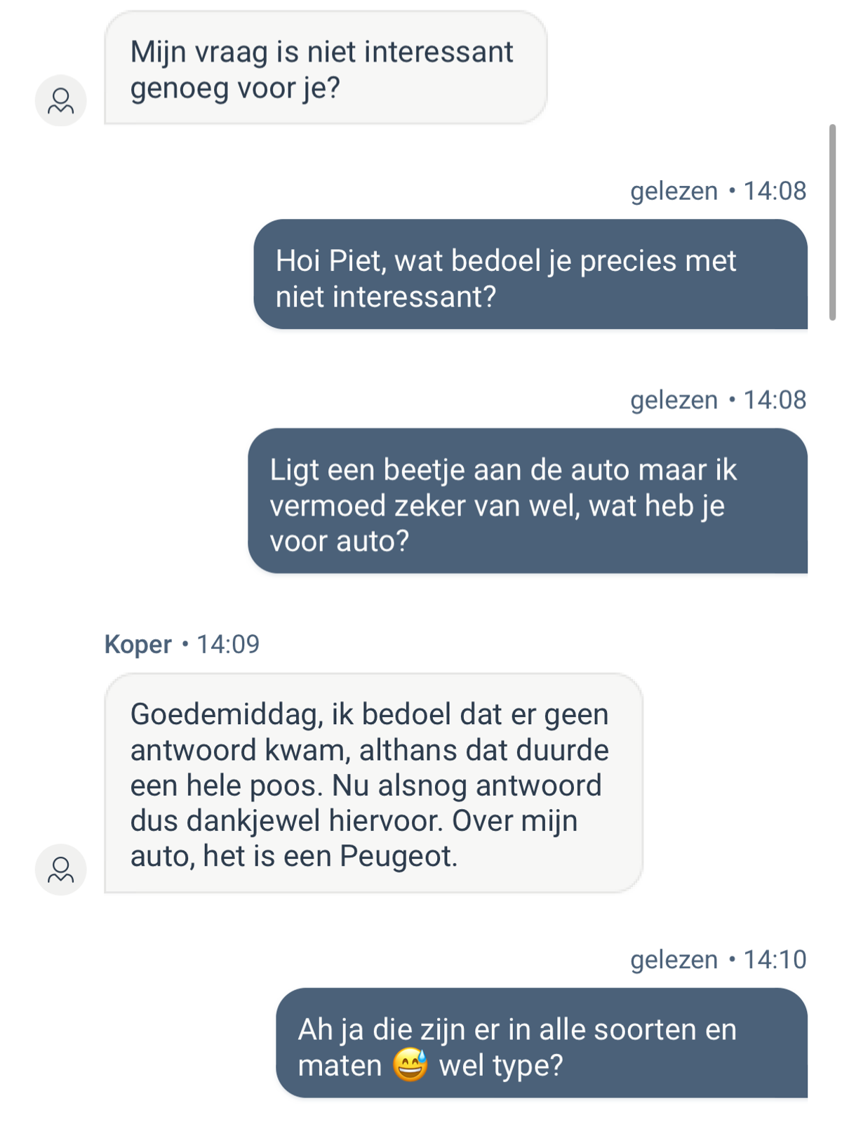 Man heeft interesse in defect cassettedeck dat gratis wordt aangeboden op Marktplaats maar als hij de verzendkosten hoort slaat de stemming meteen om (8 screens)