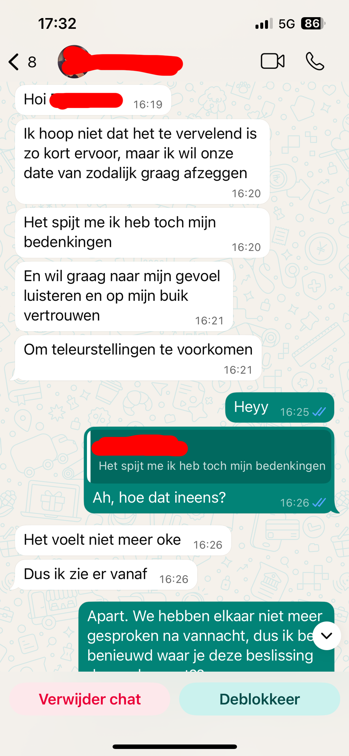 Date gaat last minute niet door omdat de dame in kwestie het gevoel heeft dat ze met een computer praat i.p.v. met een echt mens (4 screens)