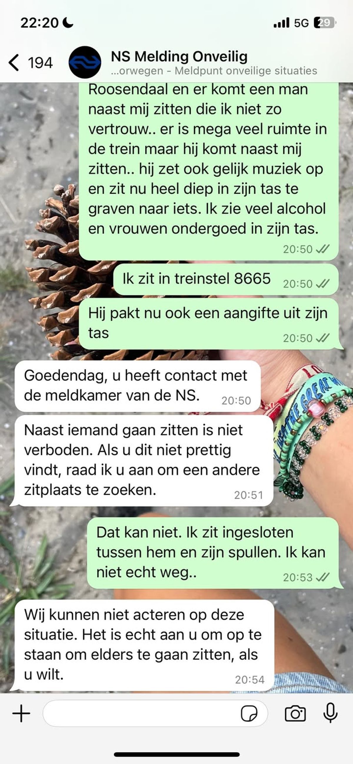 Vrouw zit ingesloten in een verder lege treincoupé naast een man met een tas vol alcohol en vrouwenondergoed die een aangifte tevoorschijn tovert en dit is de reactie van de NS-meldkamer