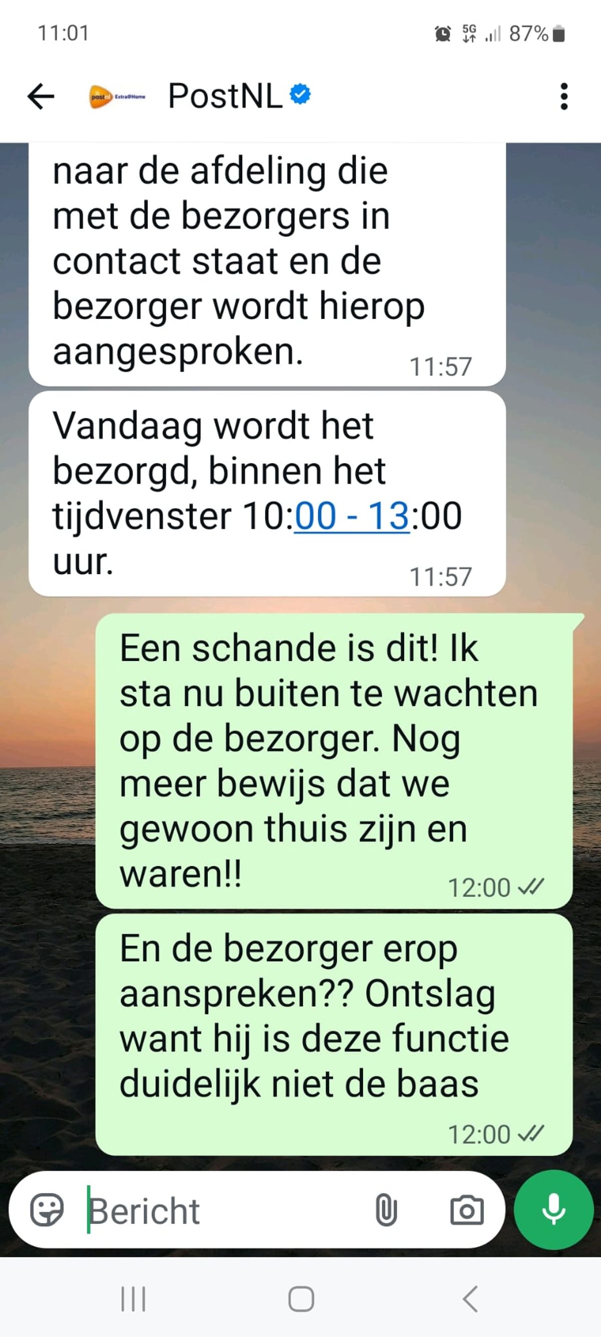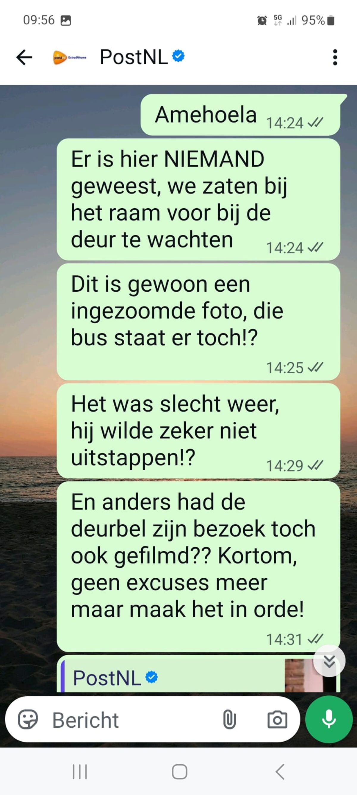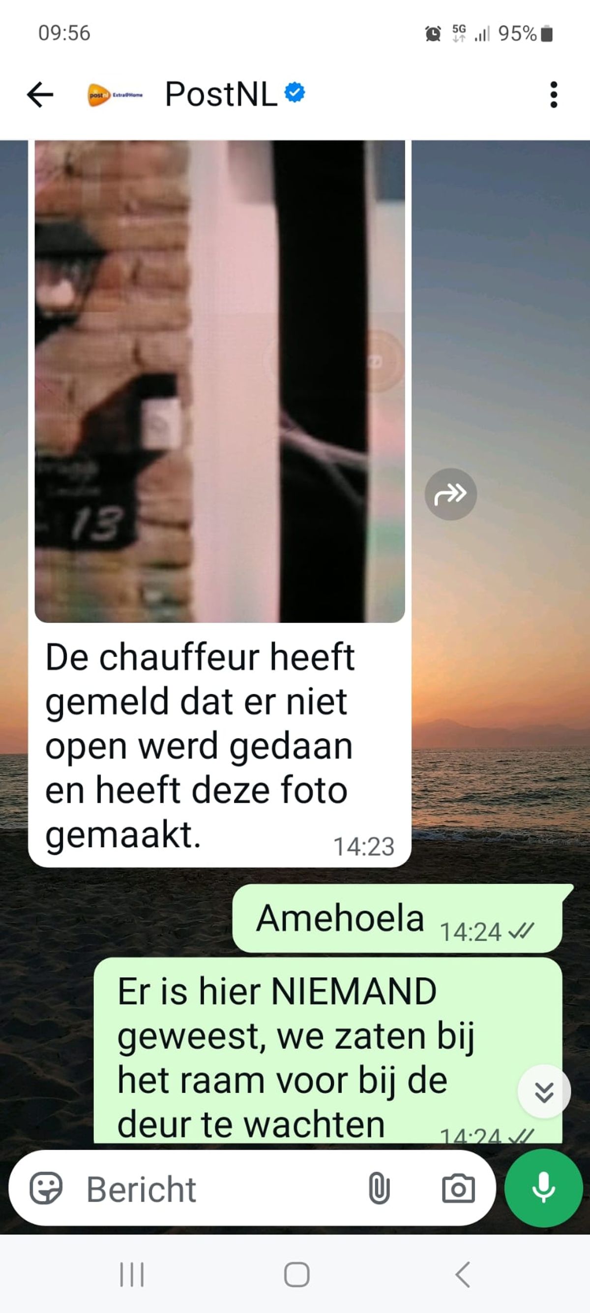 Vrouw zit de hele dag voor het raam te wachten op een PostNL-bezorger die volgens de helpdesk al had aangebeld en dit is de foto die ze meesturen als bewijs (8 screens)