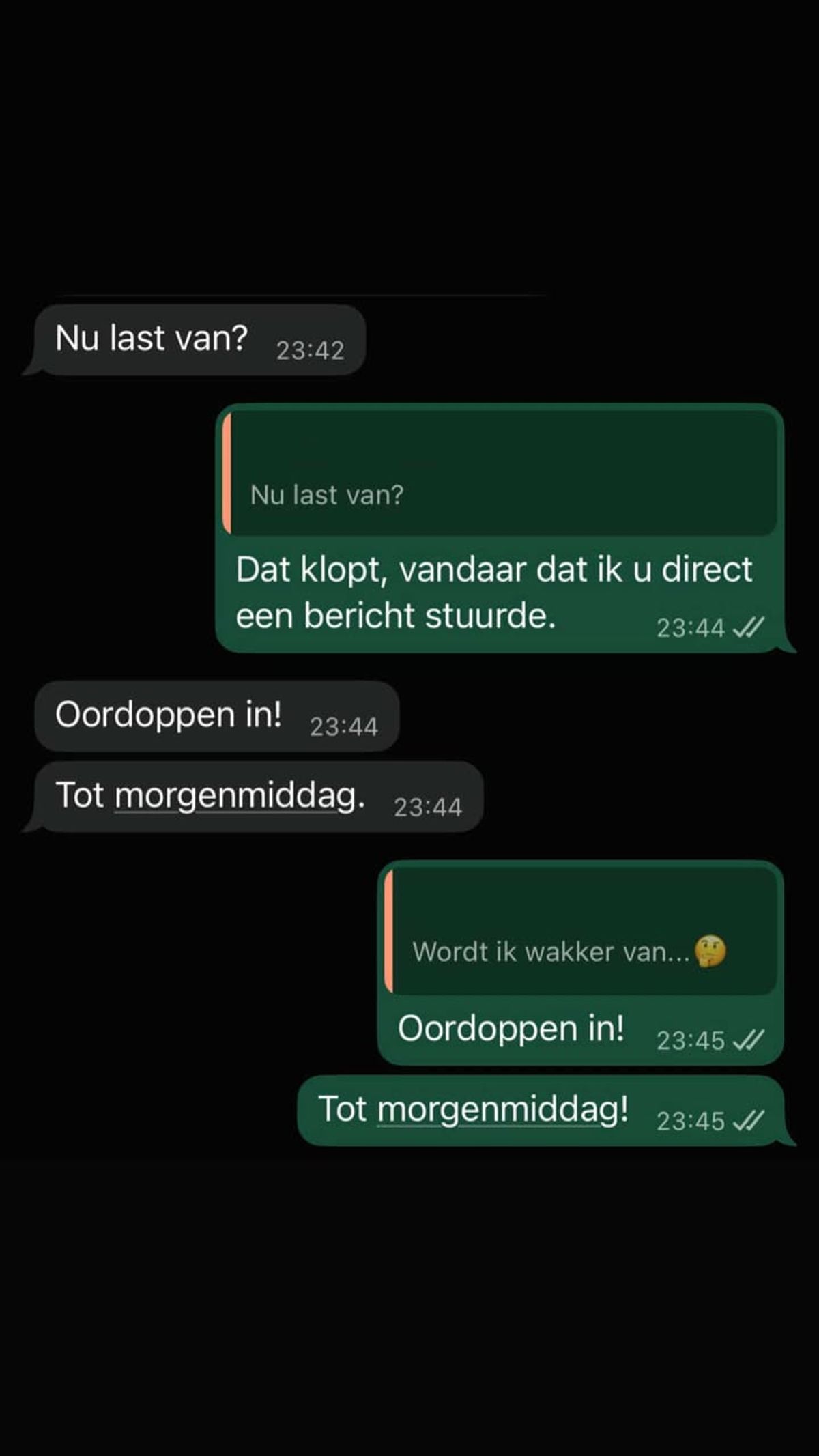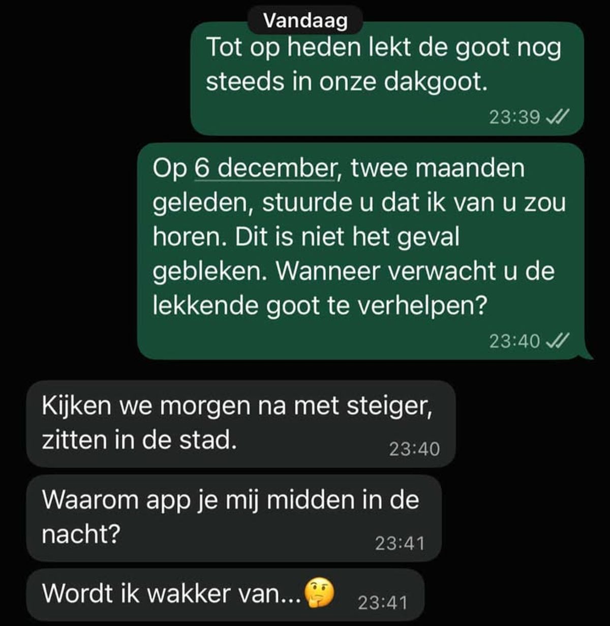 Deze pandjesbaas die nog een lekkage moet fiksen heeft liever niet dat je hem midden in de nacht wakker appt om kwart voor twaalf 's avonds (2 screens)
