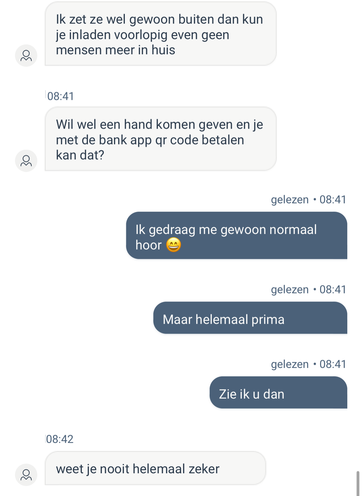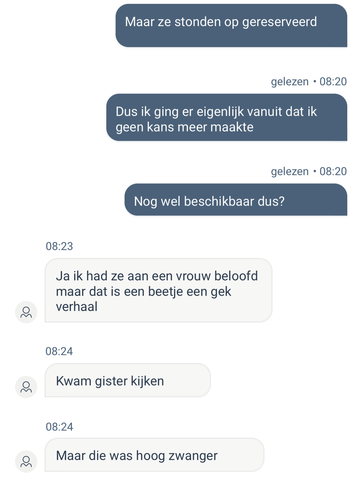 Man die barkrukken verkoopt op Marktplaats heeft nogal een bijzonder avontuur meegemaakt met een hoogzwangere vrouw die langskwam om ze uit te proberen (6 screens)