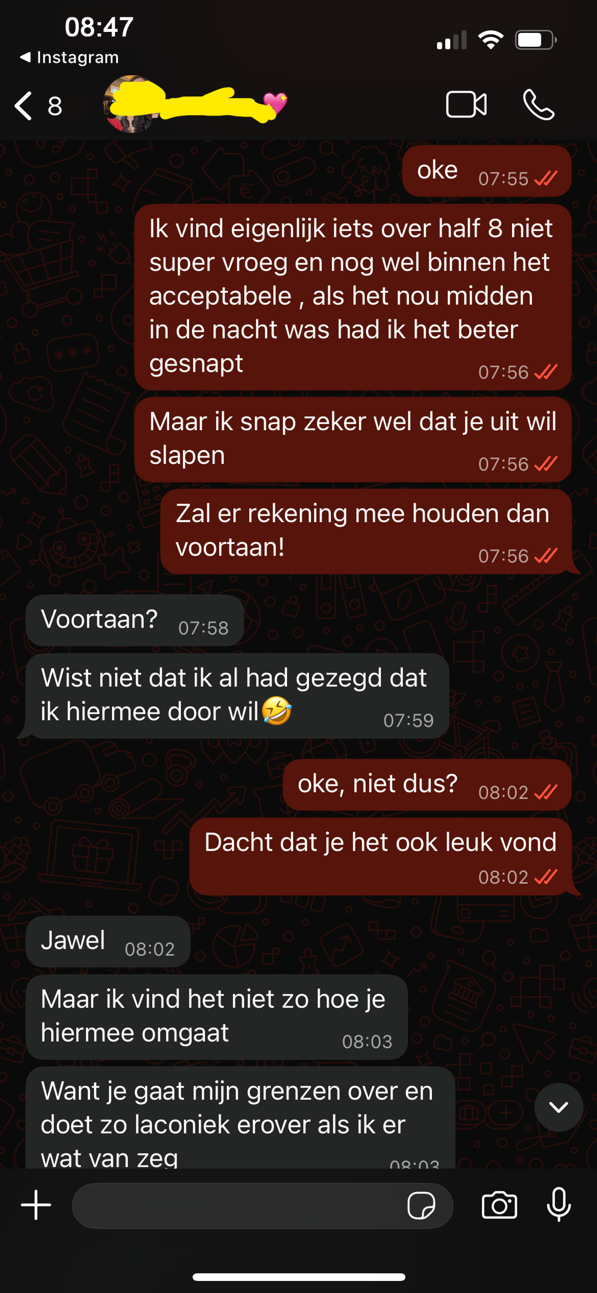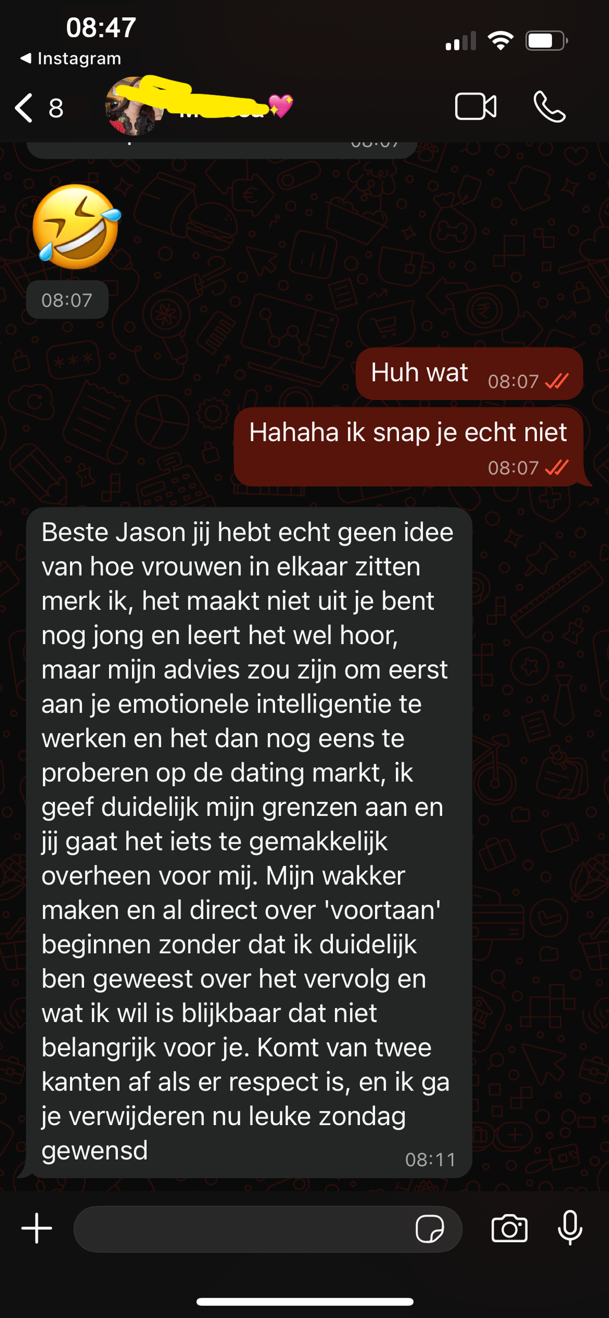 Jongen stuurt zijn Valentijnsdate iets te vroeg een appje waardoor ze blijkbaar wakker is geworden en dat is voor haar een prima reden om het contact meteen weer te verbreken (5 screens)