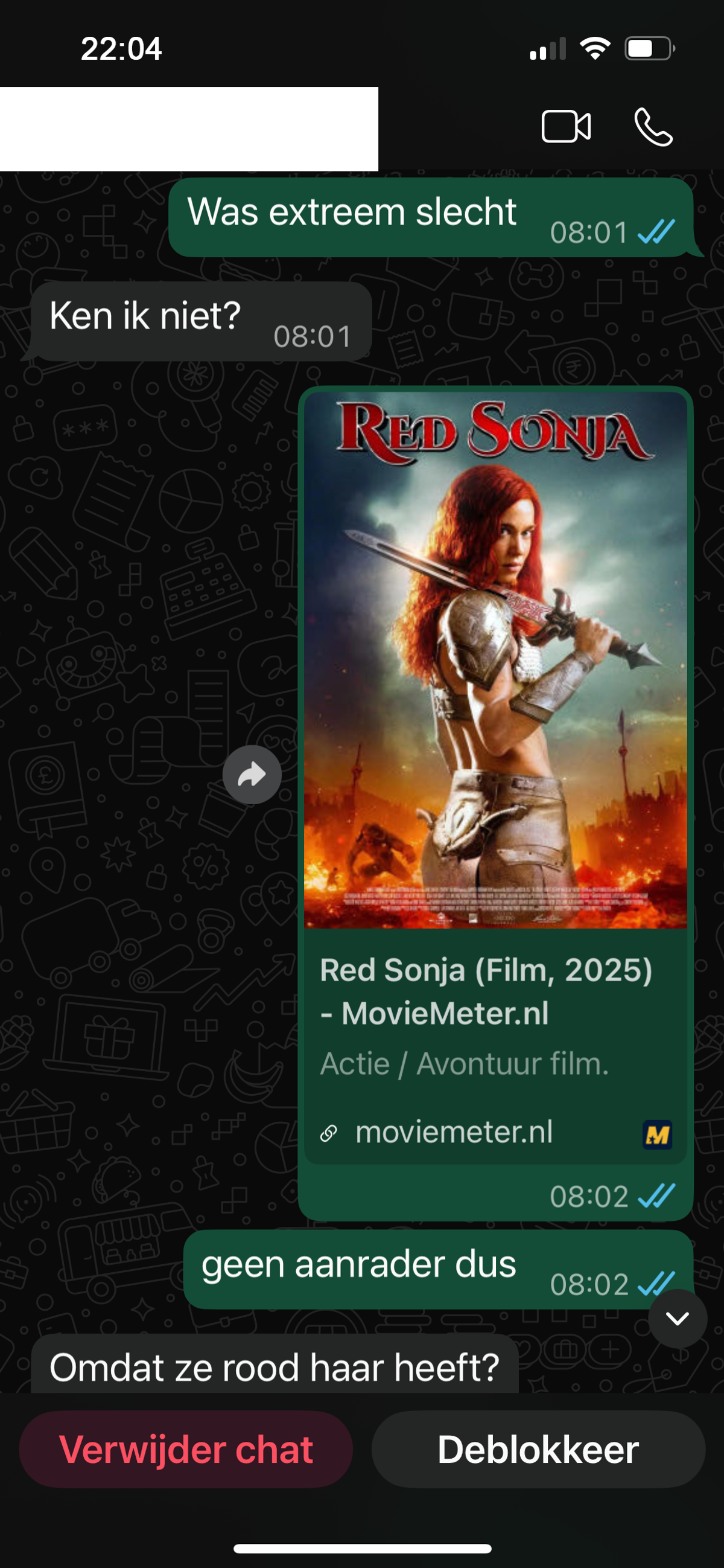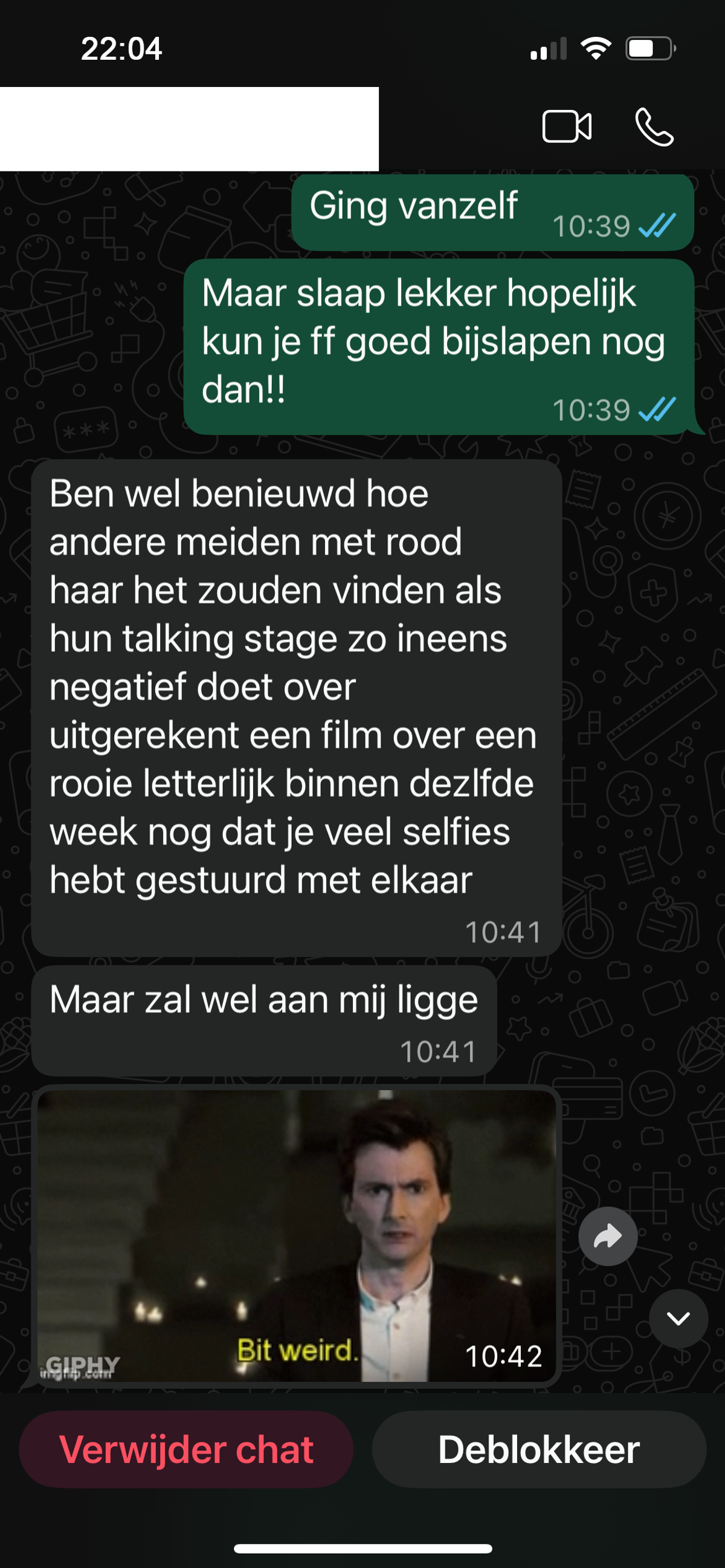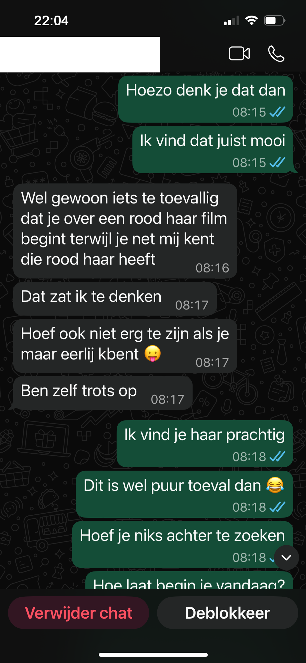 Man heeft leuk app-contact met een roodharige vrouw maar als hij een film kijkt over een roodharige vrouw die hij heel slecht vindt zijn de rapen ineens gaar (9 screens)
