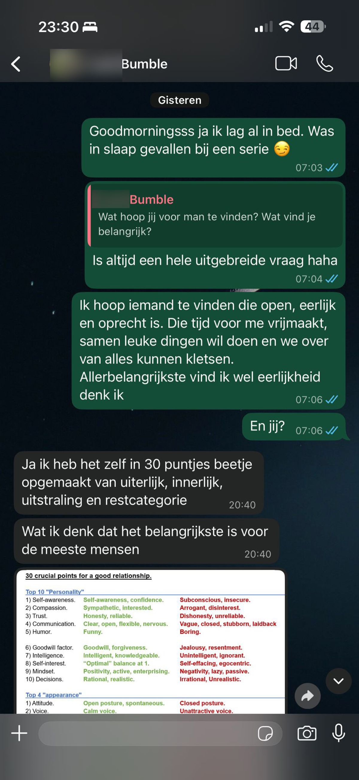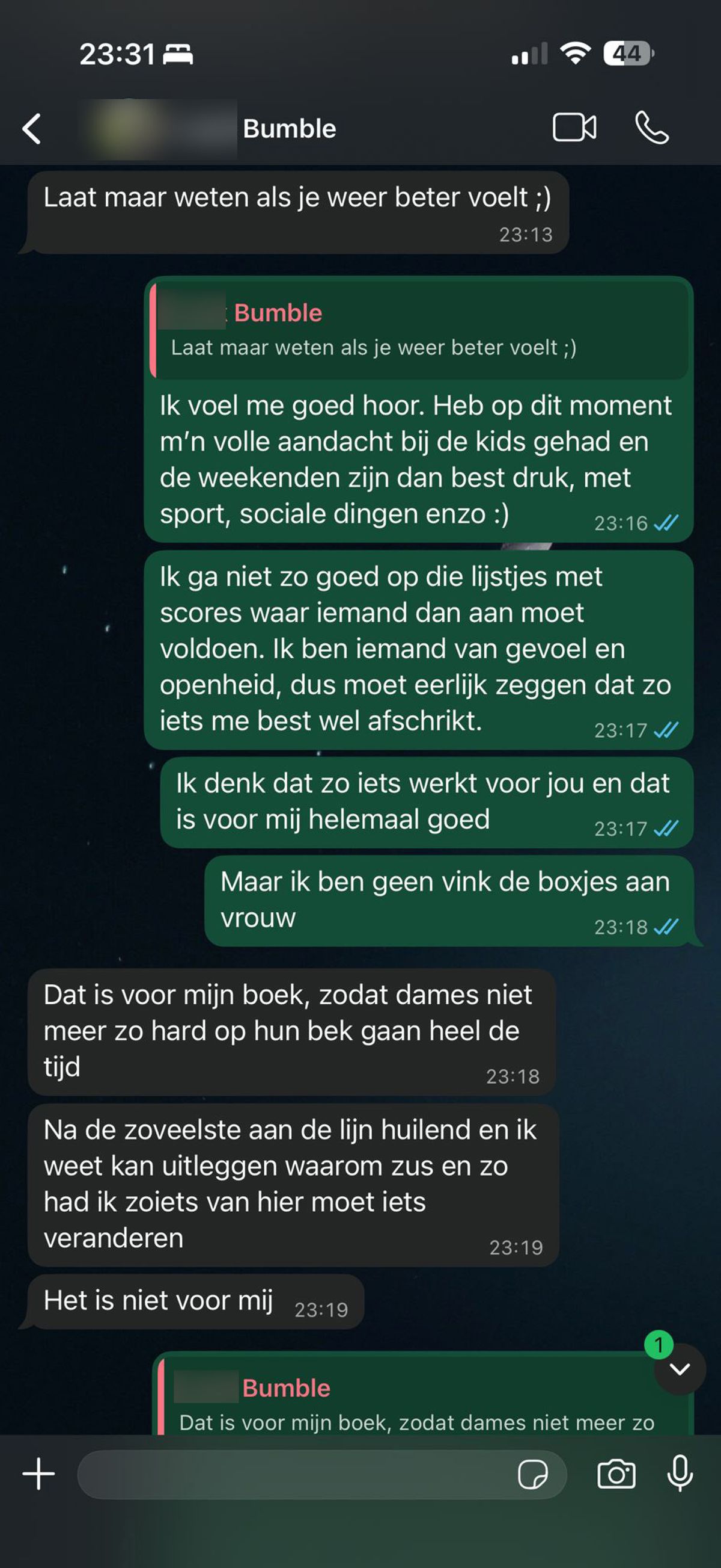 Bij deze ongeduldige Bumble-match moet je het niet in je hoofd halen om even een paar minuten je telefoon weg te leggen... (4 screens)