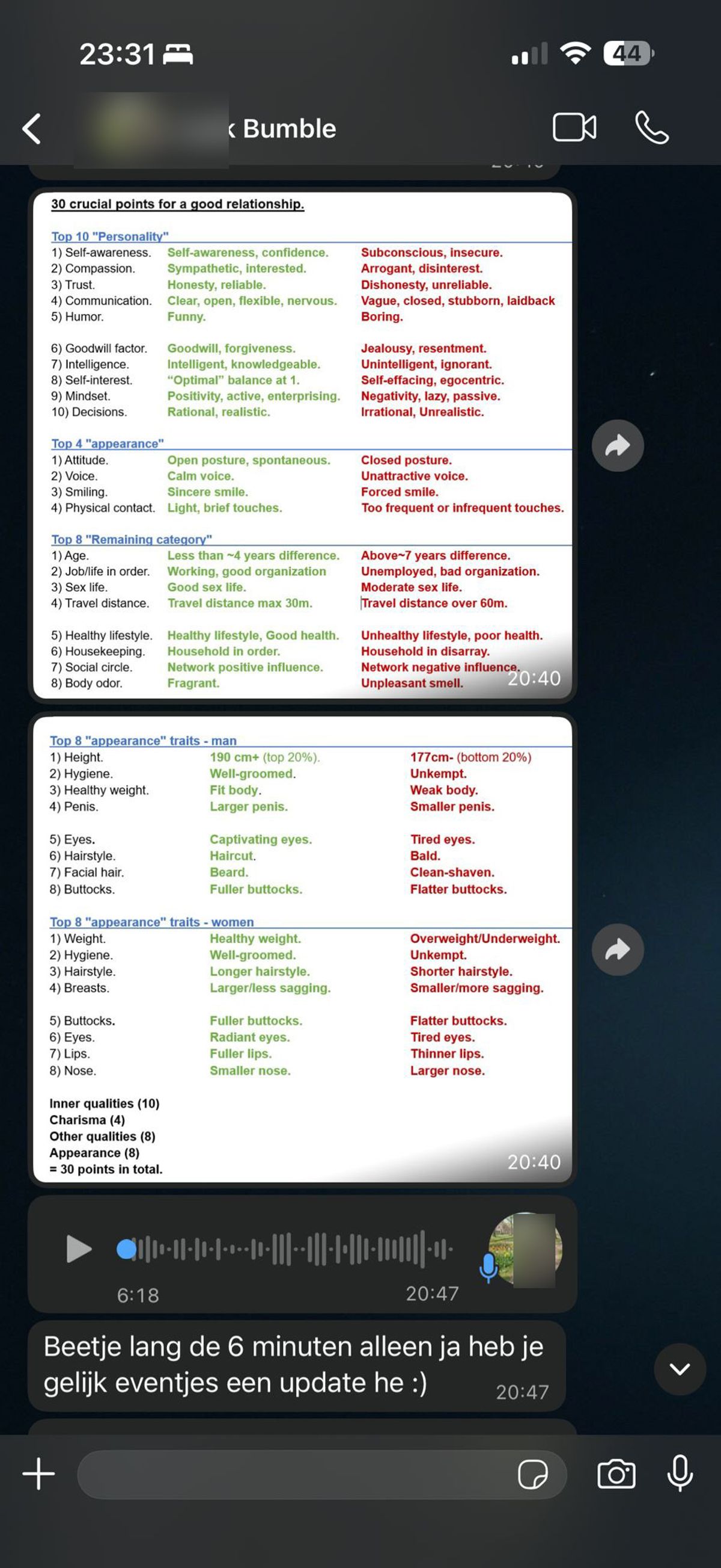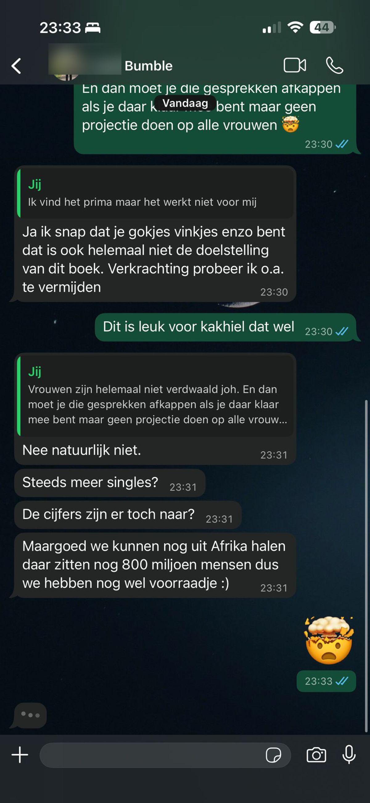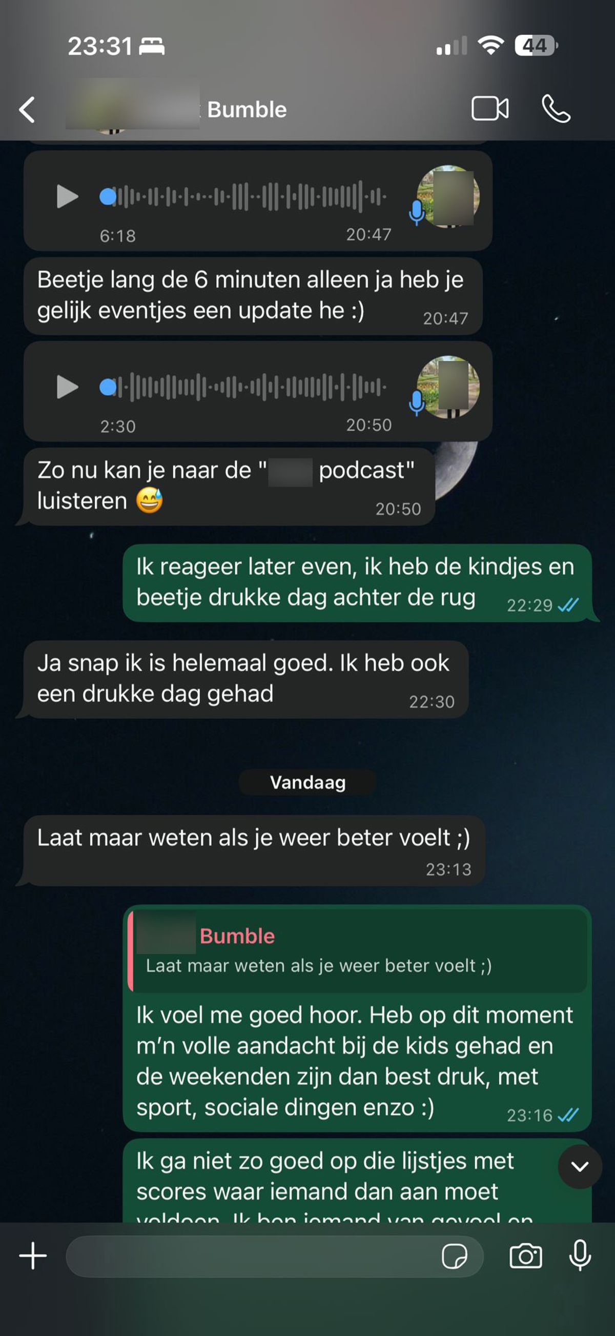 Gast van Bumble gooit meteen z'n hele levensverhaal in een voice note op WhatsApp en reageert nogal beledigd als zijn date geen interesse meer in hem heeft (5 screens)