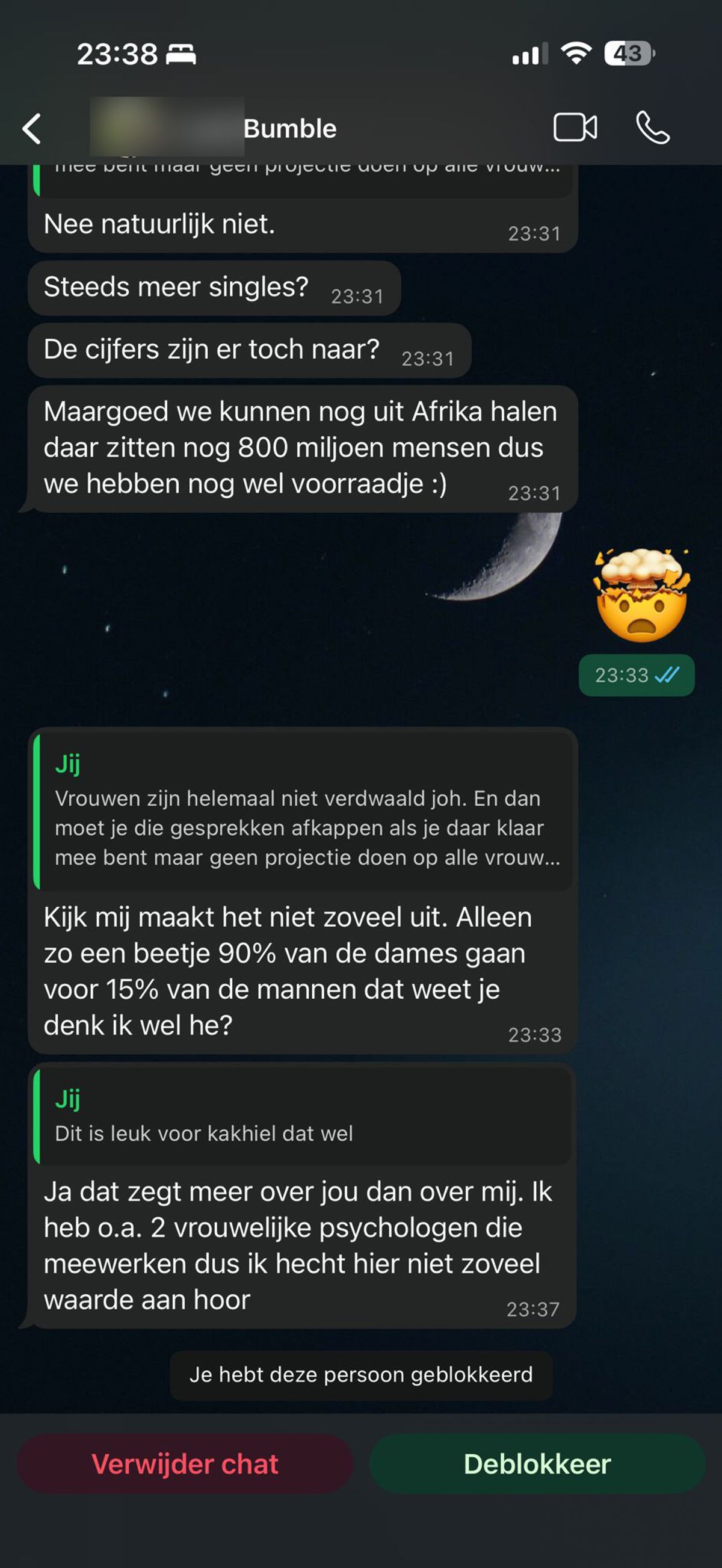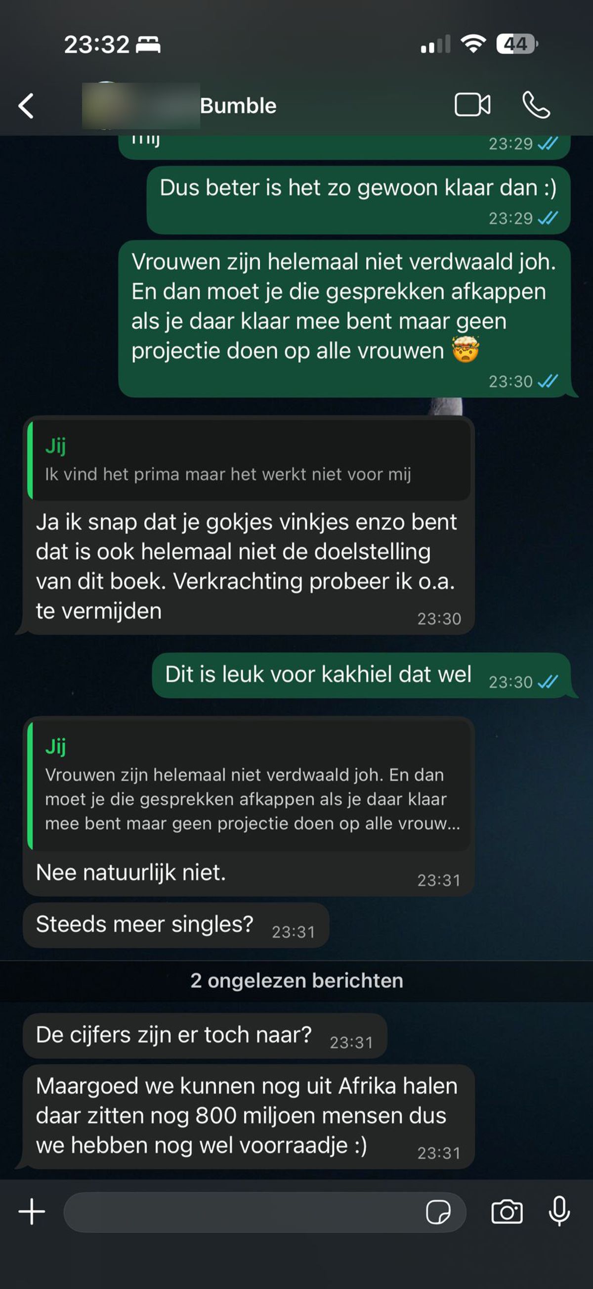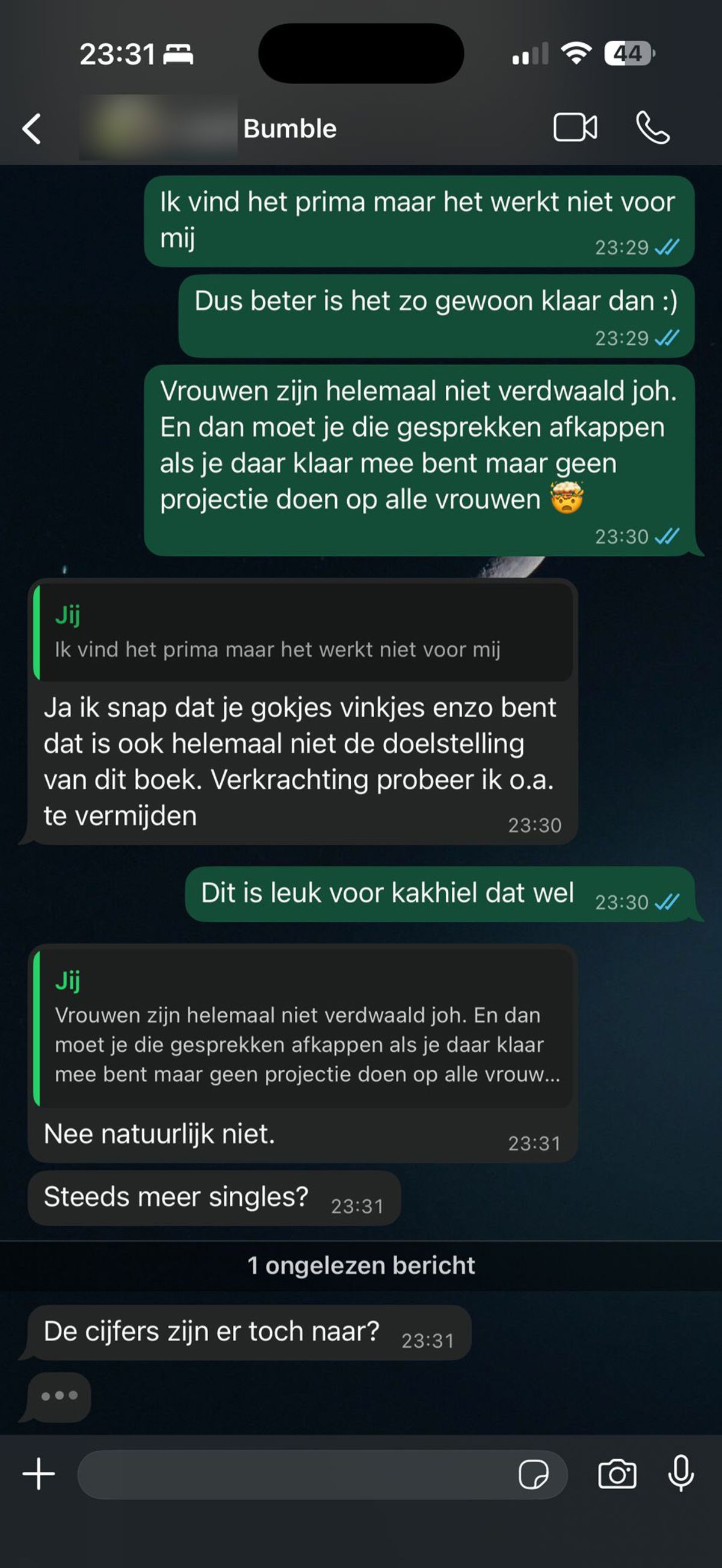 Gast van Bumble gooit meteen z'n hele levensverhaal in een voice note op WhatsApp en reageert nogal beledigd als zijn date geen interesse meer in hem heeft (5 screens)