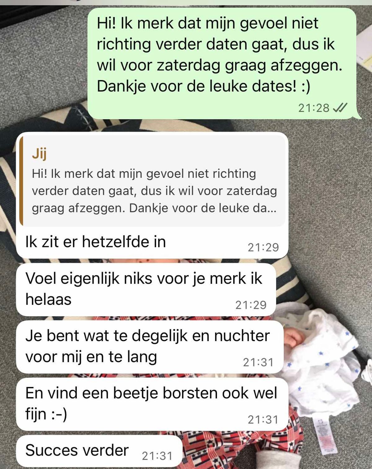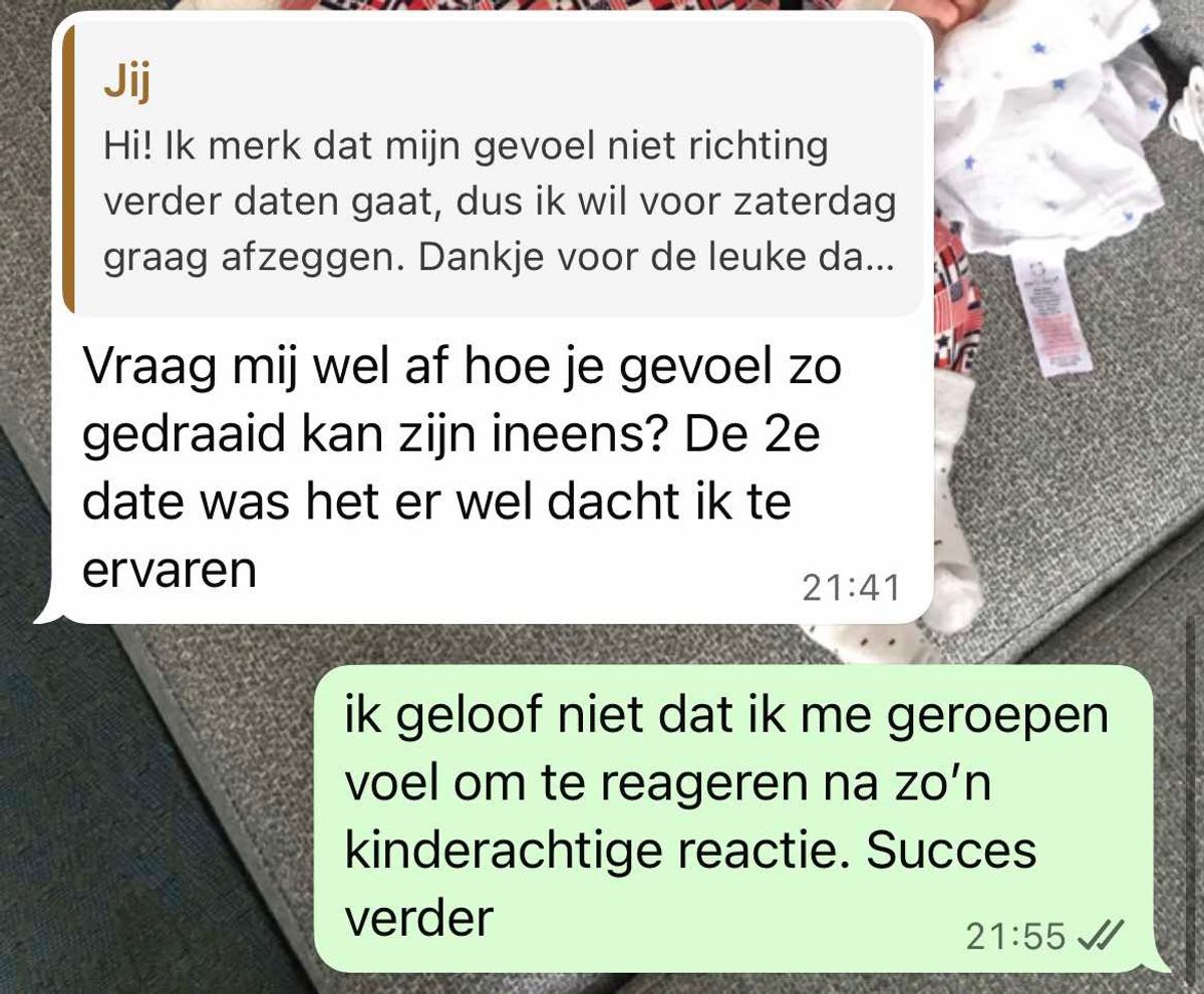 Hier de meest kinderachtige reactie die je als man kunt geven wanneer een vrouw besluit om er er na 3 dates mee te stoppen (2 screens)