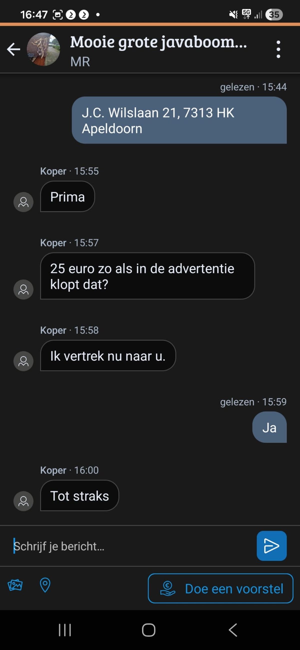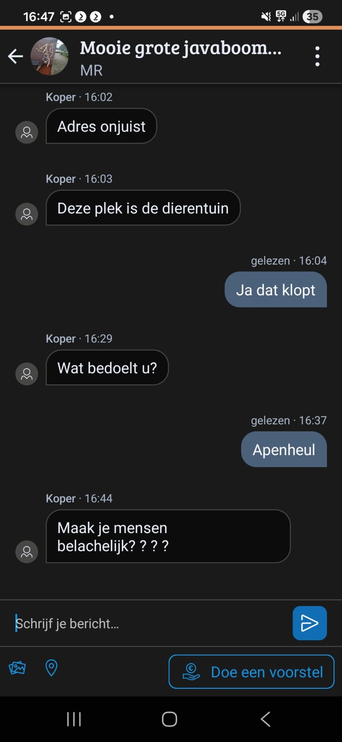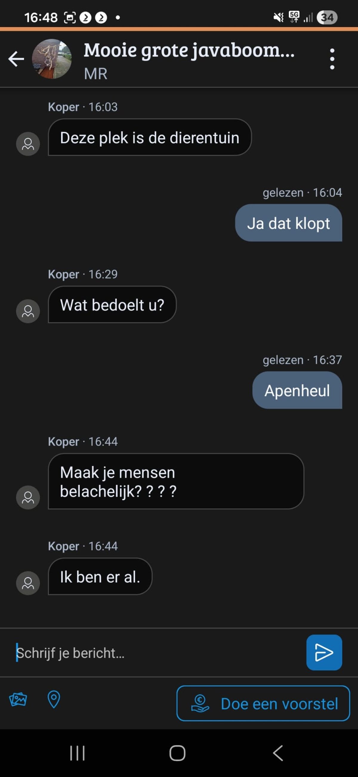 Man brengt een belachelijk laag bod uit op een javaboom op Marktplaats en krijgt voor de grap het adres van de Apenheul waar hij vervolgens ook echt helemaal naartoe rijdt (7 screens)