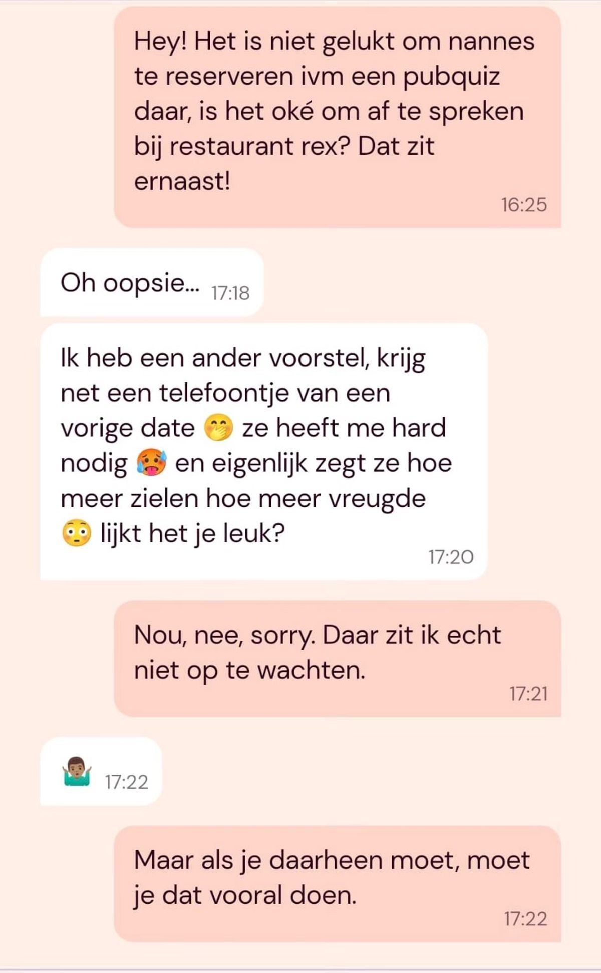 Gast zegt last minute date af omdat hij een booty call heeft gekregen van zijn vorige date en komt meteen met een bizar voorstel (3 screens)