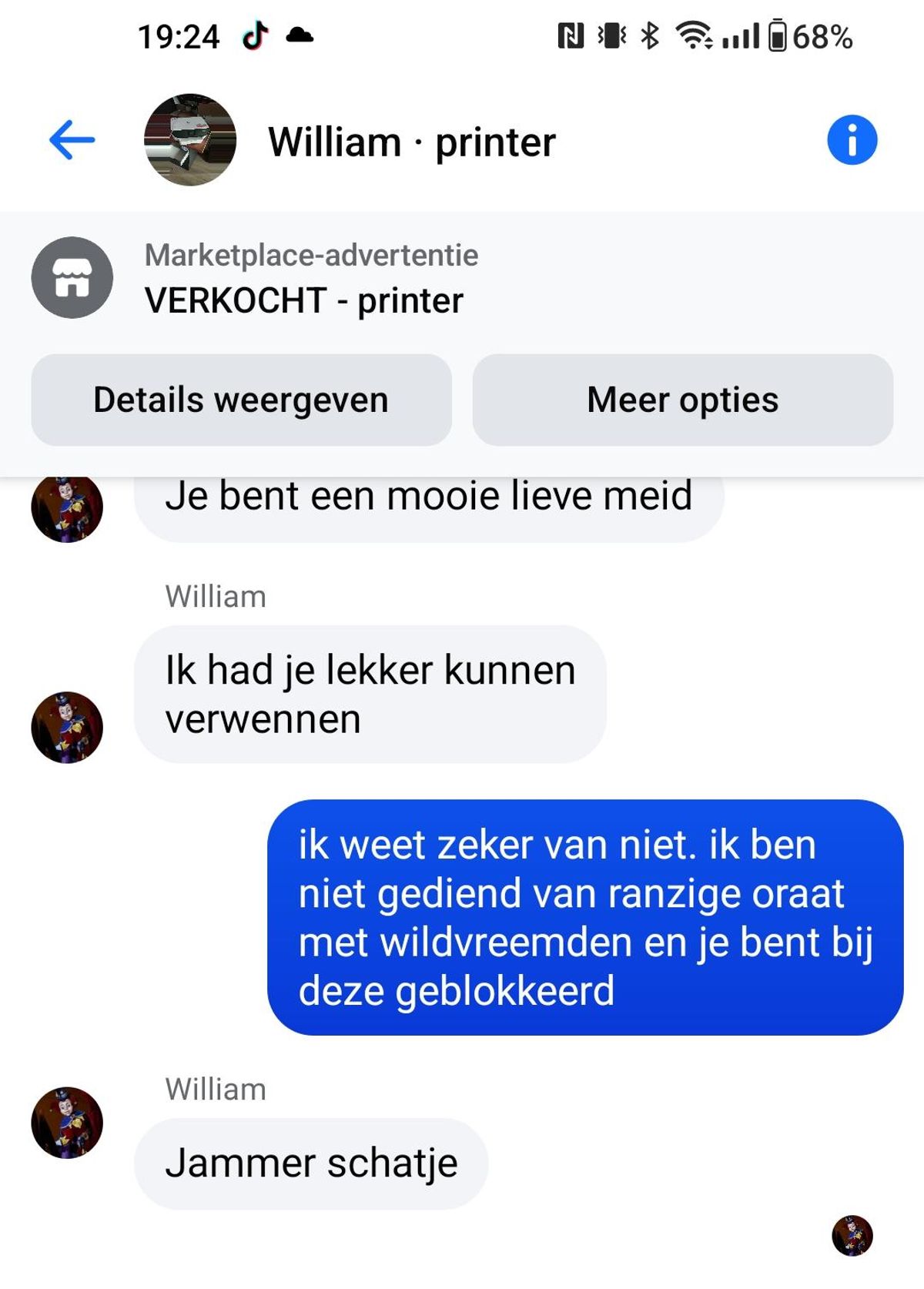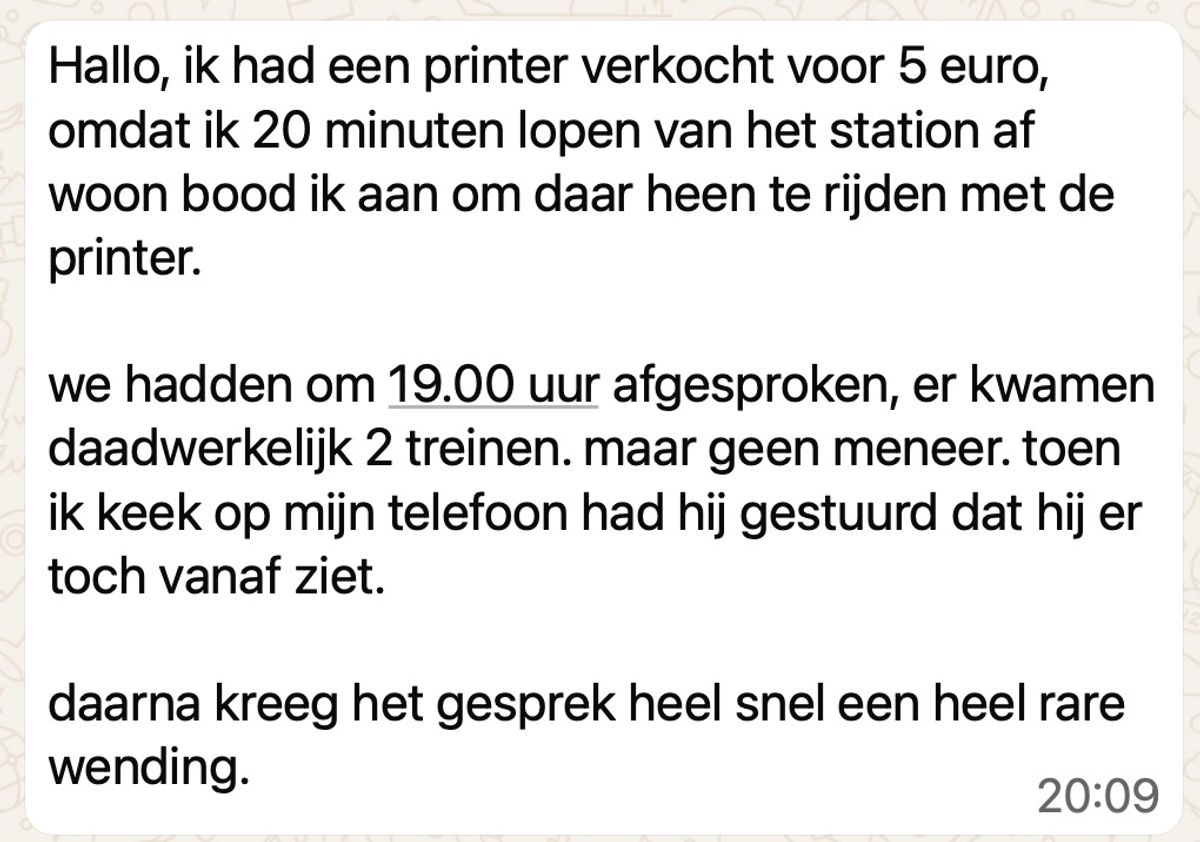 Vrouw wil printer verkopen aan een gast die hem zogenaamd op komt halen met de trein maar dan gebeurt er dit (11 screens)