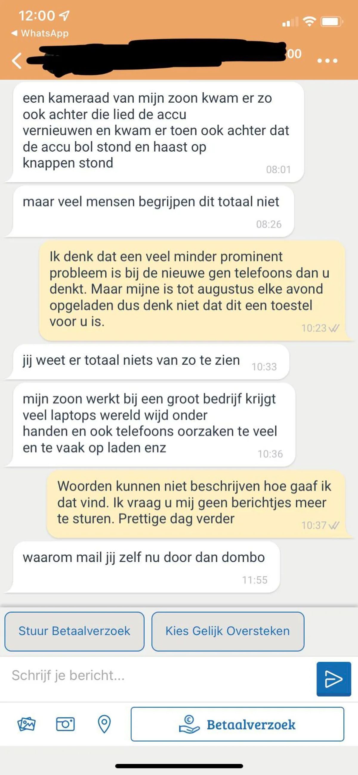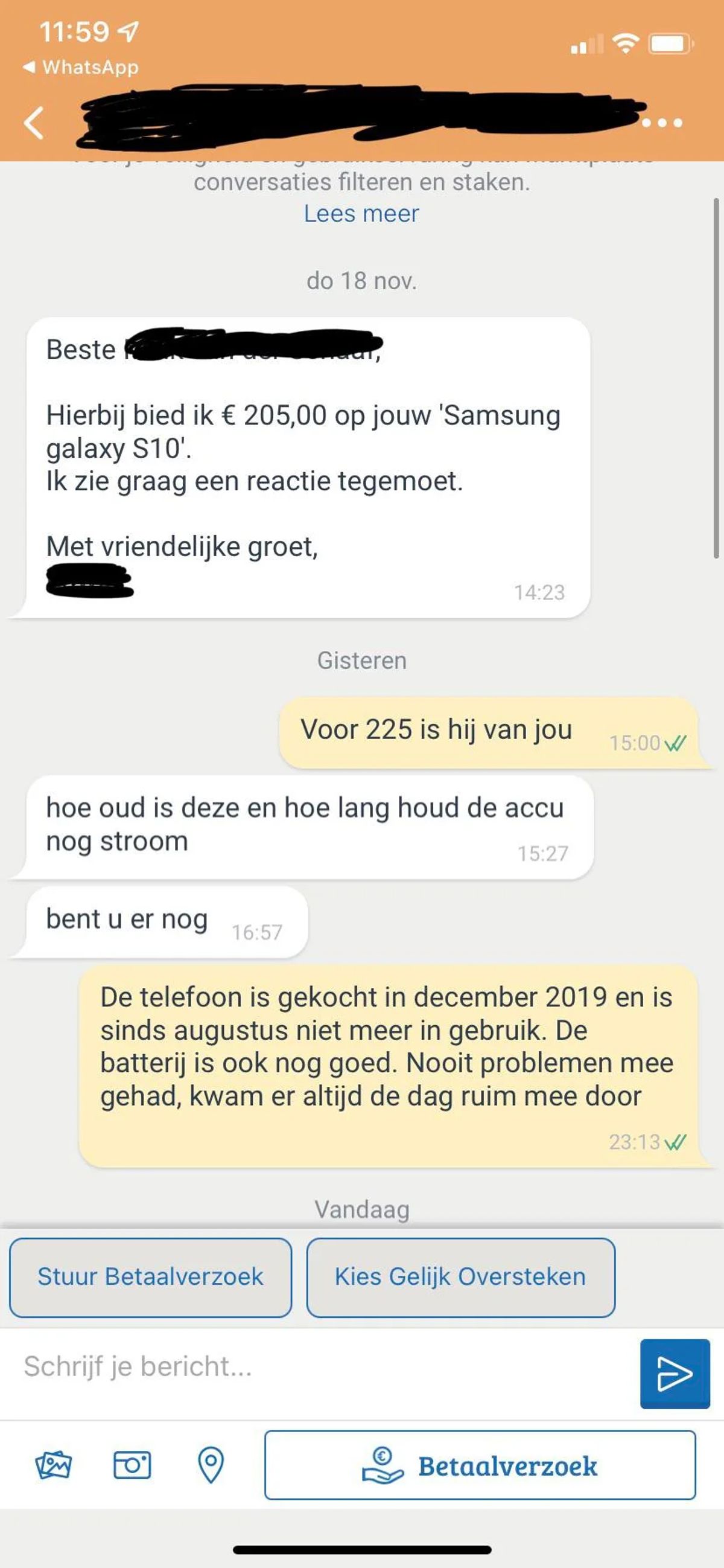 Man wil Samsung-telefoon kopen bij iemand op Marktplaats maar zijn manier van communiceren is niet bepaald vriendelijk te noemen (3 screens)