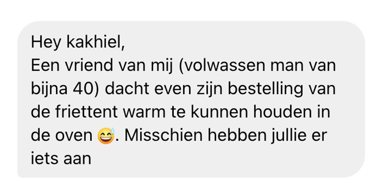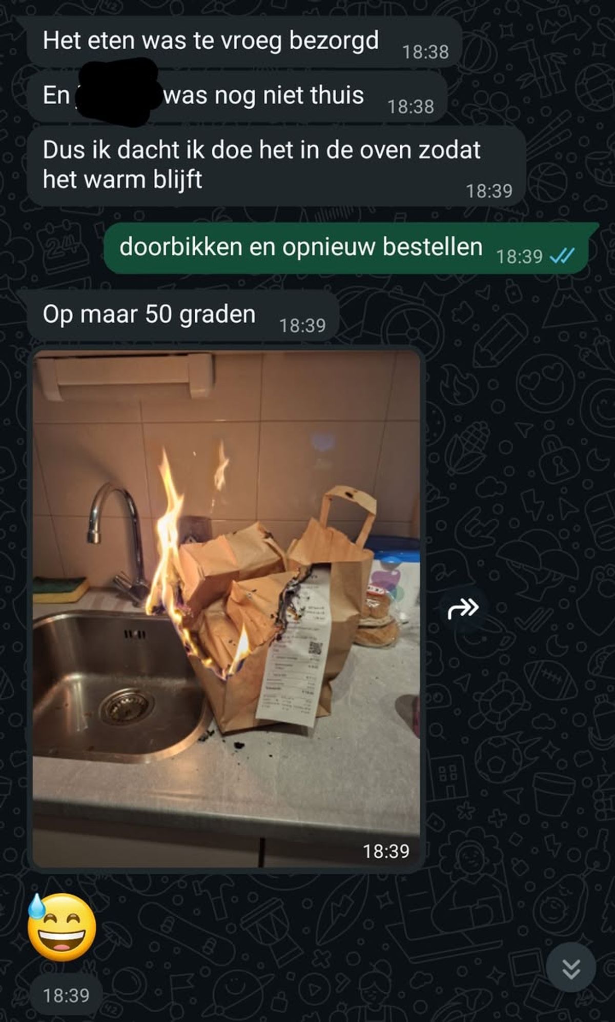 Volwassen man van bijna 40 probeert zijn bestelling van de friettent in papieren zak warm te houden in de oven en dan gebeurt er dit