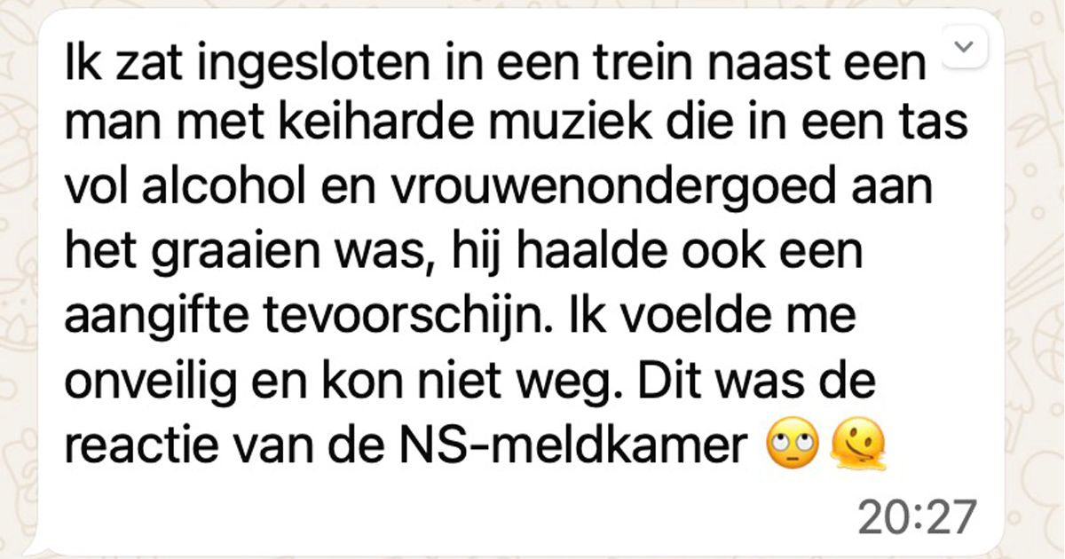 Vrouw zit ingesloten in een verder lege treincoupé naast een man met een tas vol alcohol en vrouwenondergoed die een aangifte tevoorschijn tovert en dit is de reactie van de NS-meldkamer