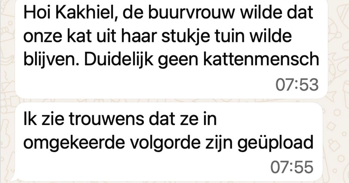 Hier een gezellig gesprek met een buurvrouw die allergisch is voor katten en ze niet in haar tuin wil hebben (3 screens)