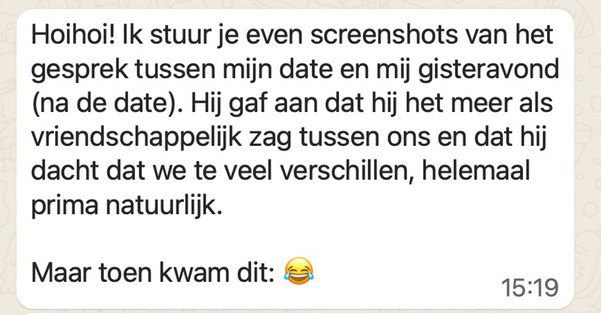 Dit is ook niet echt een normale opmerking om te krijgen na afloop van een date (3 screens)