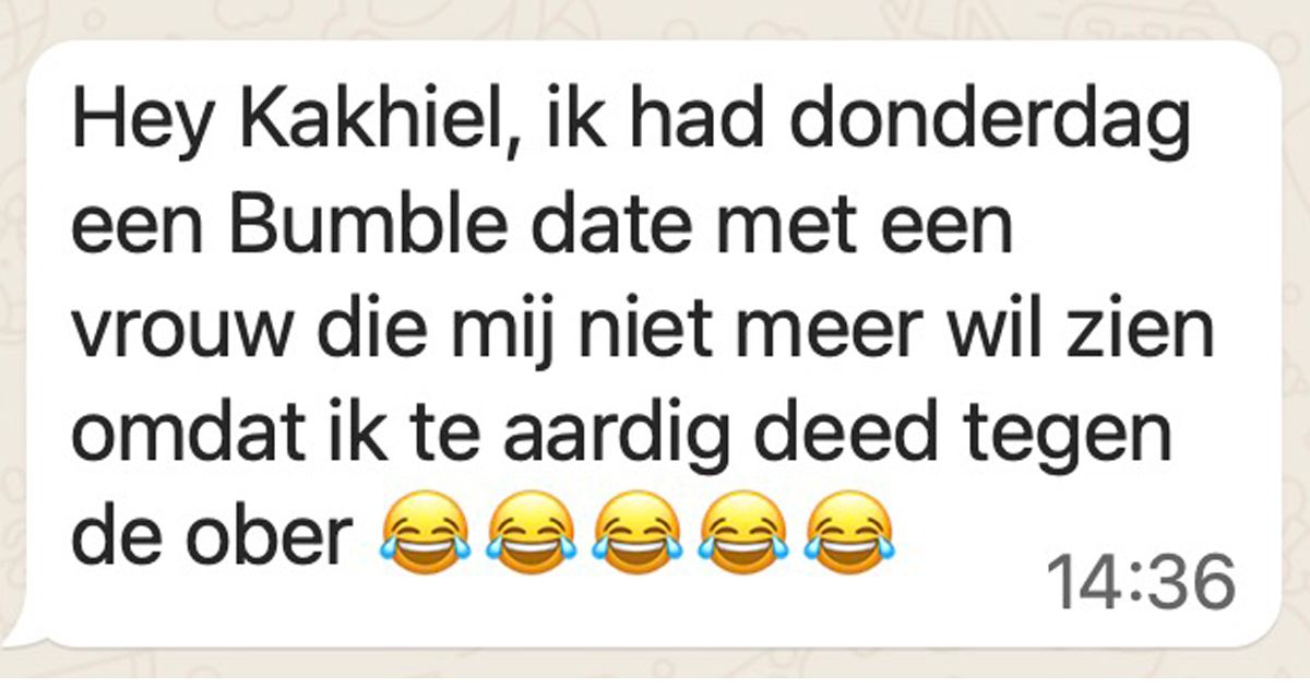 Bij deze ongeduldige Bumble-match moet je het niet in je hoofd halen om even een paar minuten je telefoon weg te leggen... (4 screens)