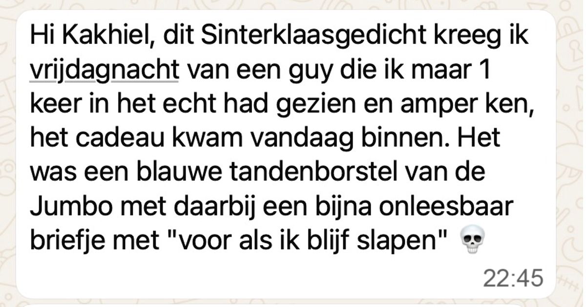 Meisje krijgt midden in de nacht een bizar Sinterklaasgedicht van een gast die ze amper kent en hij stuurt er ook nog een leuk cadeautje bij, voor zichzelf... (4 screens)