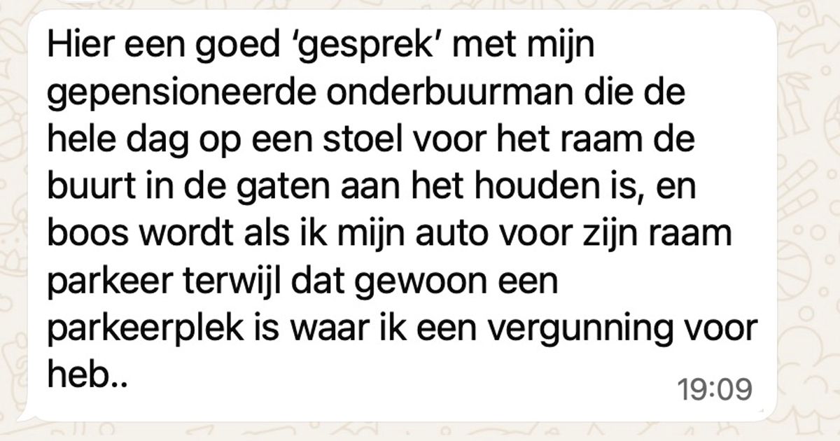 Buurman is boos omdat er een auto voor zijn raam staat die zijn uitzicht belemmerd dus besluit hij even contact op te nemen met de eigenaar (4 screens)